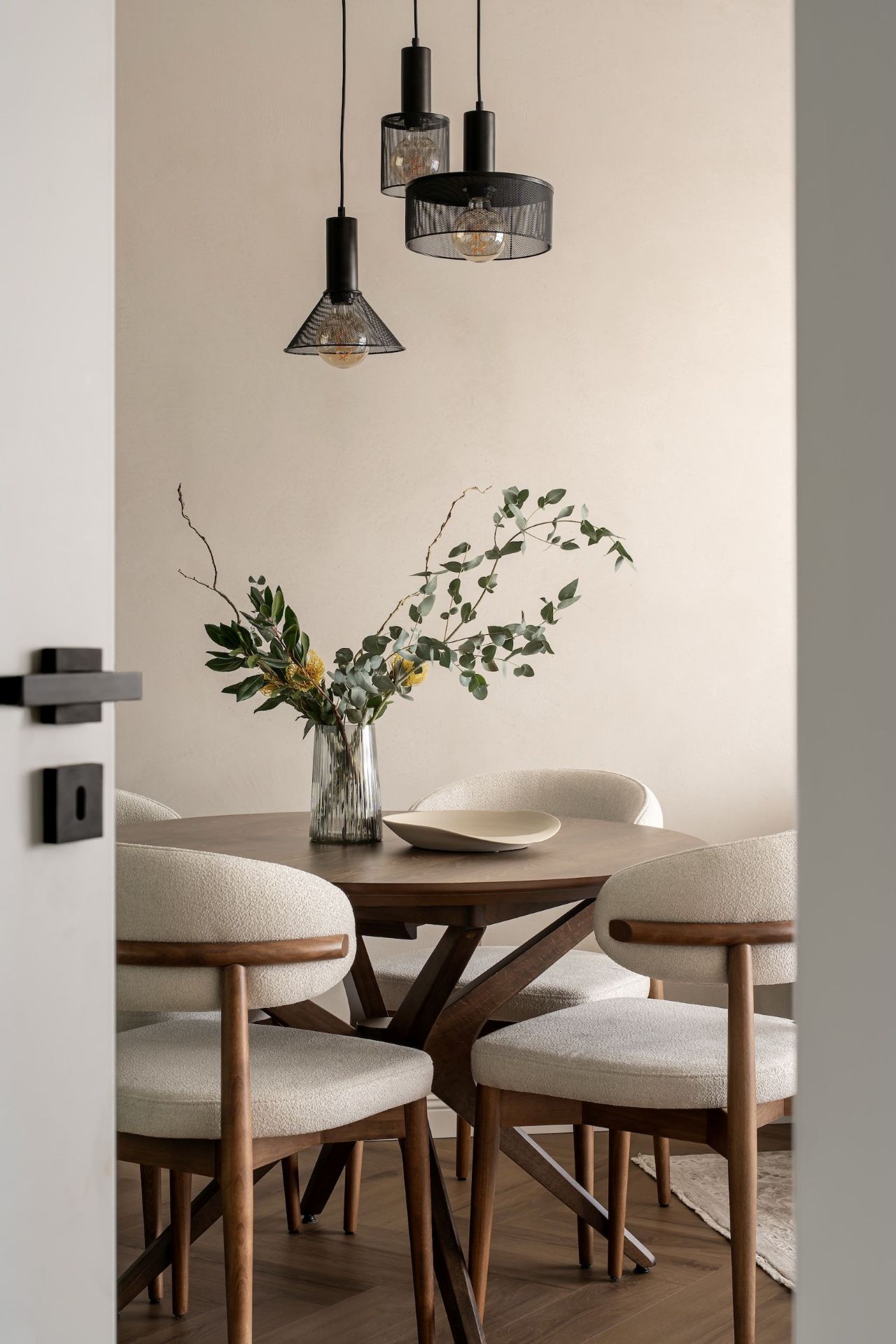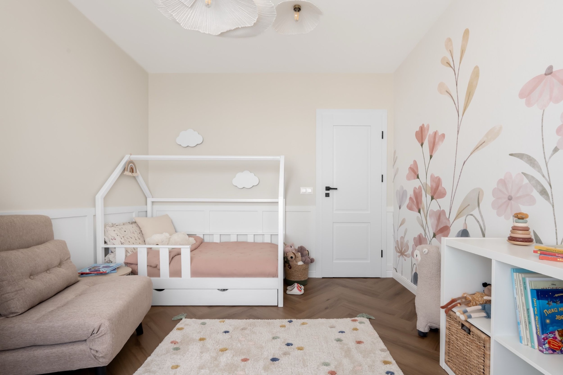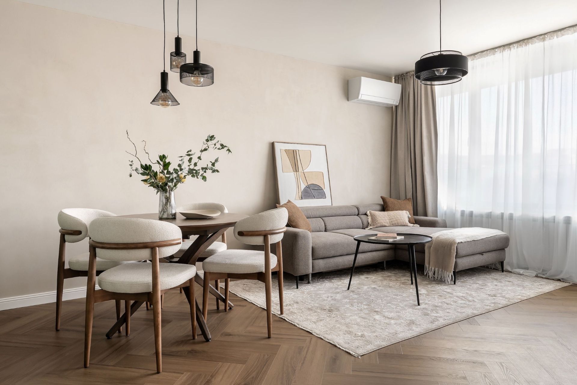 Интериорът комбинира съвременни решения с дискретни препратки към по-класически форми - таблени вратички на мебелите, плочки с орнаменти и внимателно подбрани детайли, използвани с мярка. Пространствата са ясно организирани, без рязко зониране, което позволява естествено преминаване между функциите и усещане за цялост.