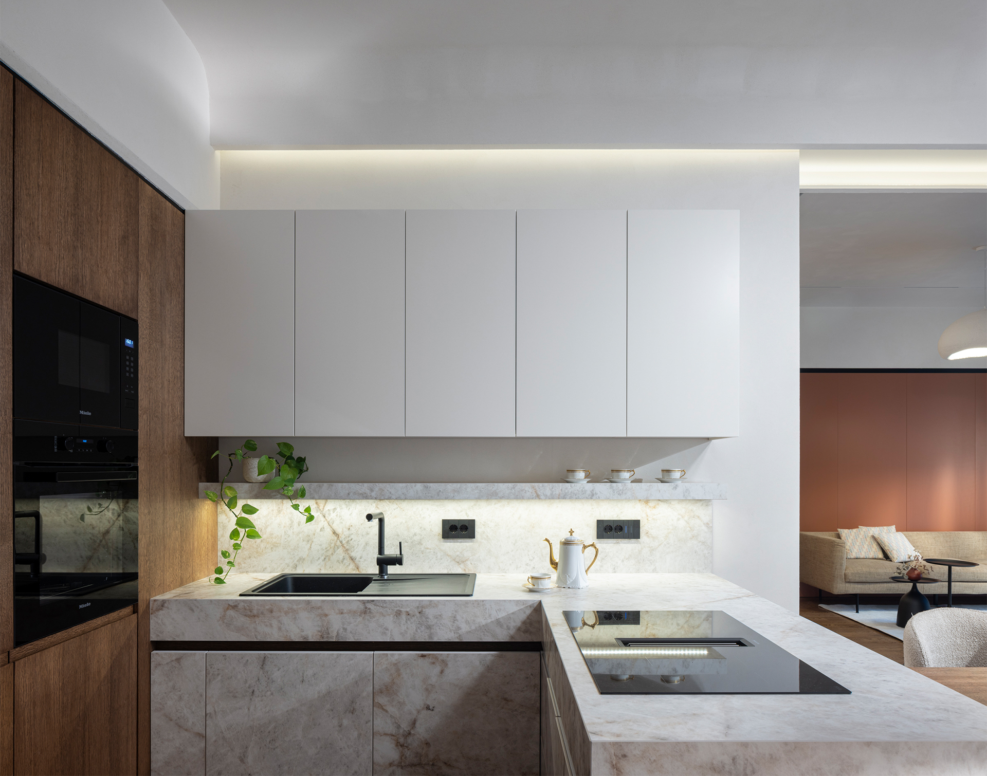 The full height of the space is utilized through floor-to-ceiling storage, accessed by a movable ladder on a rail system. A suspended ceiling defines a smooth transition between the kitchen and living area, extending partially onto the walls and forming a clear architectural gesture, continued in the kitchen design.