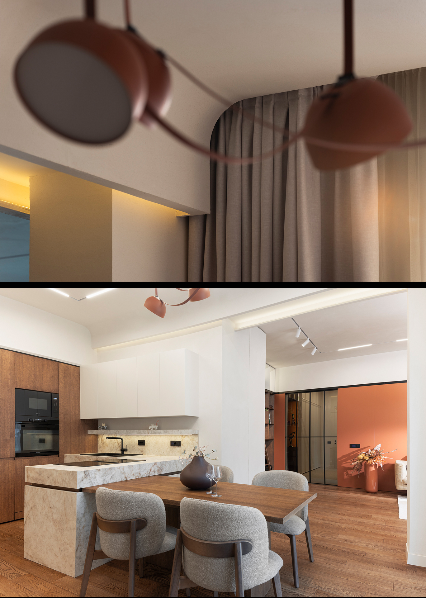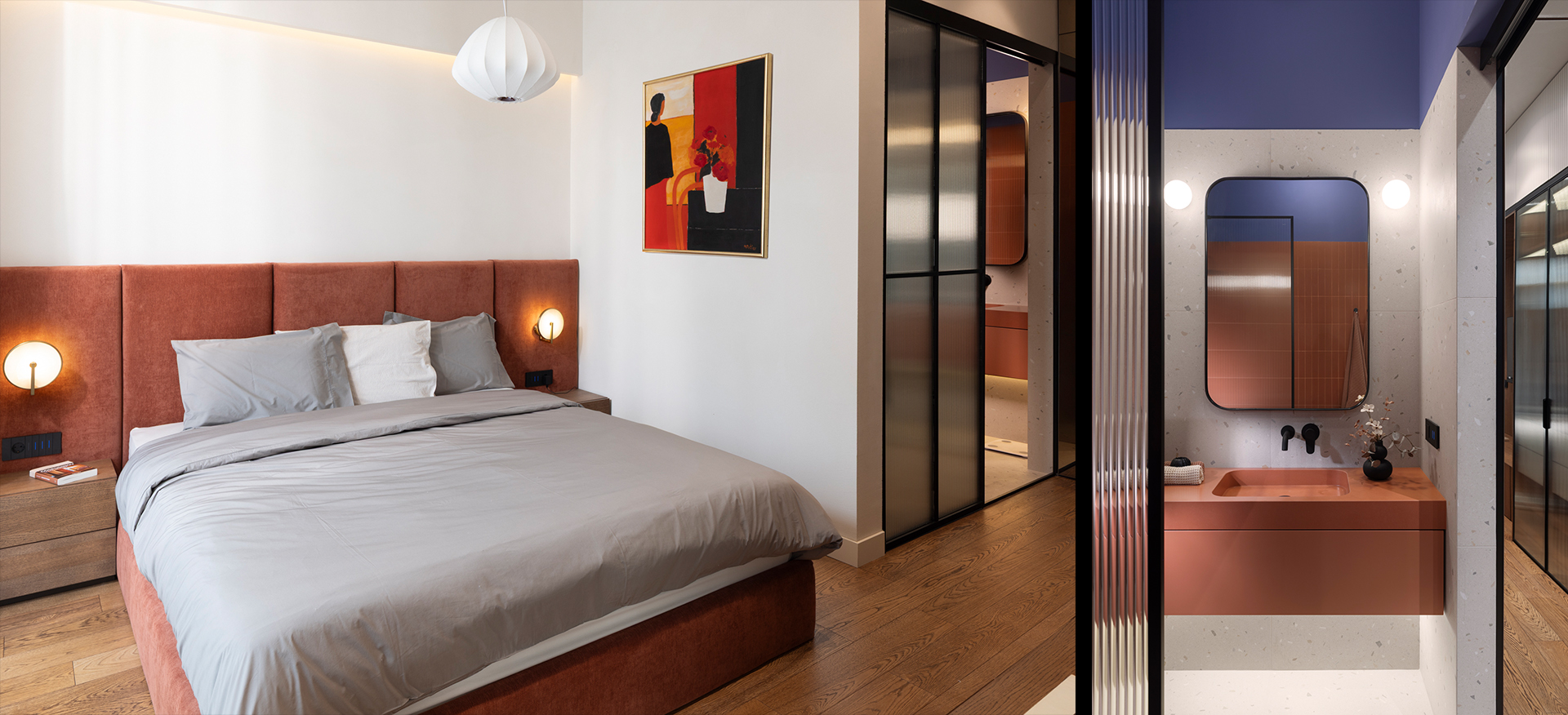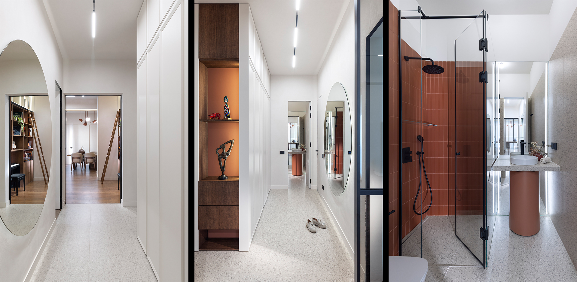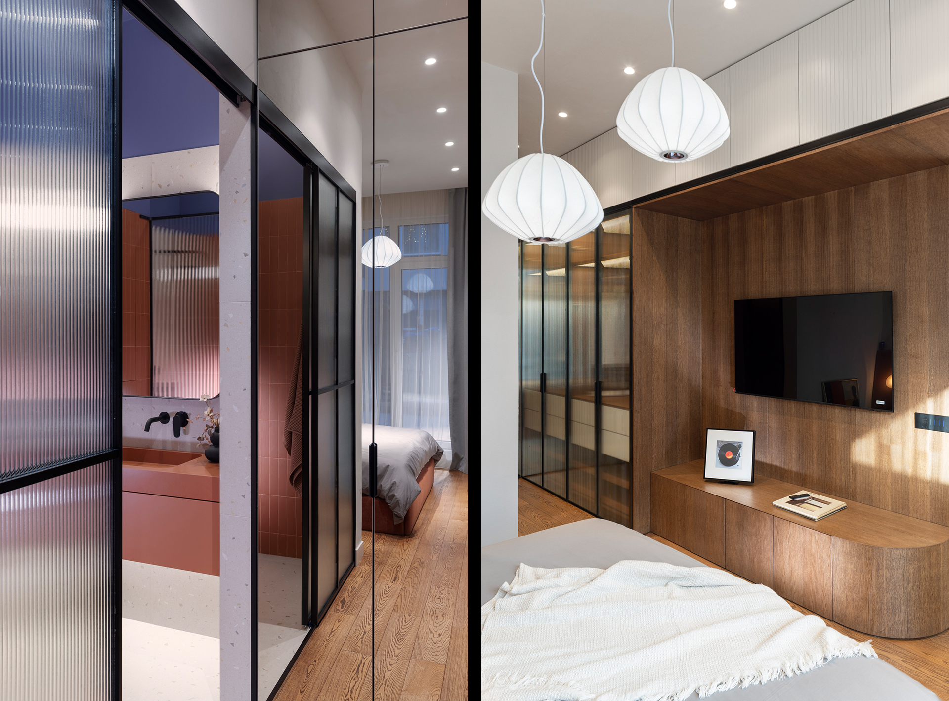 The master bedroom and bathroom follow the same material and color palette. The wardrobe and kitchen access are combined into a single built-in element with an integrated seating niche. In the bathrooms, color accents, small-format tiles, and fluted glass emphasize volume and height, creating a warm and intimate atmosphere. The second bathroom features a custom vanity with rounded geometry, enhancing the verticality of the full-height mirror and the sense of openness.
