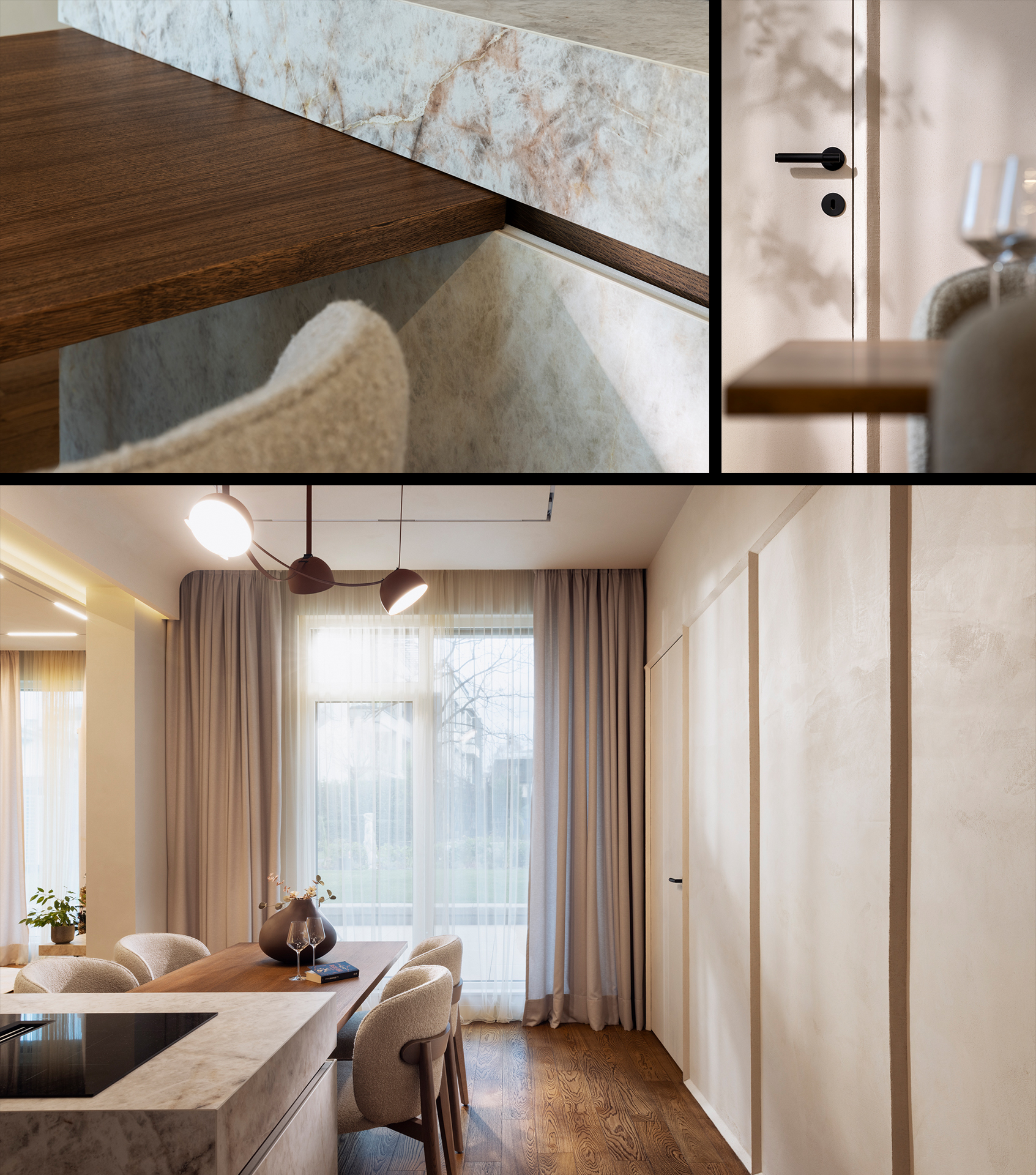 В дъното на двете помещения е разположен дървен висок обем с врати, прибиращи се в корпуса, осигуряващи място за малки електроуреди и хладилна витрина за вино. Трапезната маса е интегрирана в кухненския обем и може да се отделя и пренарежда при необходимост от повече места.