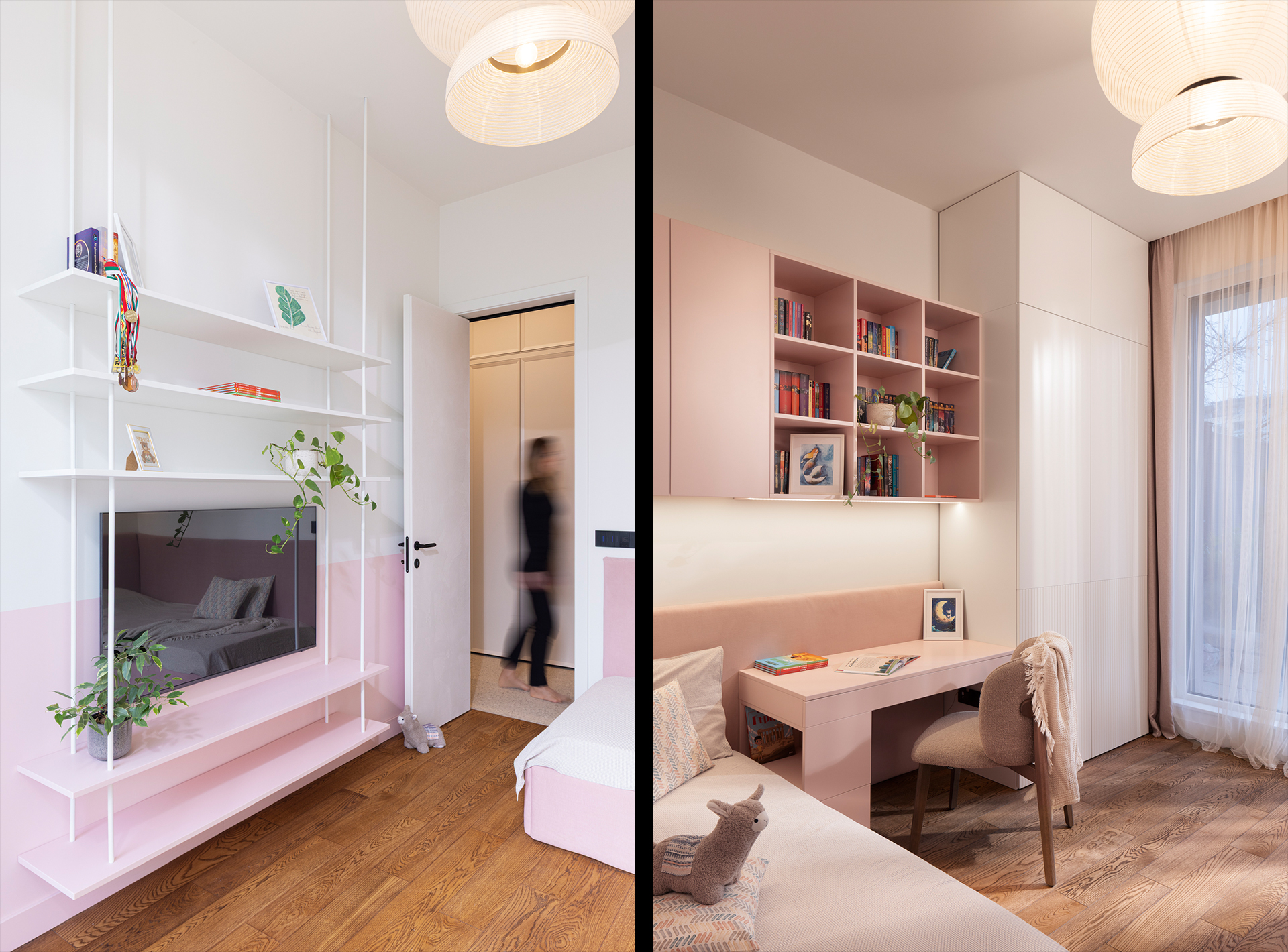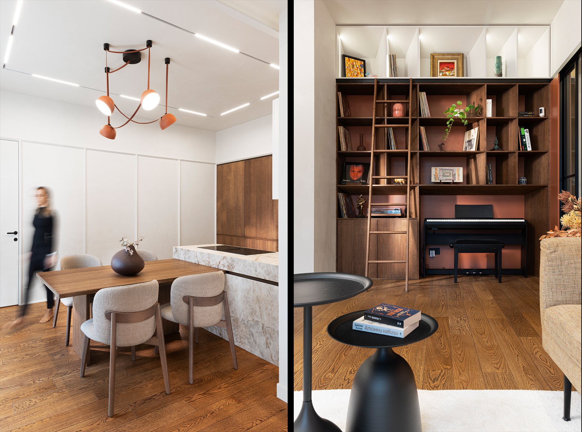 We present a residential interior with a strong architectural character, expressed through balanced color accents and refined detailing. The uniform ceiling height of 3.25 m guided a horizontal articulation of the spaces, reducing visual mass and enhancing spatial clarity. A key requirement was the inclusion of a creative zone, which shaped the living area around a custom library with integrated space for a piano, vinyl records, and a turntable.