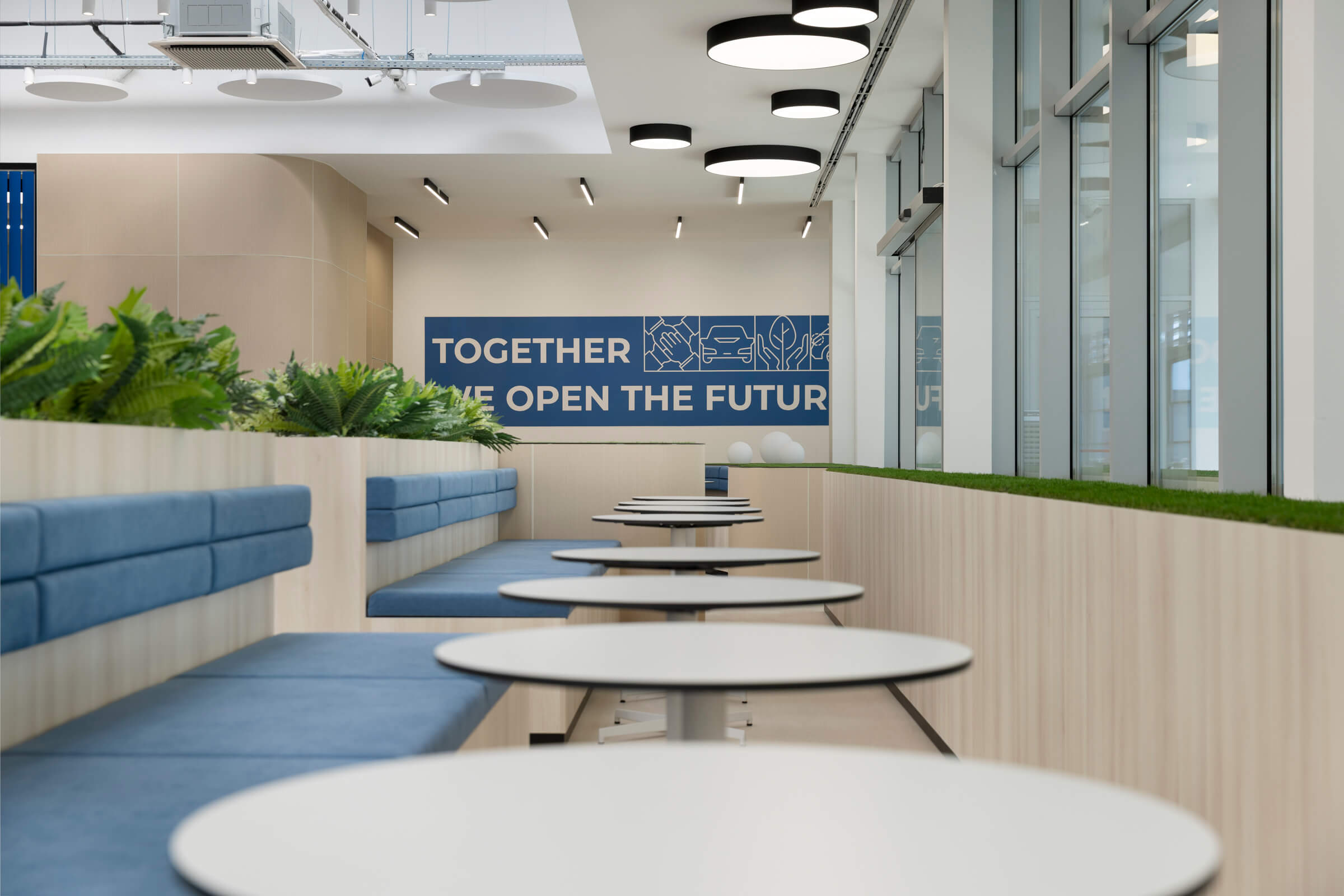 As part of the larger WITTE Automotive Bulgaria office project, the new canteen and relaxation zone was conceived as a spacious, light-filled environment supporting both well-being and interaction. Following a change in the factory’s policy—from multiple small canteens to one shared 1,800 m² hall—the design embraces openness and flexibility to encourage social connection and a sense of community.