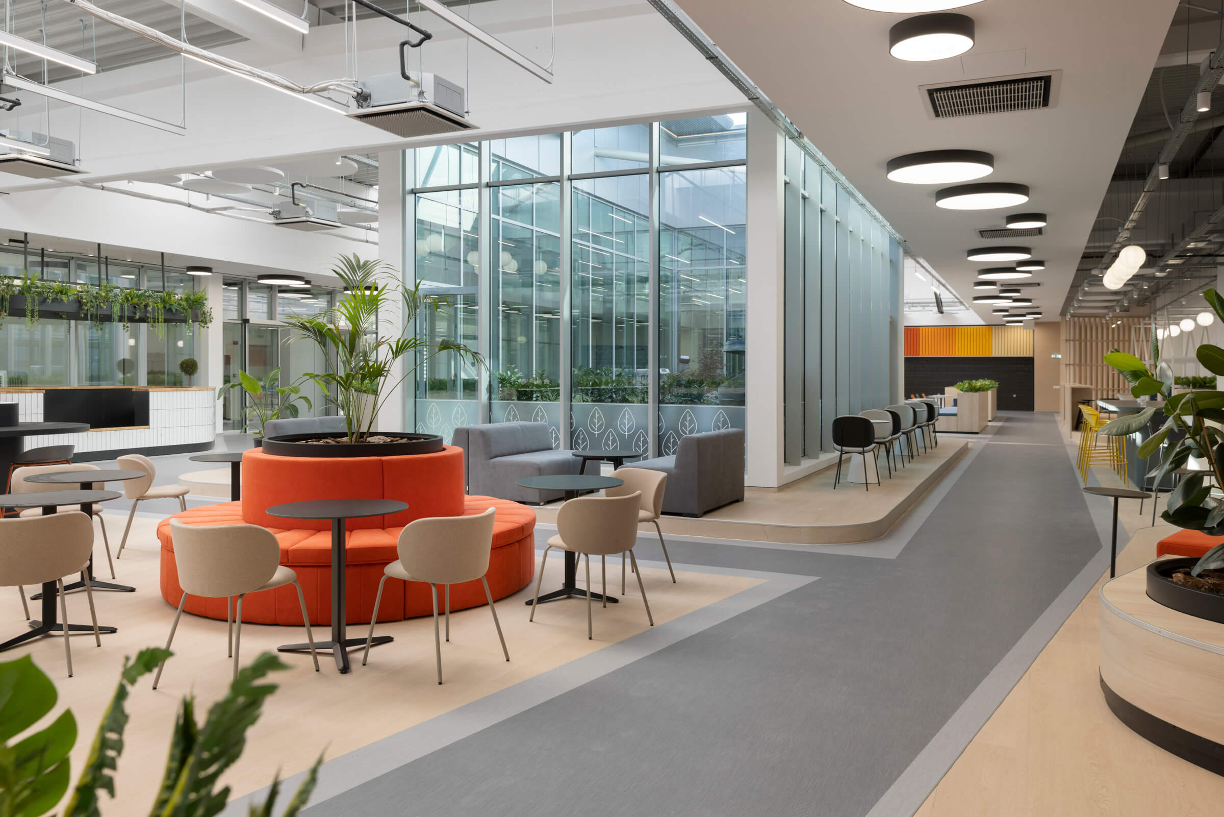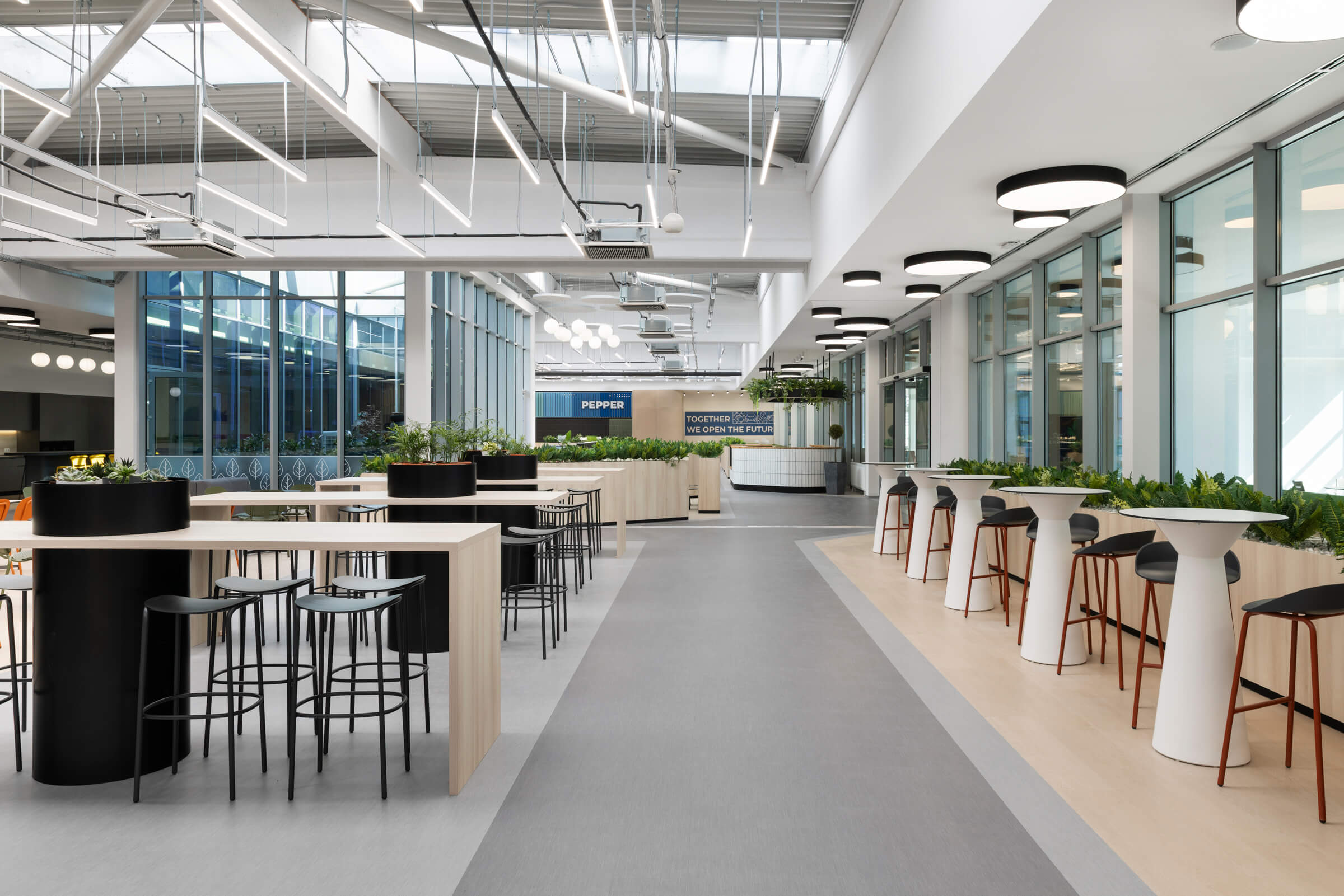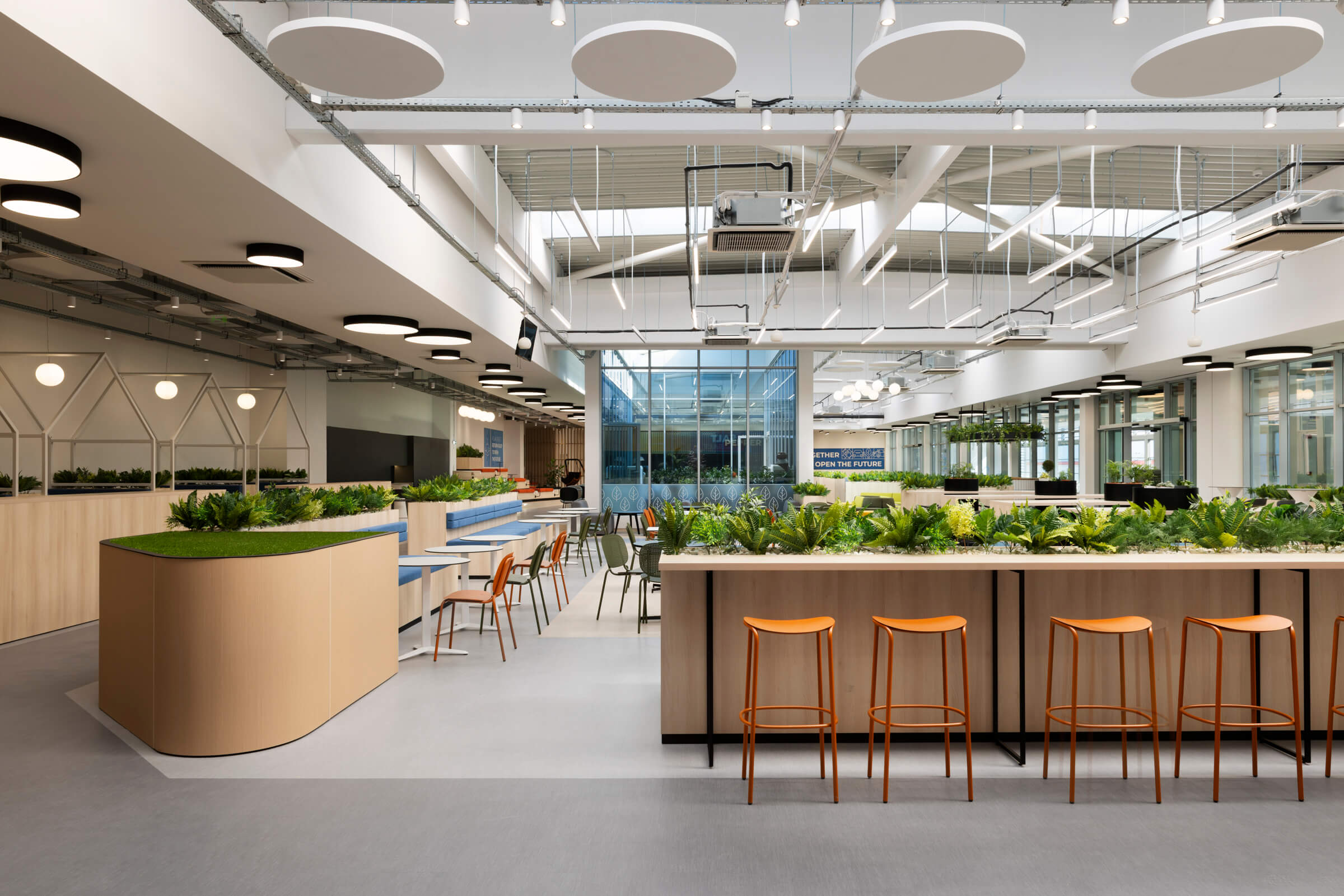 The result is a multifunctional interior that balances scale with comfort, openness with intimacy, and functionality with the human experience — a contemporary interpretation of the workplace canteen as a social and restorative core of the company.
