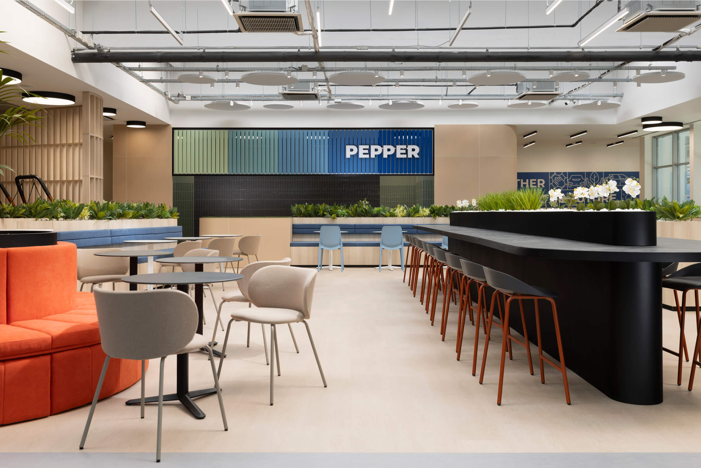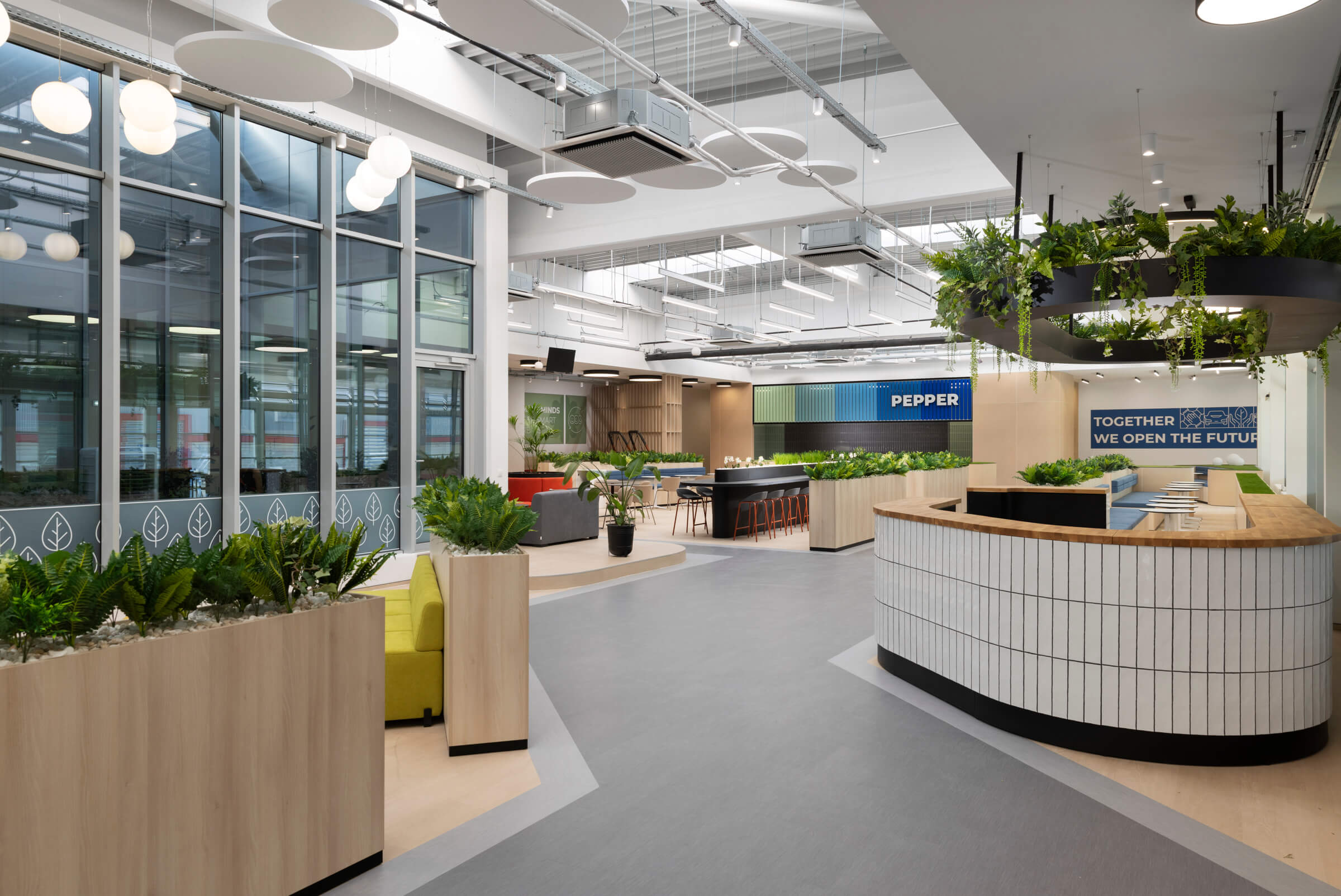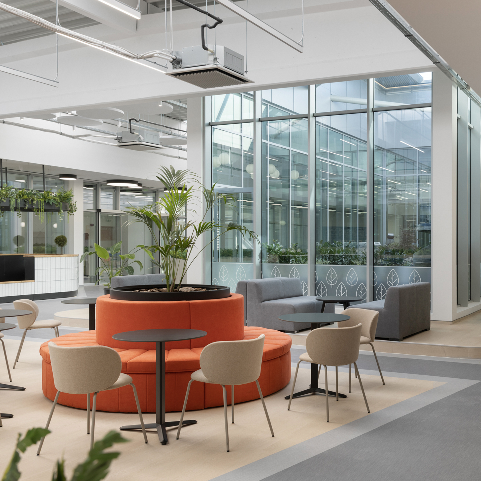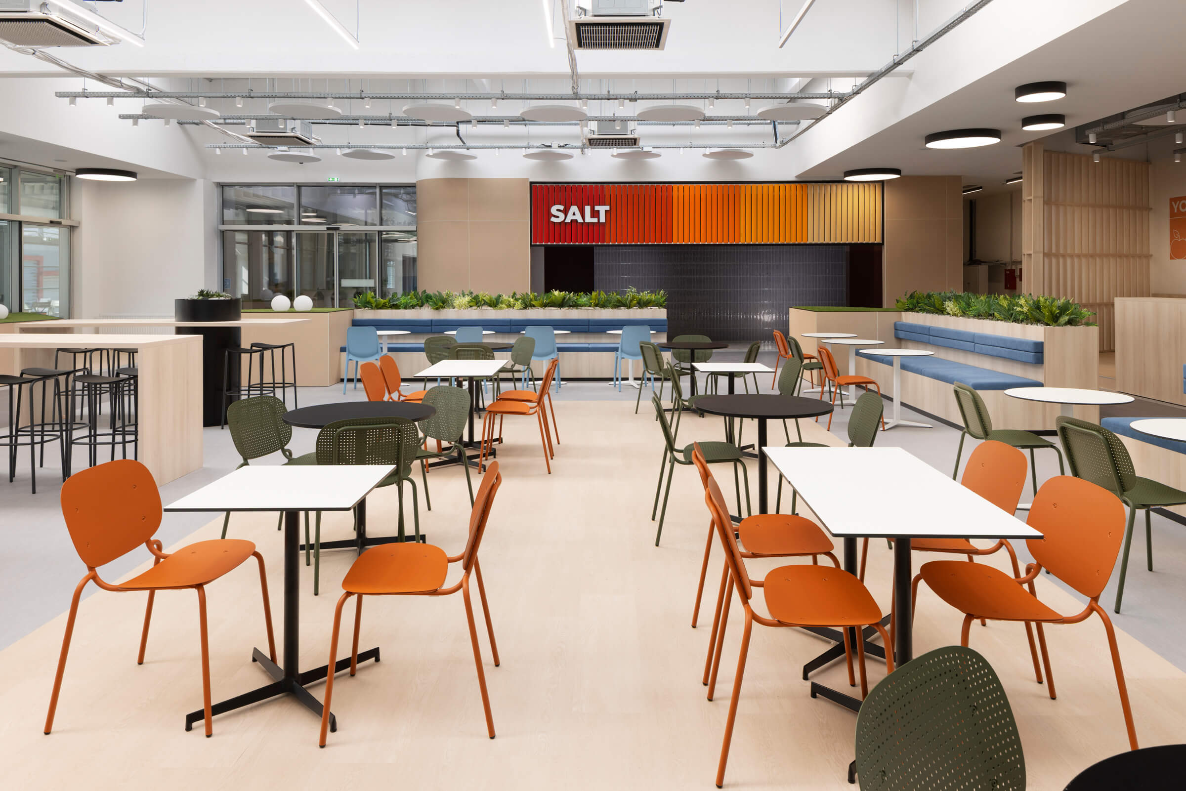 The result is a multifunctional interior that balances scale with comfort, openness with intimacy, and functionality with the human experience — a contemporary interpretation of the workplace canteen as a social and restorative core of the company.
