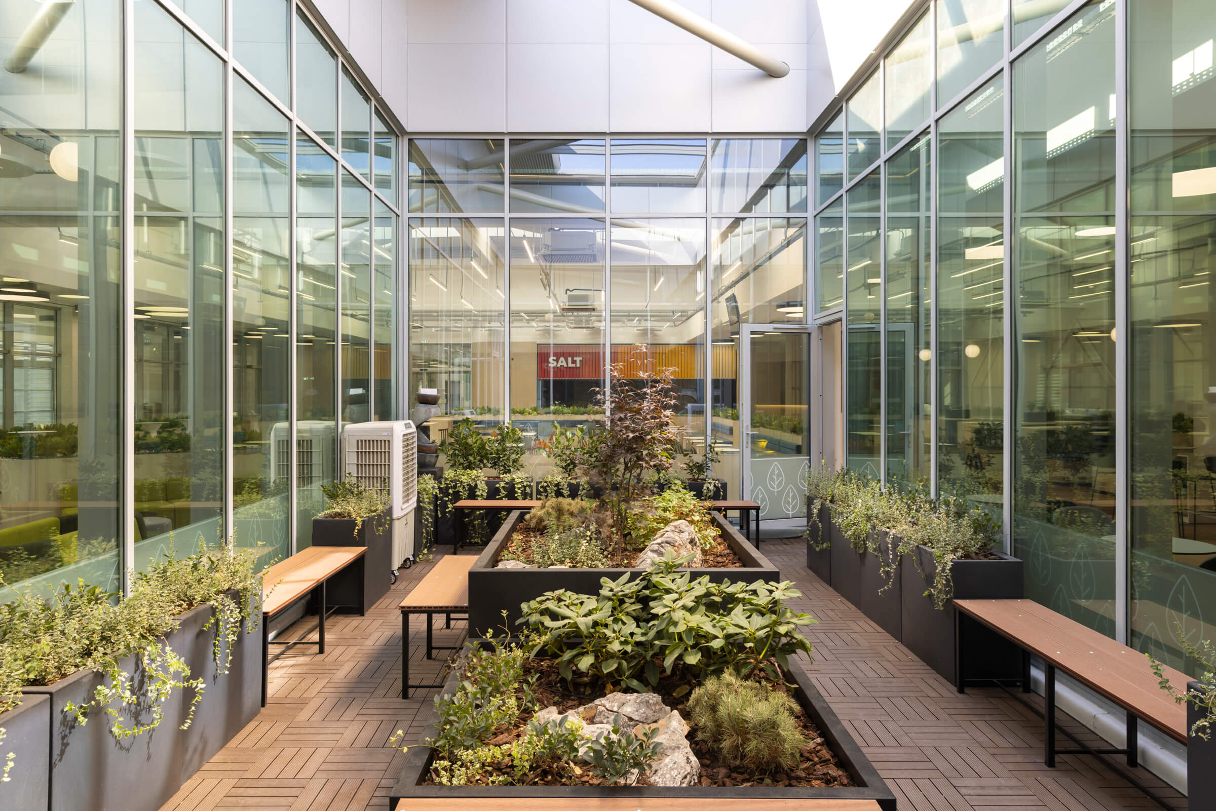 The heart of the space is a central inner garden, open to the sky and filled with greenery, acting as a natural anchor and visual pause within the dynamic flow of activity. Around it, a variety of seating zones are organized — from intimate lounge corners to communal tables — each defined by distinct height, atmosphere, and materiality. This diversity allows users to intuitively choose their preferred setting, whether for dining, informal meetings, or quiet relaxation.
