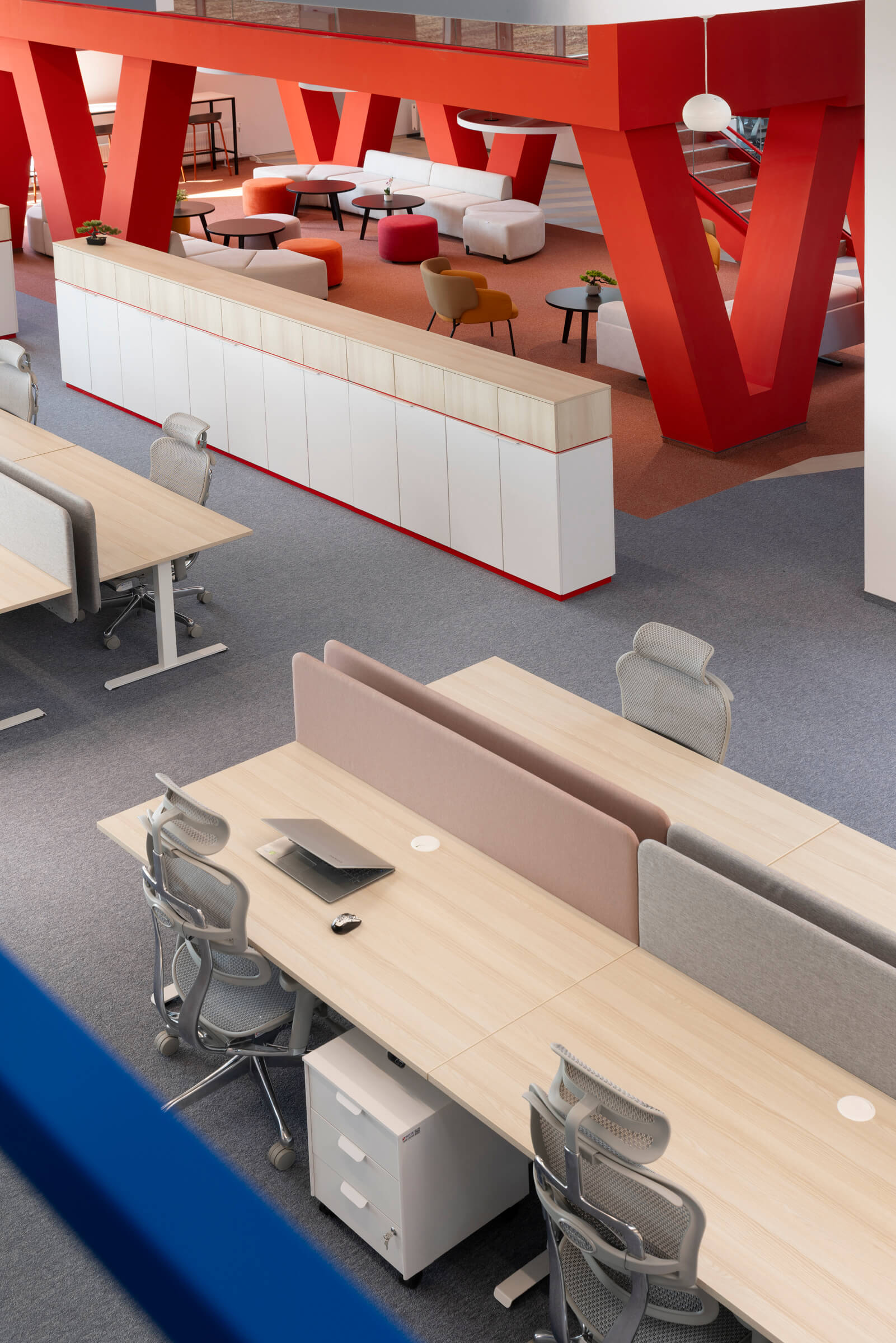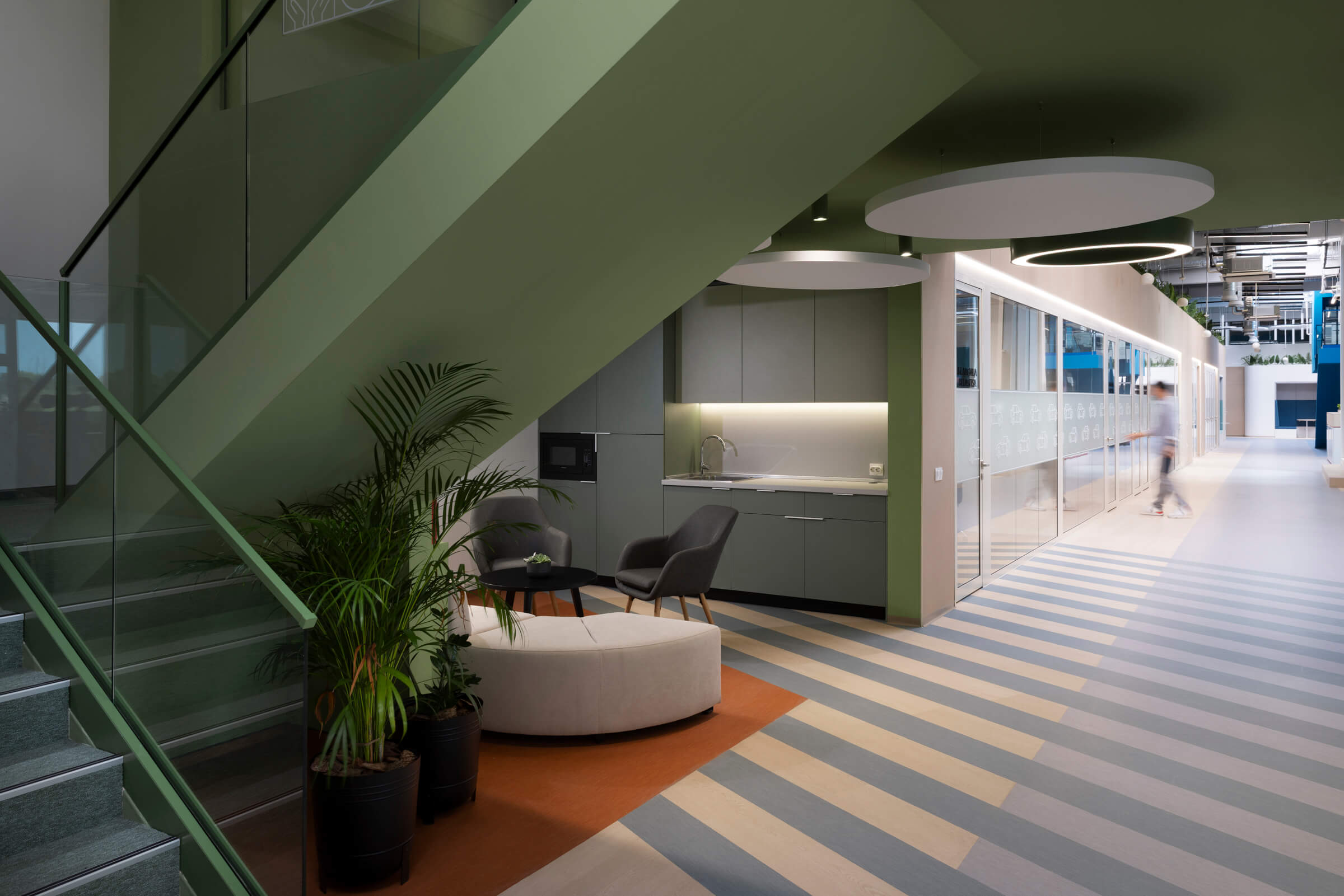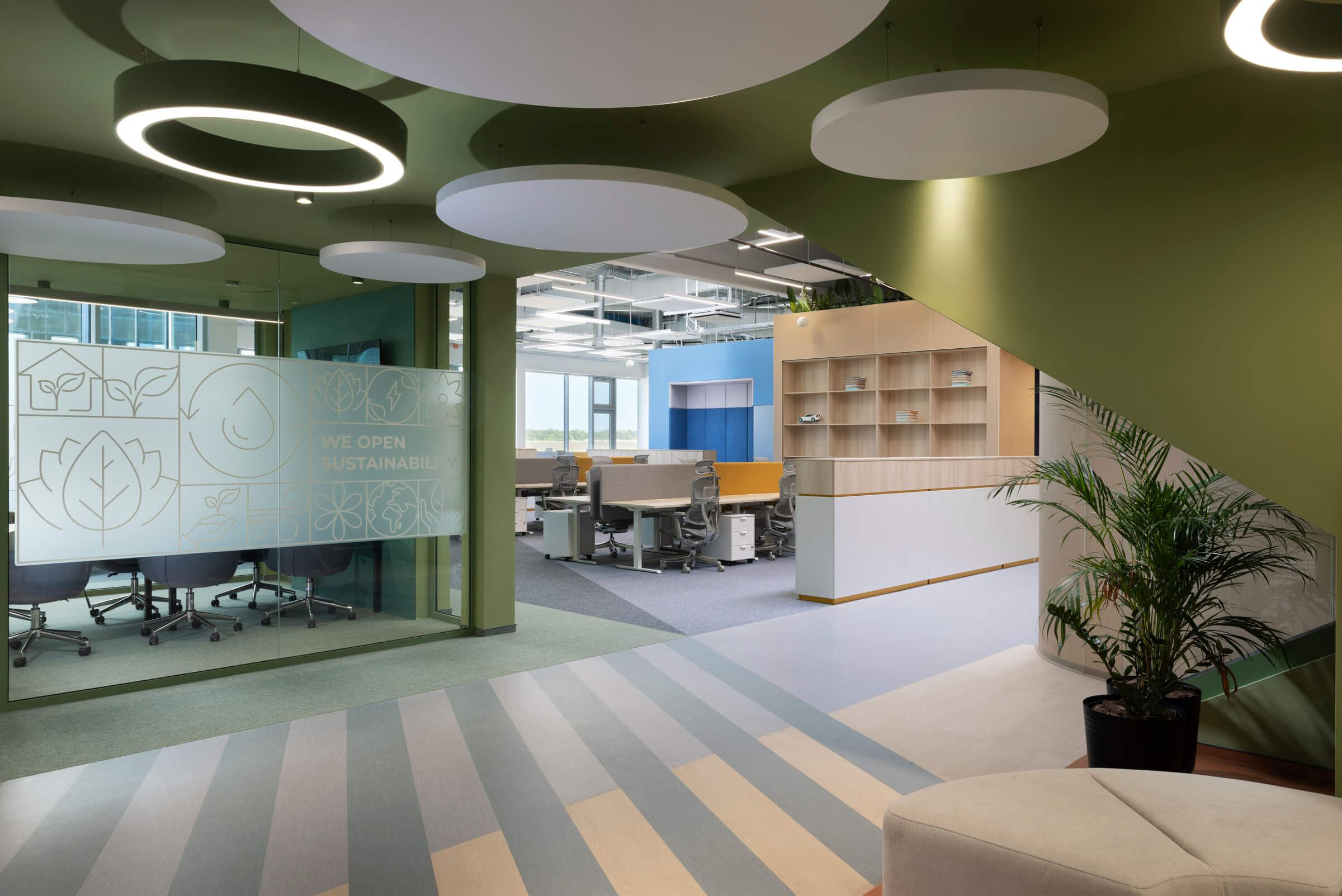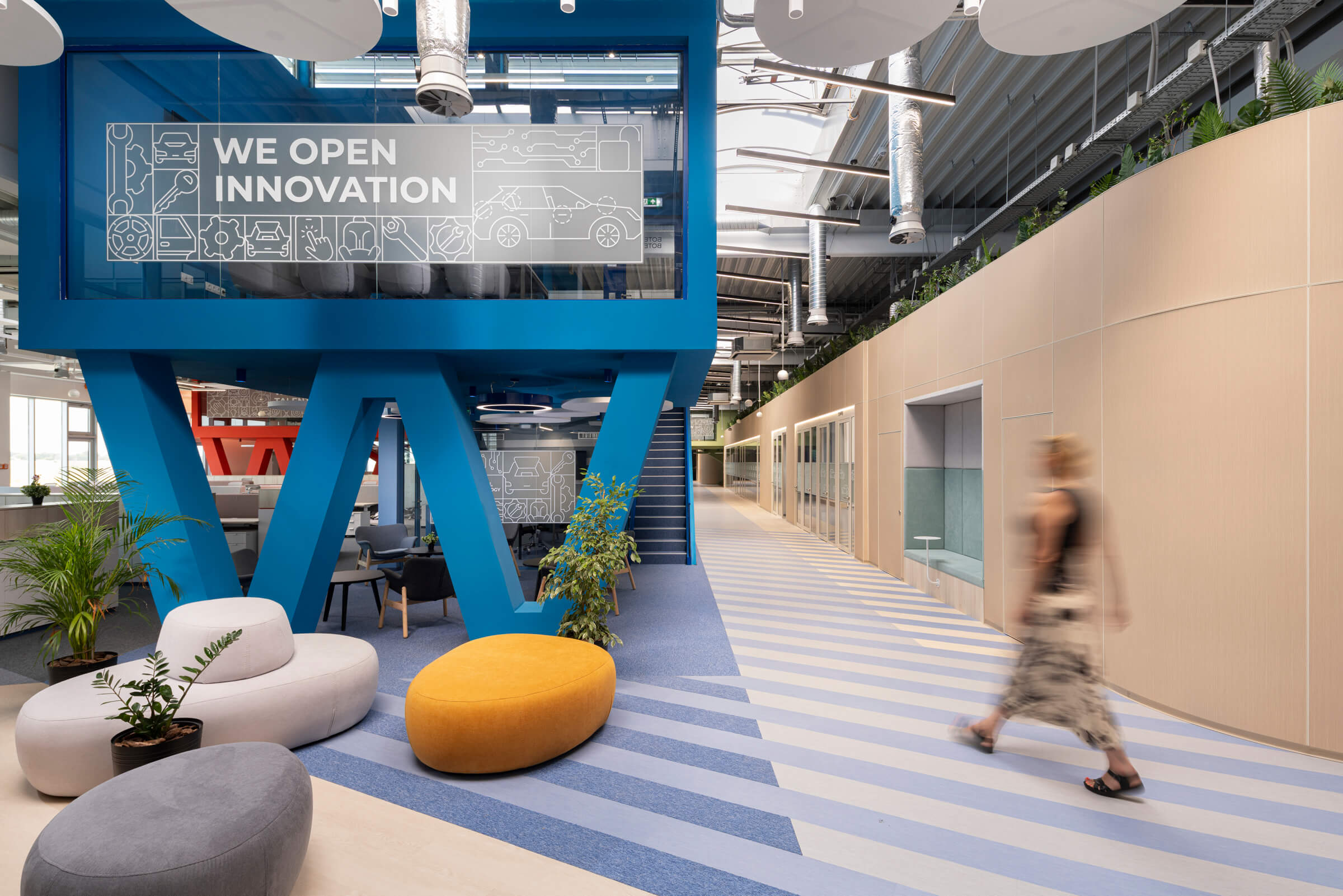 Each volume is designed to reflect one of WITTE’s core values — technology, people, and environment — through its form, color, and spatial experience. By integrating these brand valuess, the office is transformed from a purely functional workspace into an environment that inspires creativity, engagement, and a sense of belonging. Inside the office, three inner gardens open to the sky bring natural light deep into the space and introduce greenery, enhancing wellbeing and creating a strong connection to nature.