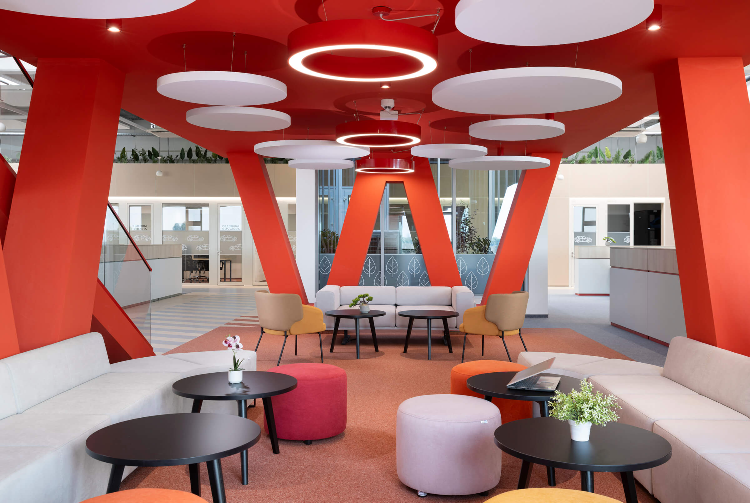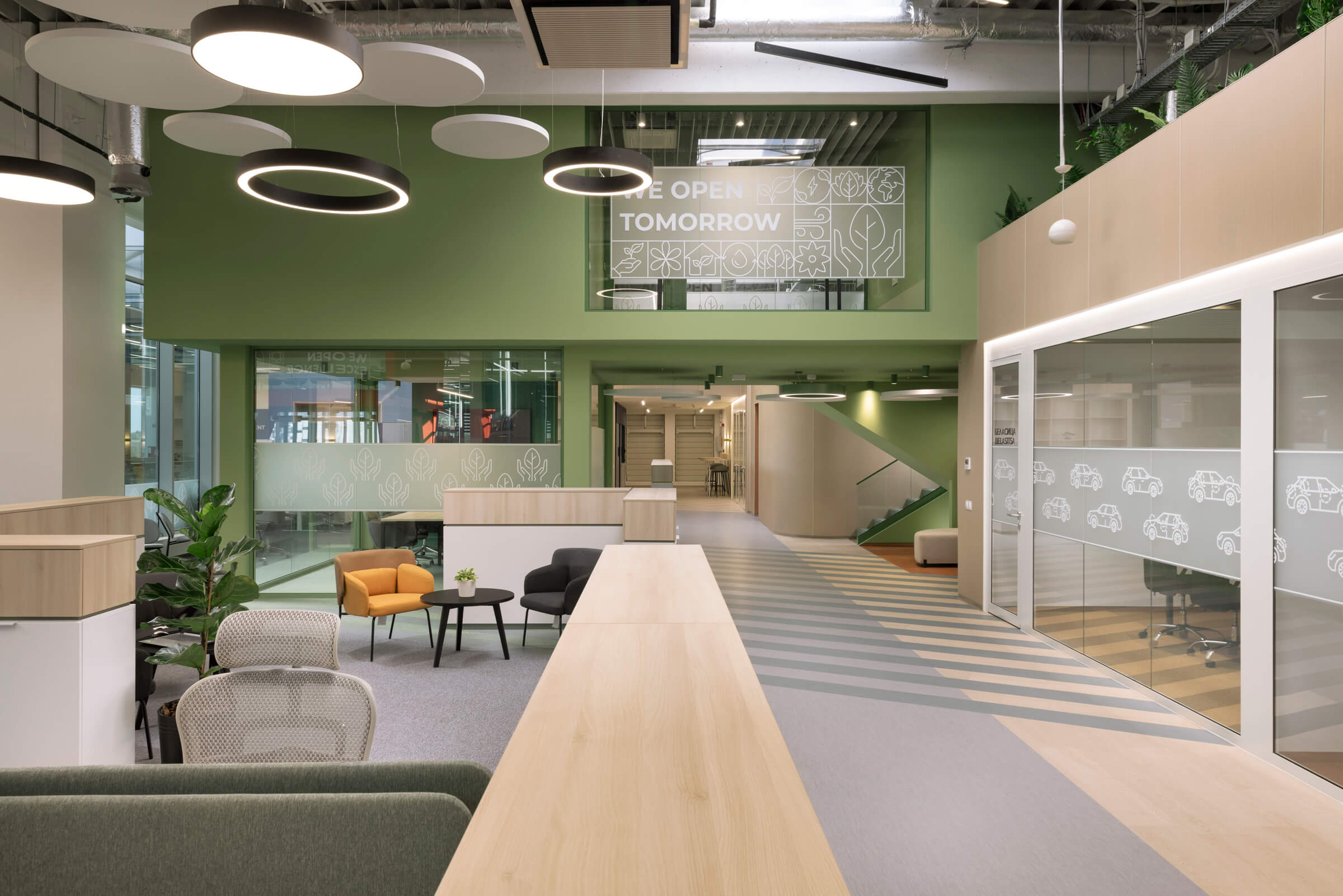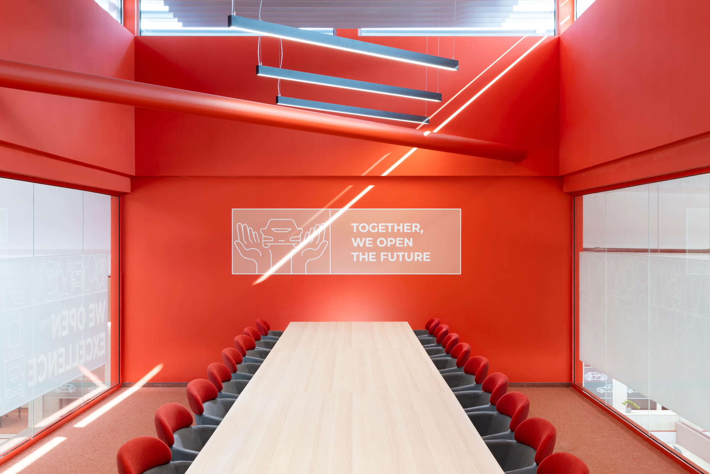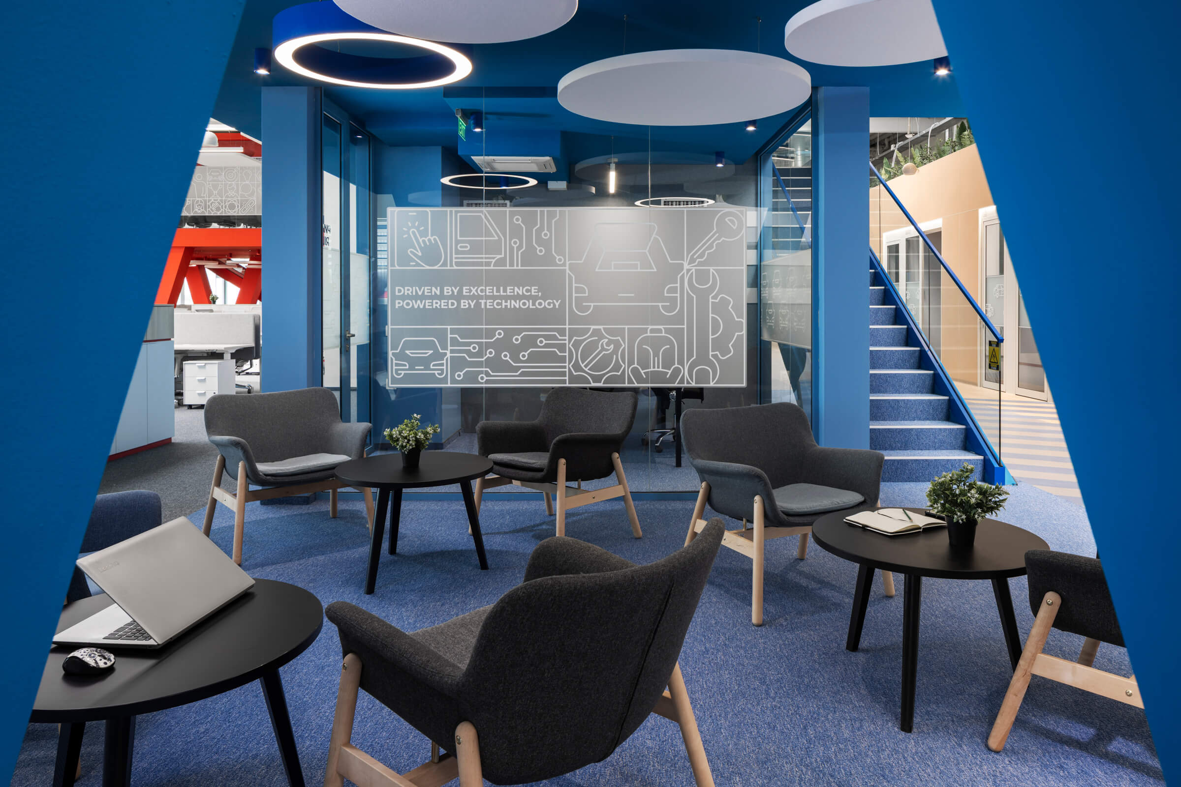 Our interior design project for WITTE Automotive Bulgaria reimagines the company’s new office in Ruse as a workspace where innovation, collaboration, and corporate identity converge. As a German leader in automotive locking systems, WITTE required an environment that is both dynamic and highly efficient, reflecting its forward-thinking culture. The existing 6-meter-high industrial hall presented a rare architectural opportunity: the creation of three double-height volumes within an open-plan layout, introducing spatial hierarchy, depth, and optimized functionality.