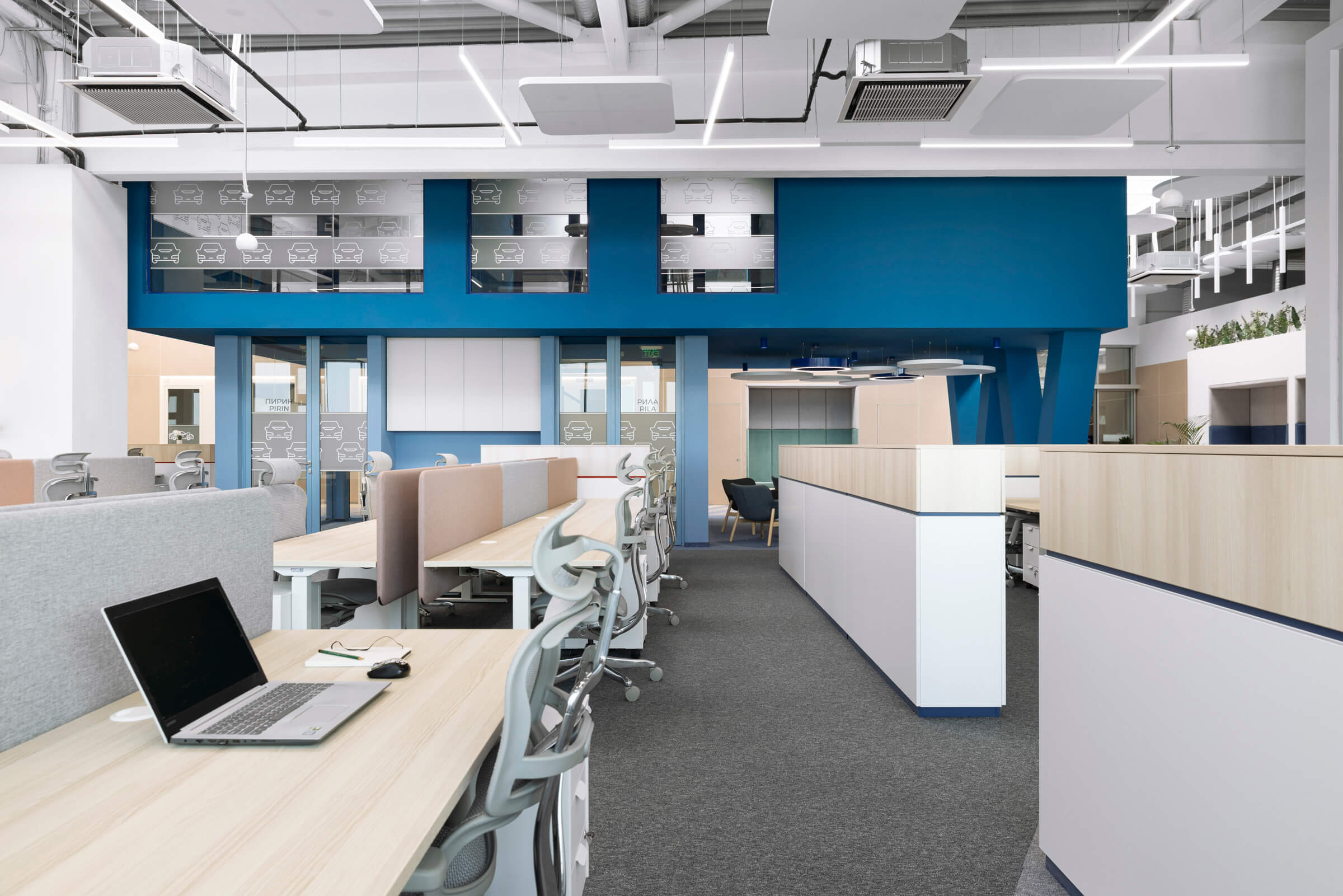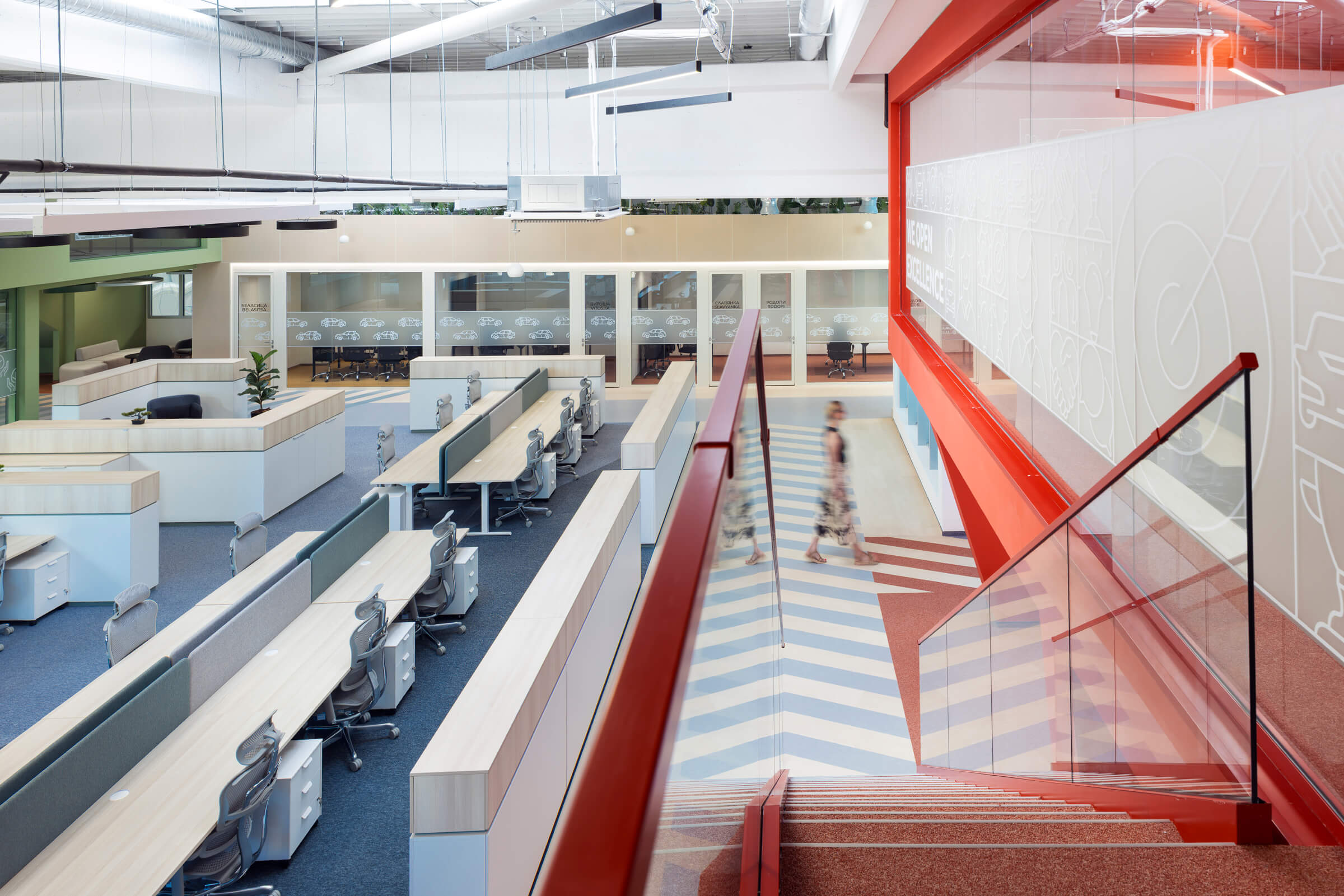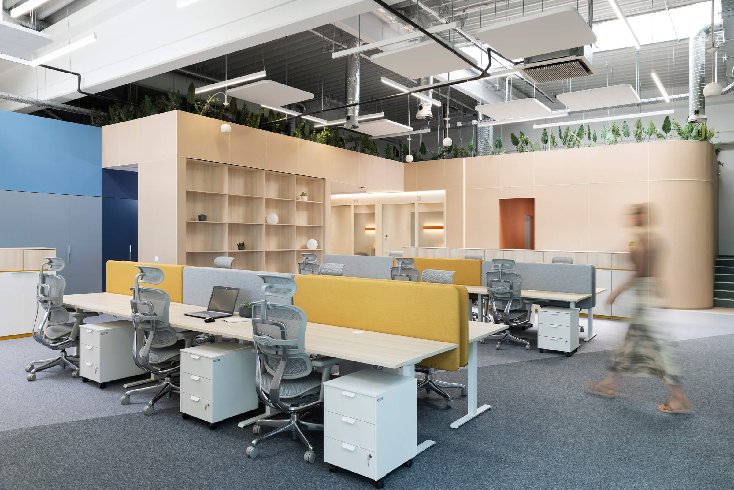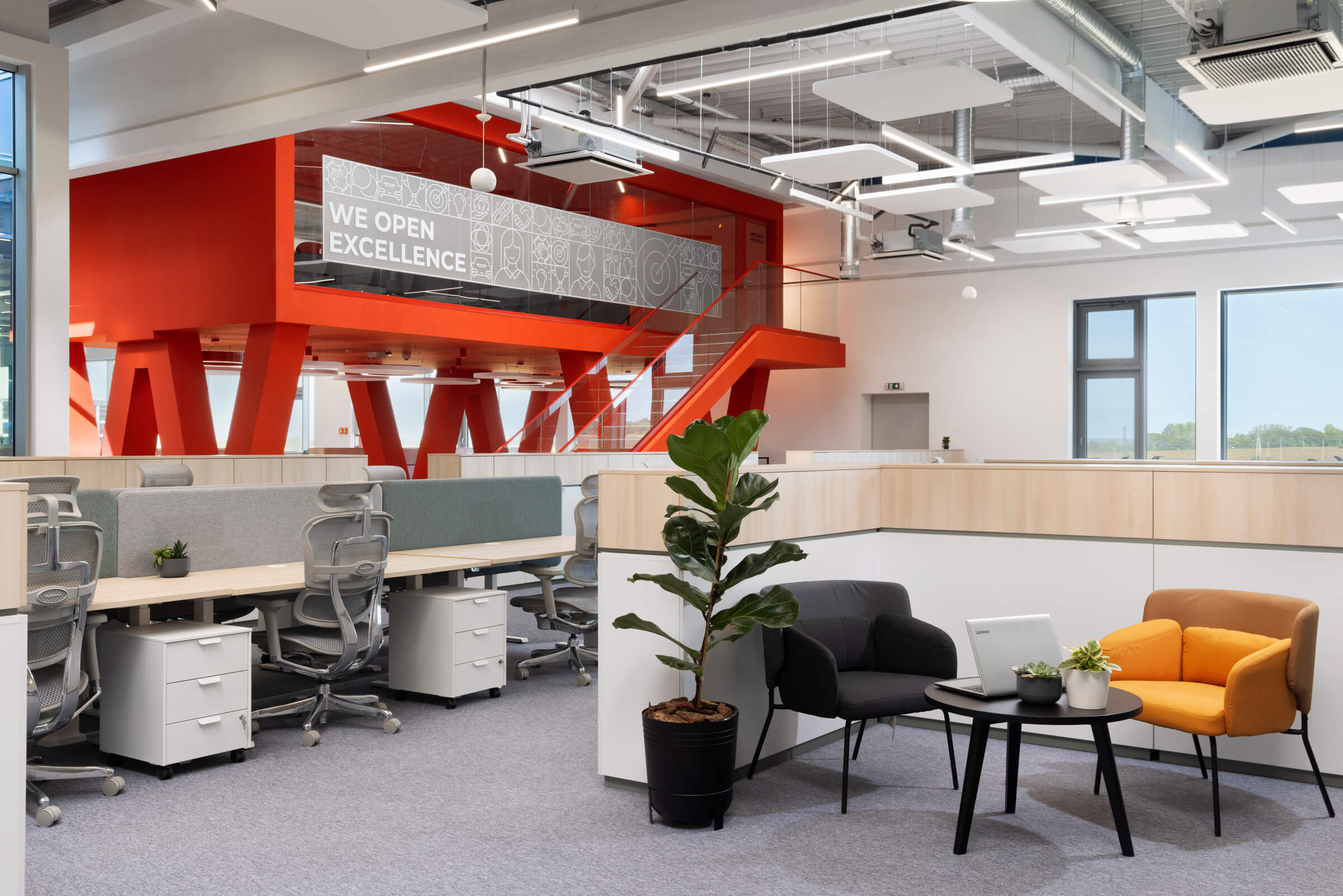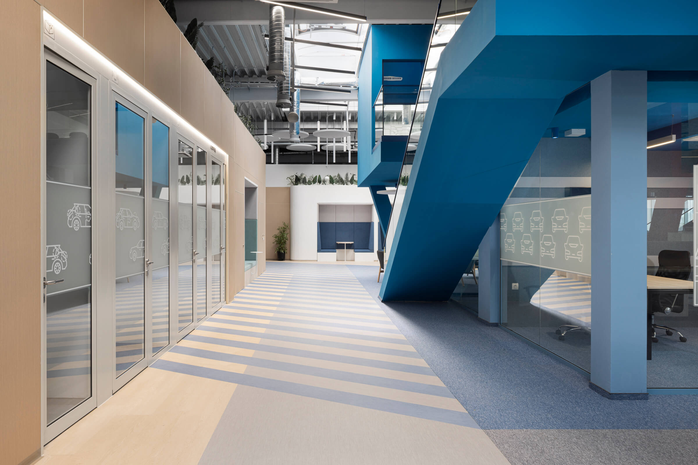 Our interior design project for WITTE Automotive Bulgaria reimagines the company’s new office in Ruse as a workspace where innovation, collaboration, and corporate identity converge. As a German leader in automotive locking systems, WITTE required an environment that is both dynamic and highly efficient, reflecting its forward-thinking culture. The existing 6-meter-high industrial hall presented a rare architectural opportunity: the creation of three double-height volumes within an open-plan layout, introducing spatial hierarchy, depth, and optimized functionality.