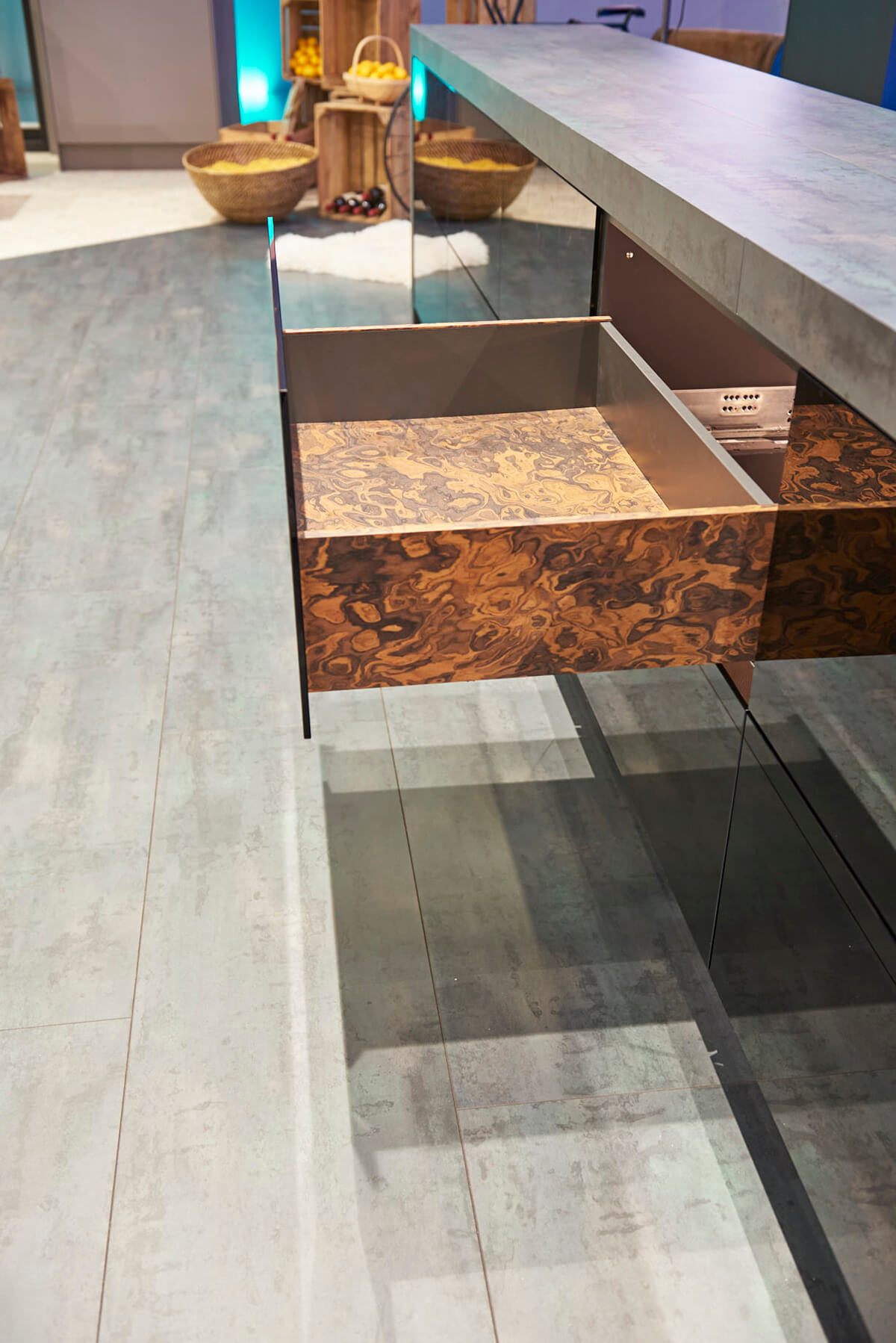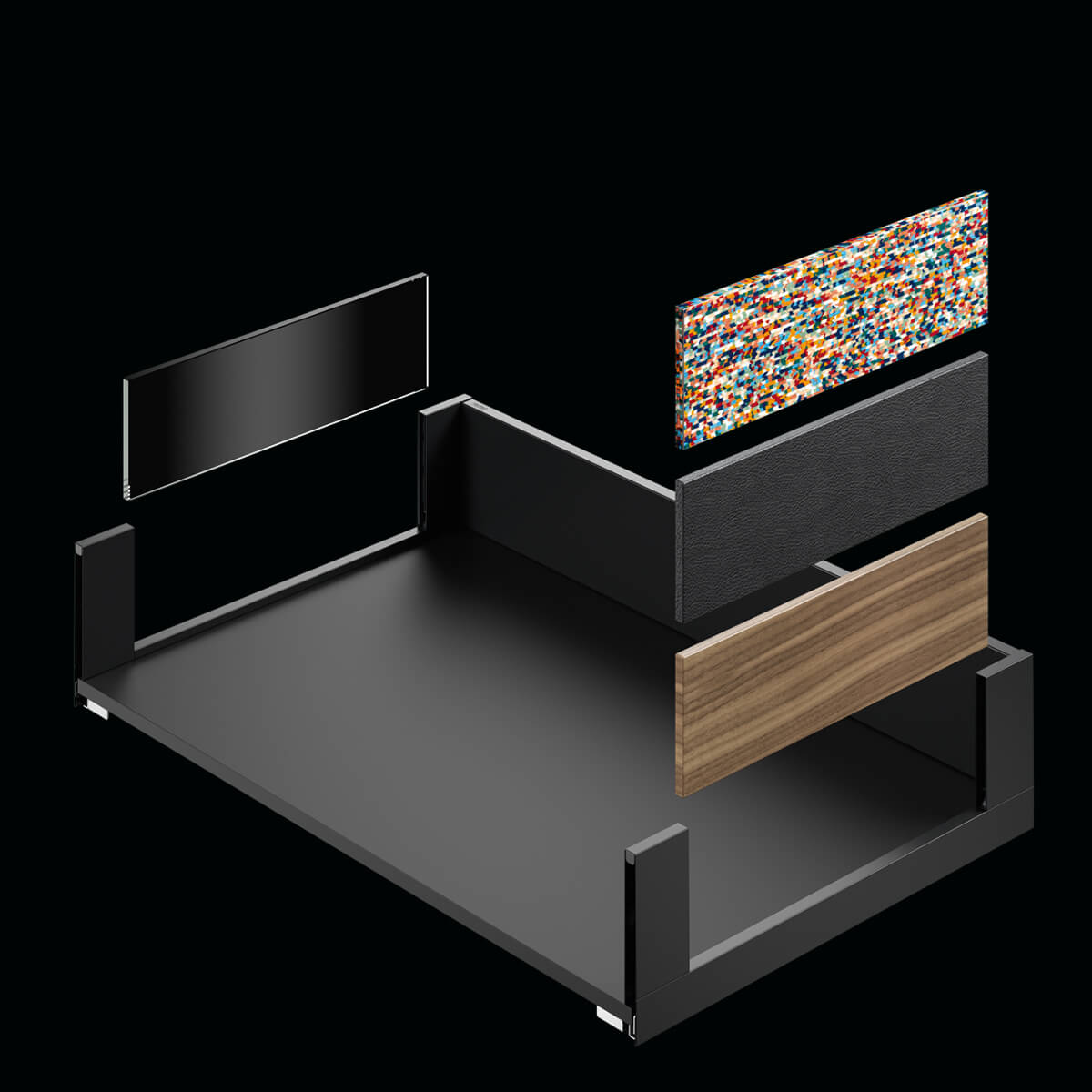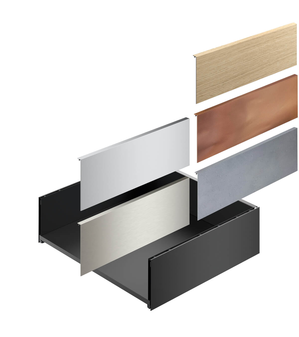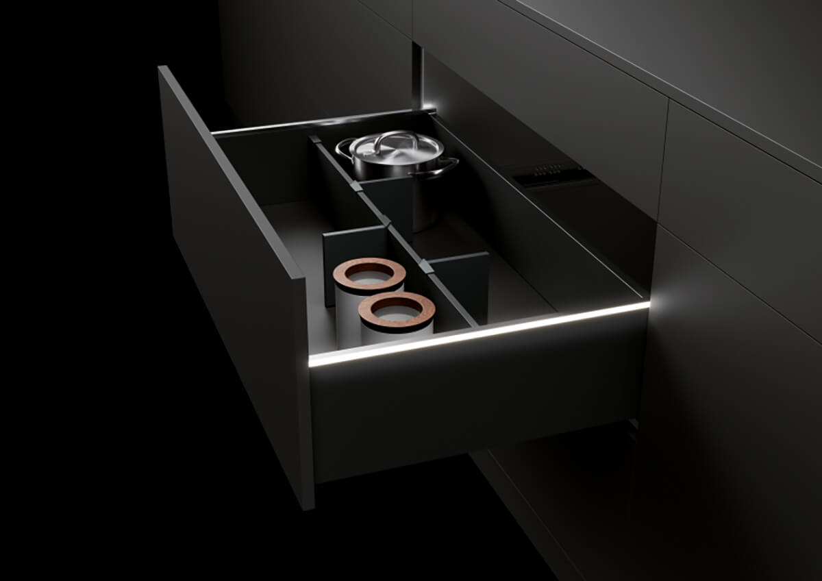 Страниците на чекмеджето могат да бъдат с фина дизайнерска визия от стомана в модерен антрацит или снежно бяло или пък с дизайнерска царга INLAY. И двата вида царги дават още допълнителни опции за развиване на дизайнерските възможности.