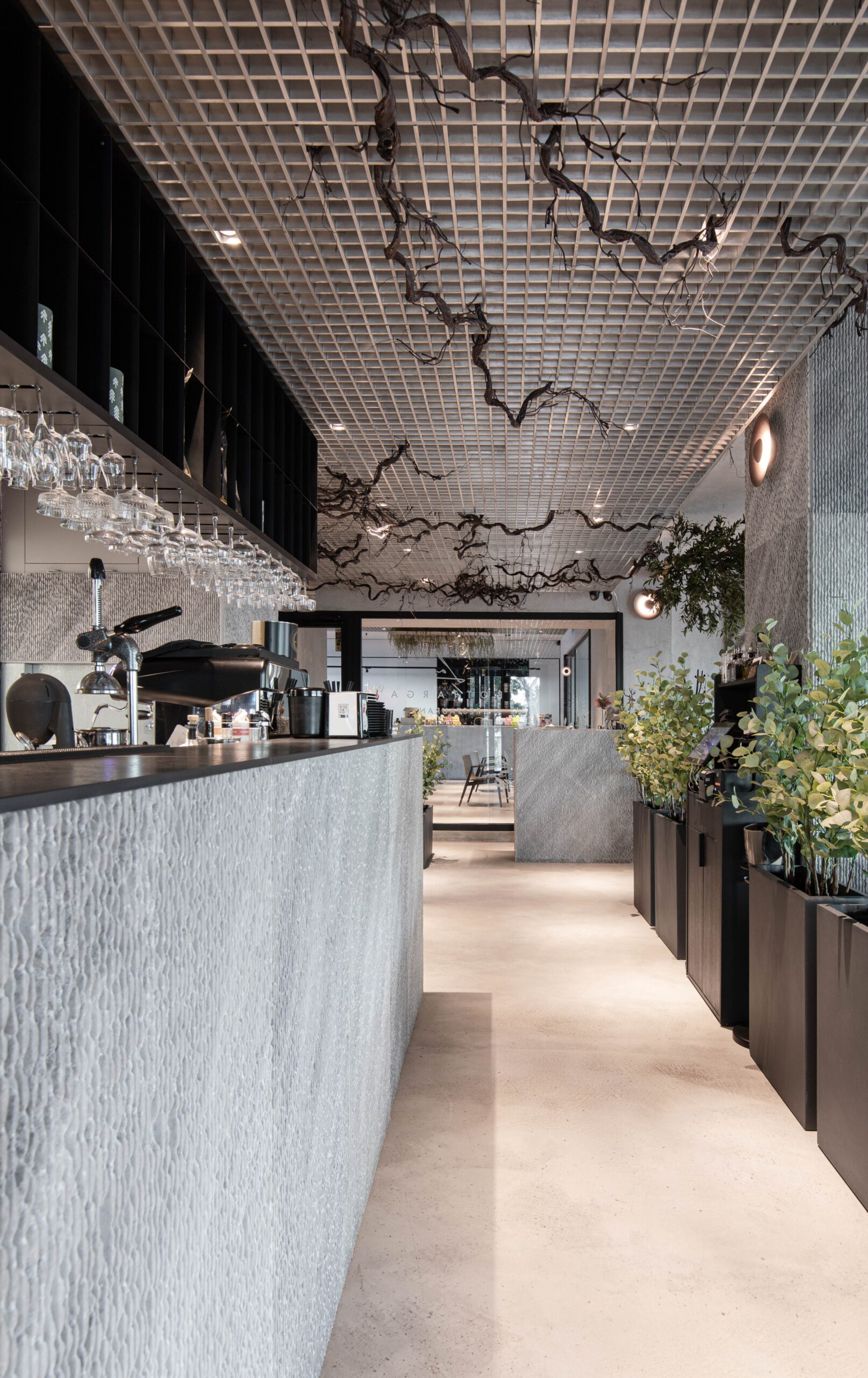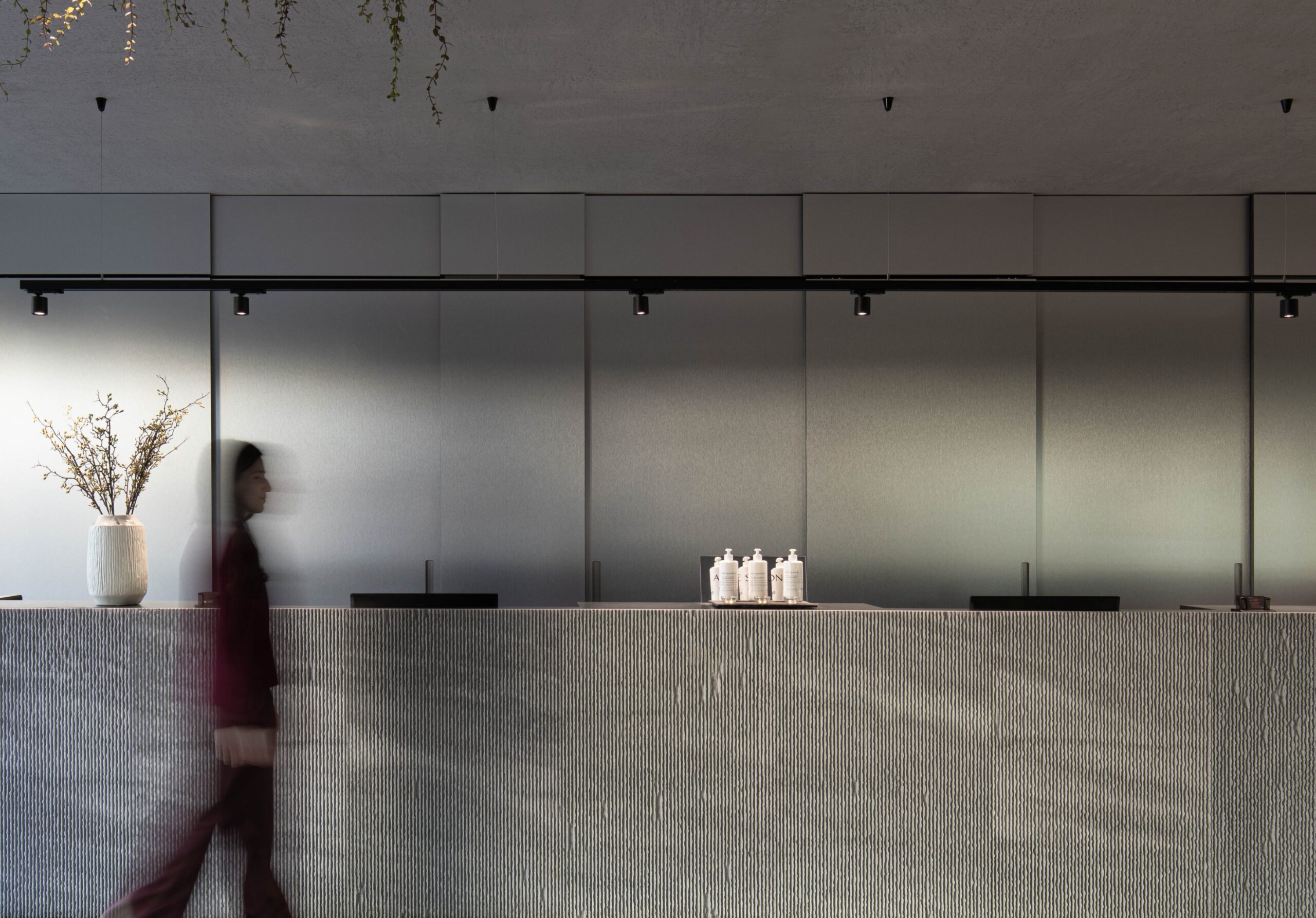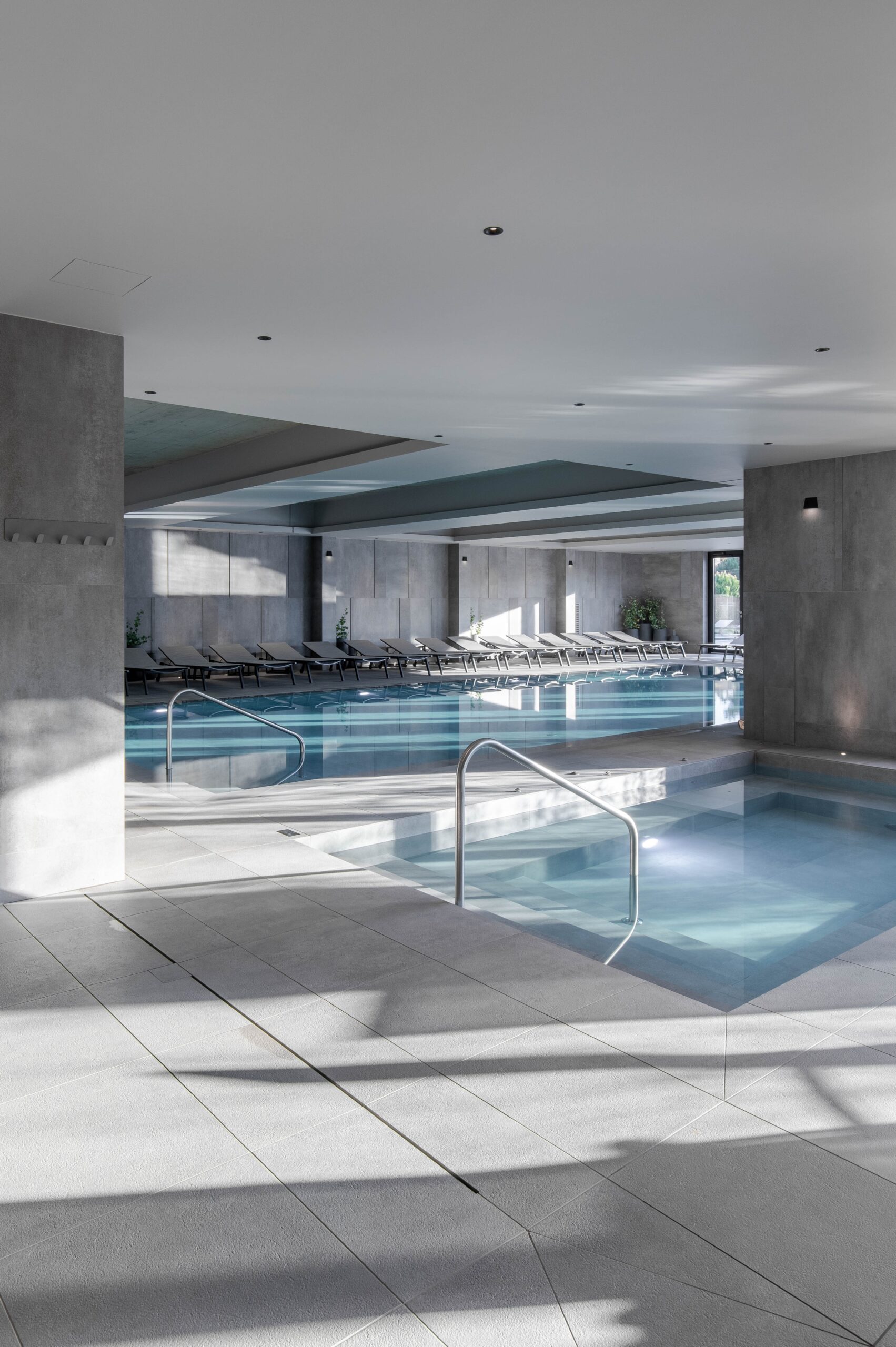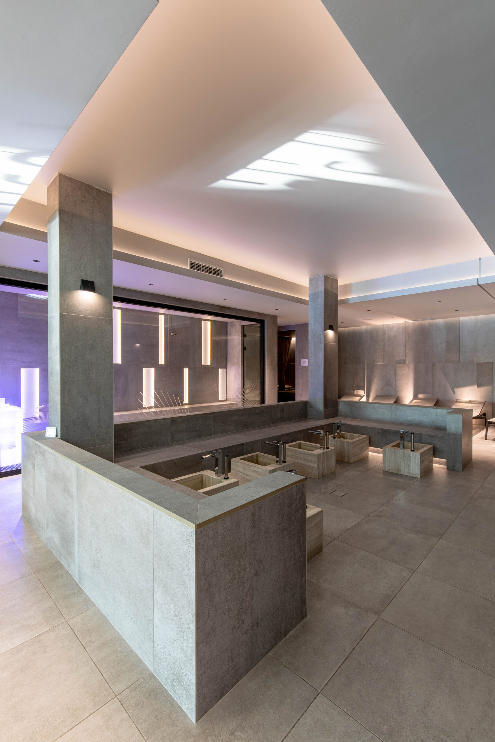 Сензорното усещане за земята е подсилено от бучардисаните керамични плочи в спа комплекса, както и от характерния за региона сив мрамор, машинно фрезован, за да превърне семплия материал в тактилен език на стихията.