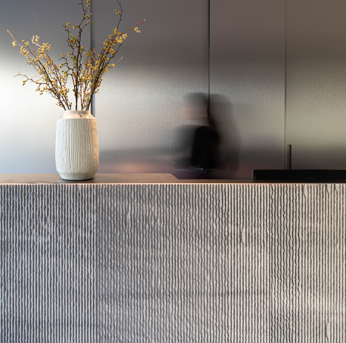 The sensory perception of earth is enhanced by bush-hammered ceramic tiles throughout the spa, as well as by the characteristic local gray marble, CNC-milled to transform this simple material into a tactile language of the element.