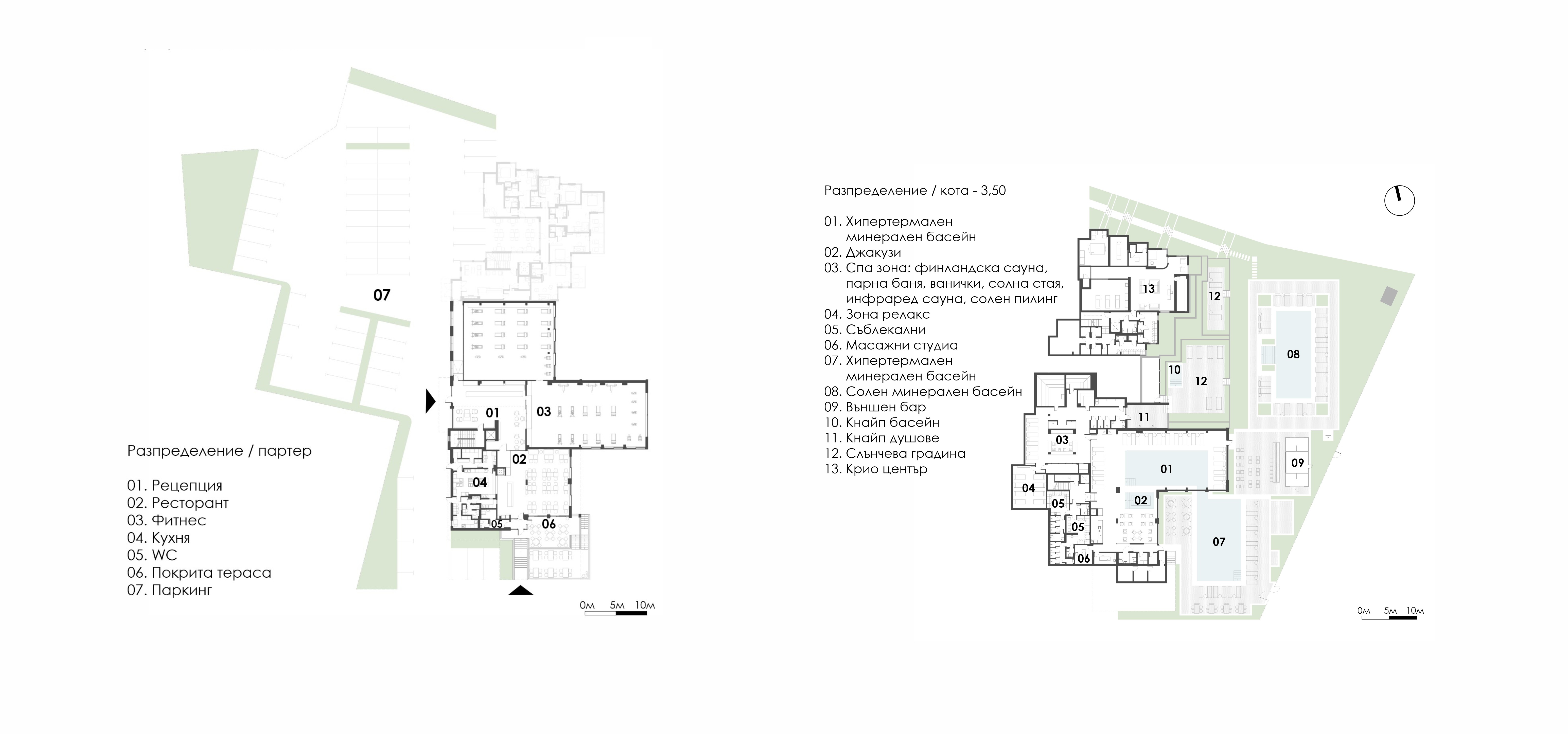 Functionally, the Therma Numera complex is organized in three floors, offering a diverse range of zones dedicated to comfort and rejuvenation. On the ground floor, a spacious foyer provides quick access to the restaurant and fitness center. The restaurant itself features an independent entrance, an interior space with generous façade glazing, and an outdoor terrace overlooking the picturesque exterior pool. The spa zone includes both indoor and outdoor areas with mineral pools, jacuzzis, a Kneipp pool, a salt mineral pool, infrared and Finnish saunas, a steam bath, salt room, relaxation lounge, hydrotherapy tubs, peeling and Kneipp showers, changing rooms, a sauna garden, sun gardens, and massage rooms. The complex also houses a cryo center, a medical and detox floor, and massage studios. The hotel section features a reception area for guests, while an outdoor parking area ensures maximum convenience for visitors.----------------------------------------------------------------------------------------------------------------------------------------------------------