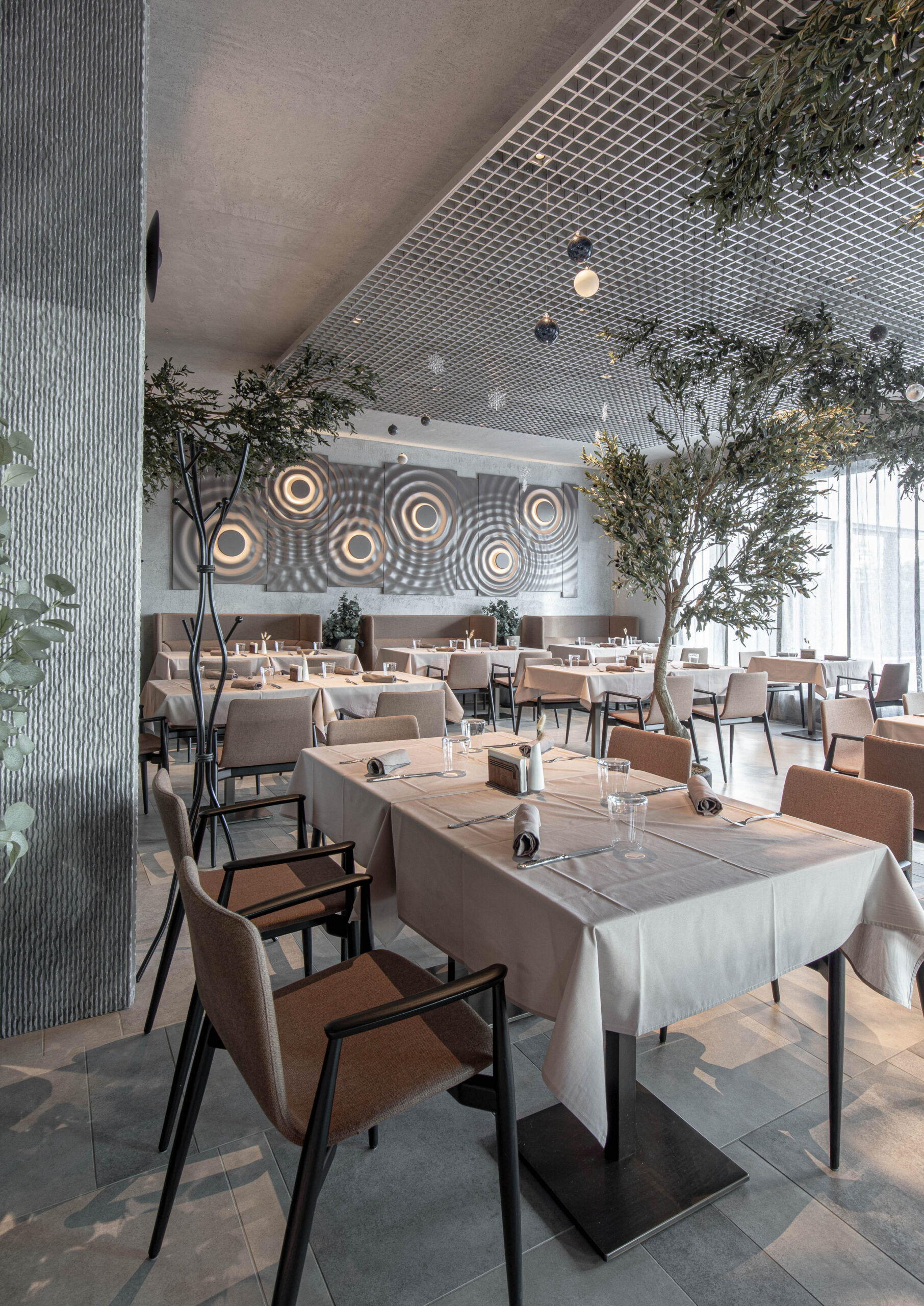 AQUA (Water). The mineral water of the Burgas Mineral Baths is an inseparable part of the region’s history, linked to the ancient spring of Aquae Calidae. Known since the time of the Thracians, this spring was considered sacred for its healing power. At Therma Numera, the element of water literally flows into the spa level of the complex through connected indoor and outdoor hyperthermal mineral pools. The aquatic experience is enriched by a salt mineral pool, a Kneipp pool, and jacuzzis. The symbolic meaning of water — as an element of constant motion and transformation — is interpreted through various materials and details: tactile ceramic wall tiles of varying thickness that create the illusion of movement within the spa; smooth, rounded river stones used as aggregate in the outdoor paving; the custom parametric “Ripple” panel with a water effect in the restaurant; and the playful reflections of stainless-steel details, partial aluminum ceilings, and metal furnishings.---------------------------------------------------------------------------------------------------------------------------------------------------------Функционално комплексът Therma Numera е организиран в три етажа, предлагащи разнообразни зони за комфорт и възстановяване. На първия етаж се намира фоайе с бърз достъп до ресторанта и фитнеса. Самият ресторант разполага с допълнителен самостоятелен вход, вътрешна част с щедро фасадно остъкляване и открита - с живописен поглед към външния басейн. Спа зоната предлага закрита и открита част с минерални басейни, джакузи, „кнайп“ басейн, солен минерален басейн, инфрачервена и финландска сауна, парна баня, солна стая, стая за релакс, ванички, пилинг и „кнайп“ душове, съблекални, сауна градина, слънчеви градини и масажни помещения. Комплексът включва още крио център, както и етаж с медицински и детокс центрове, и масажни студиа. Хотелската част разполага със самостоятелна приемна зона за гости, а за удобството на посетителите е предвиден и открит паркинг.