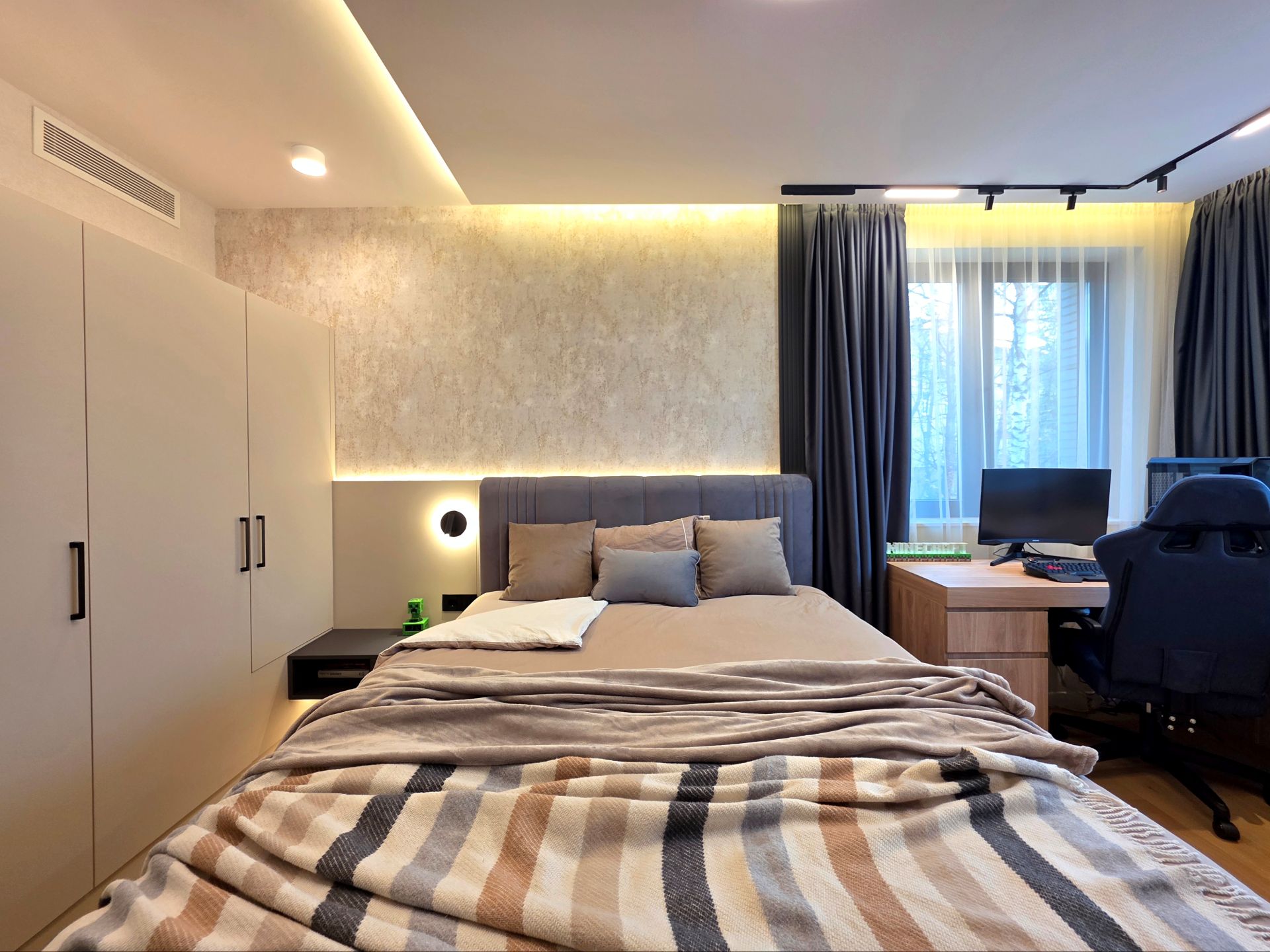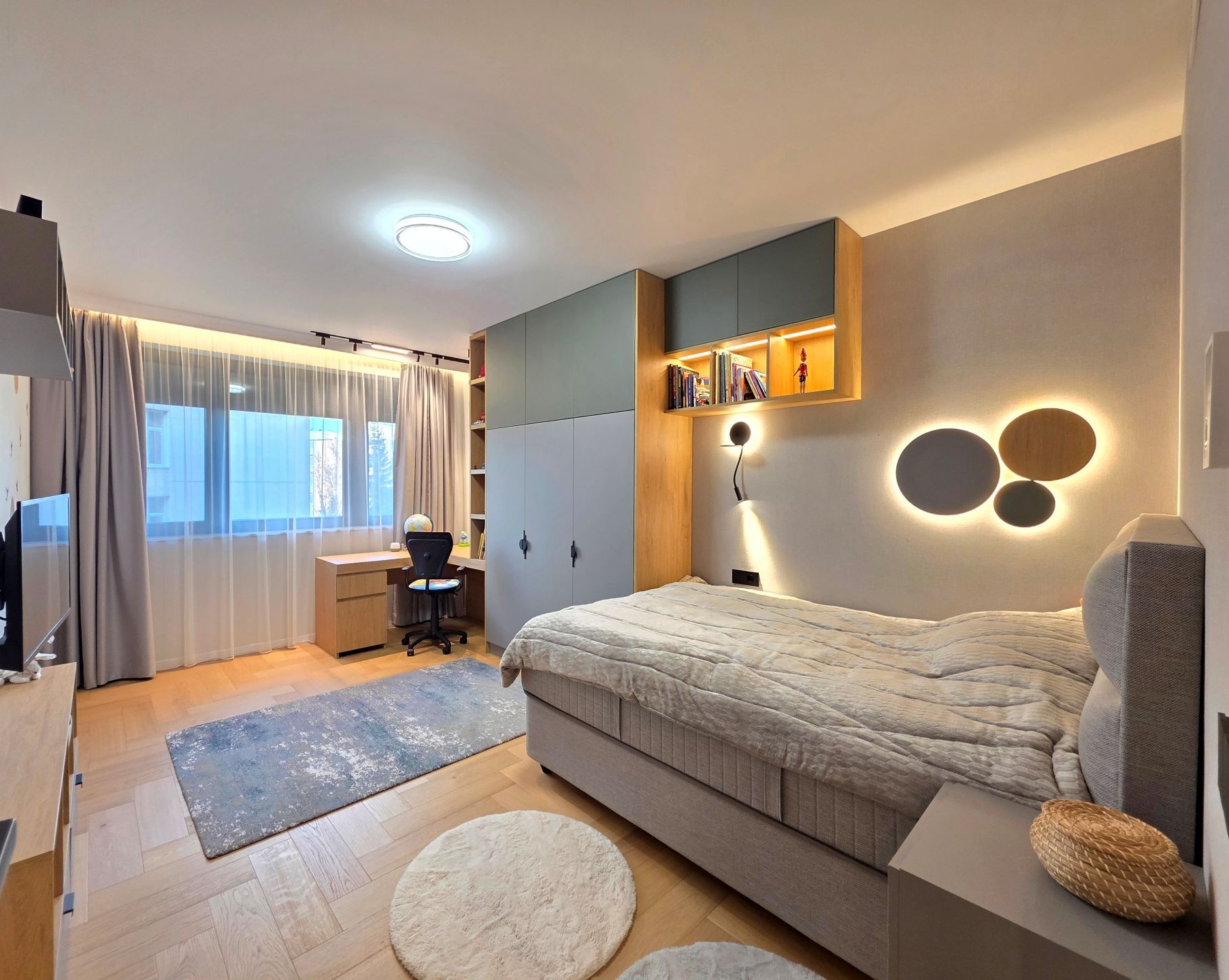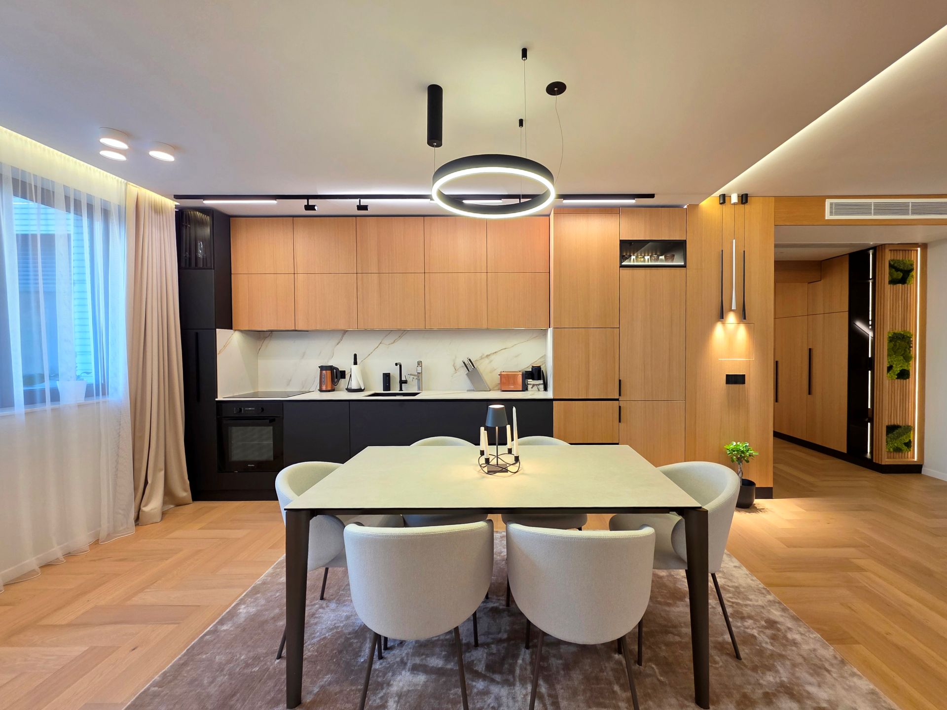 The living area, combining the kitchen, dining space, and living room, is designed as the social core of the home—bright, open, and flexible, with clearly defined functions and smooth transitions between them. The private areas—the master bedroom with its en-suite bathroom and the children’s rooms—are designed with an emphasis on calmness, comfort, and individuality, while consistently following the apartment’s overall conceptual direction.