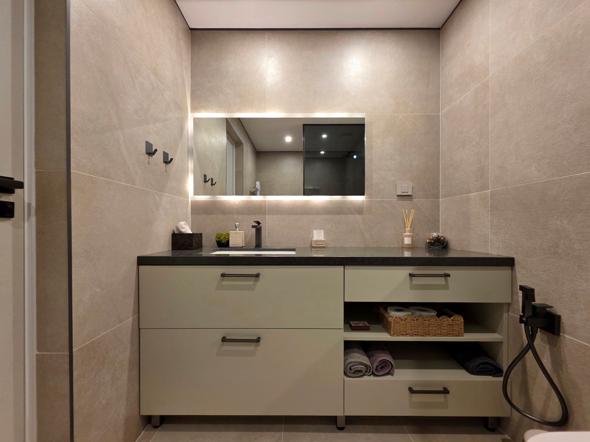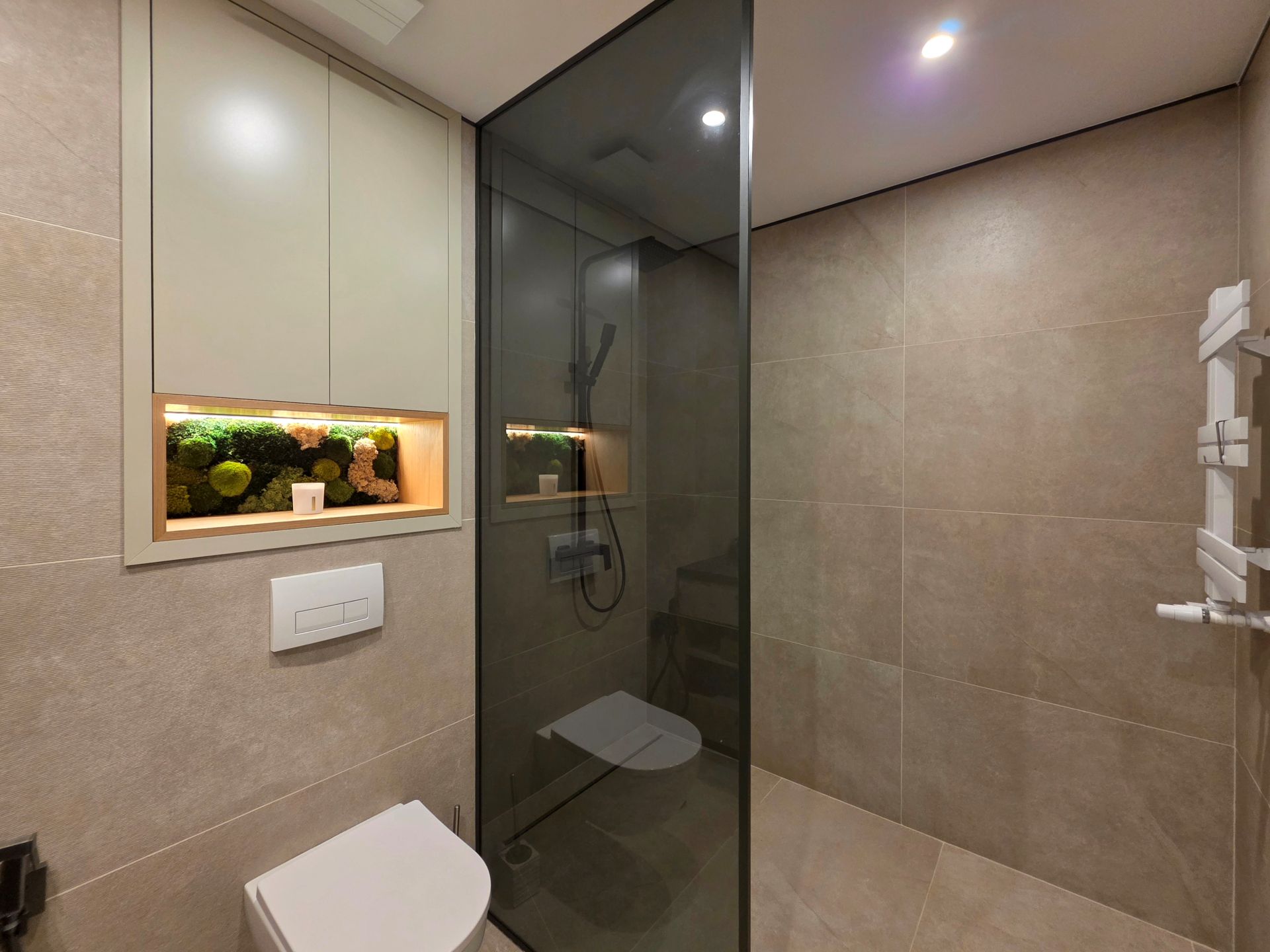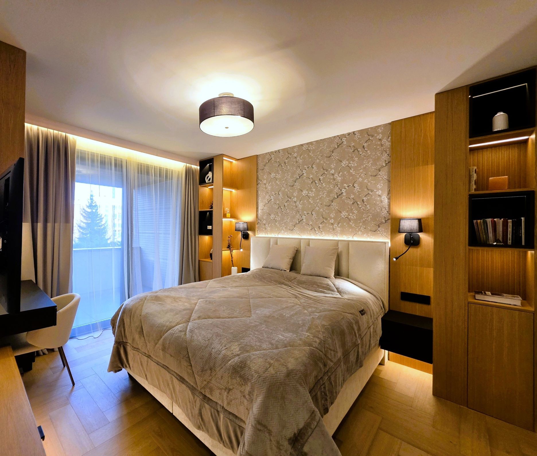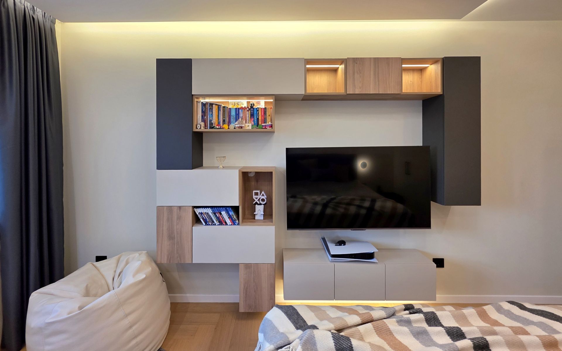 The living area, combining the kitchen, dining space, and living room, is designed as the social core of the home—bright, open, and flexible, with clearly defined functions and smooth transitions between them. The private areas—the master bedroom with its en-suite bathroom and the children’s rooms—are designed with an emphasis on calmness, comfort, and individuality, while consistently following the apartment’s overall conceptual direction.