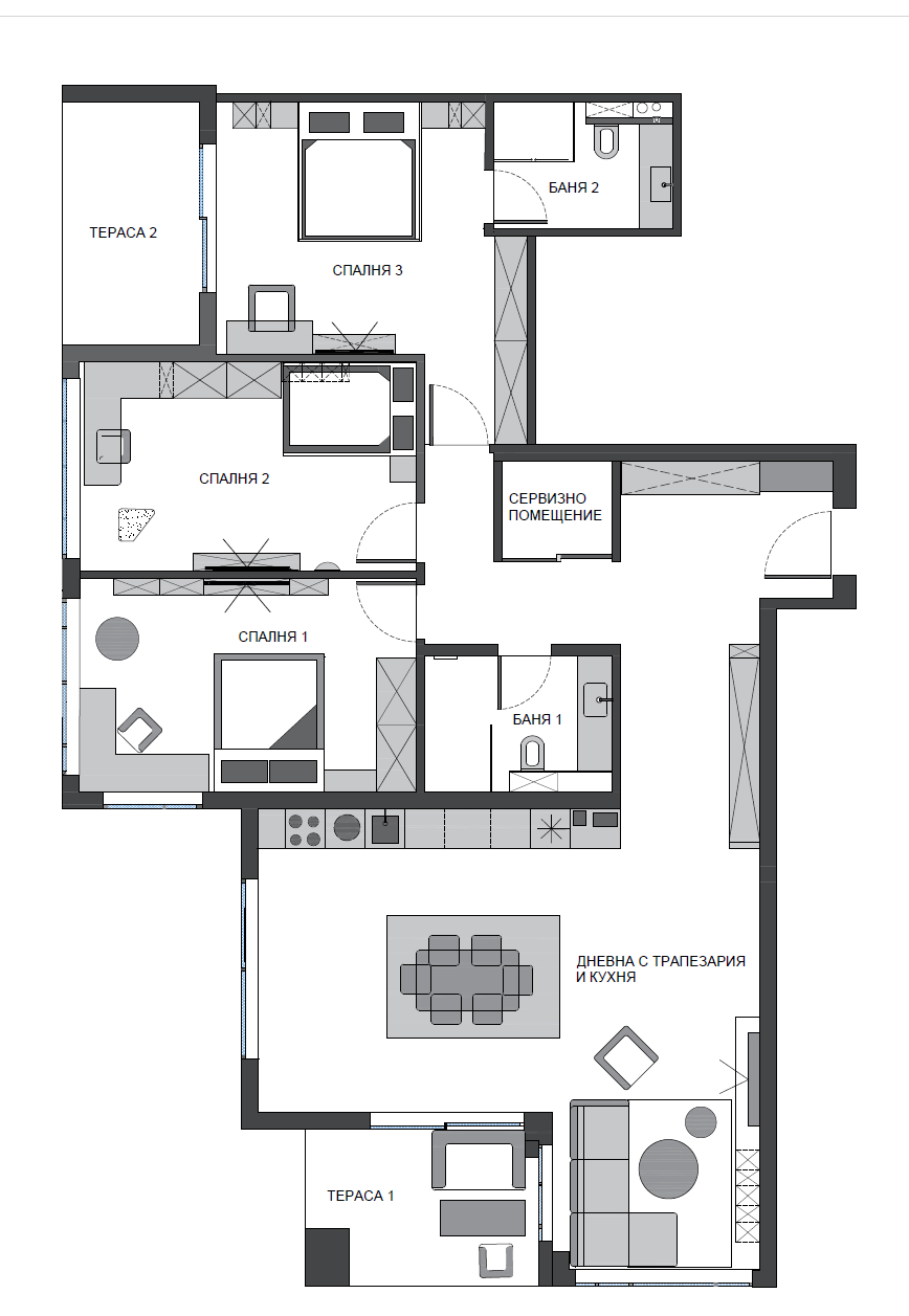 Дневната зона, обединяваща кухня, трапезария и хол, е проектирана като социално ядро на дома – светло, отворено и гъвкаво пространство с ясно дефинирани функции и плавен преход между тях. Частните зони – мастър спалнята с прилежаща баня и детските стаи – са решени с акцент върху спокойствието, уюта и индивидуалността, като същевременно следват общата концептуална линия на апартамента.