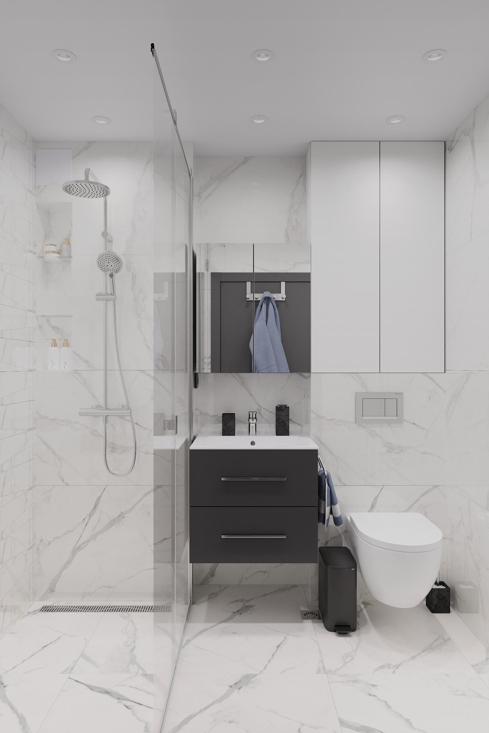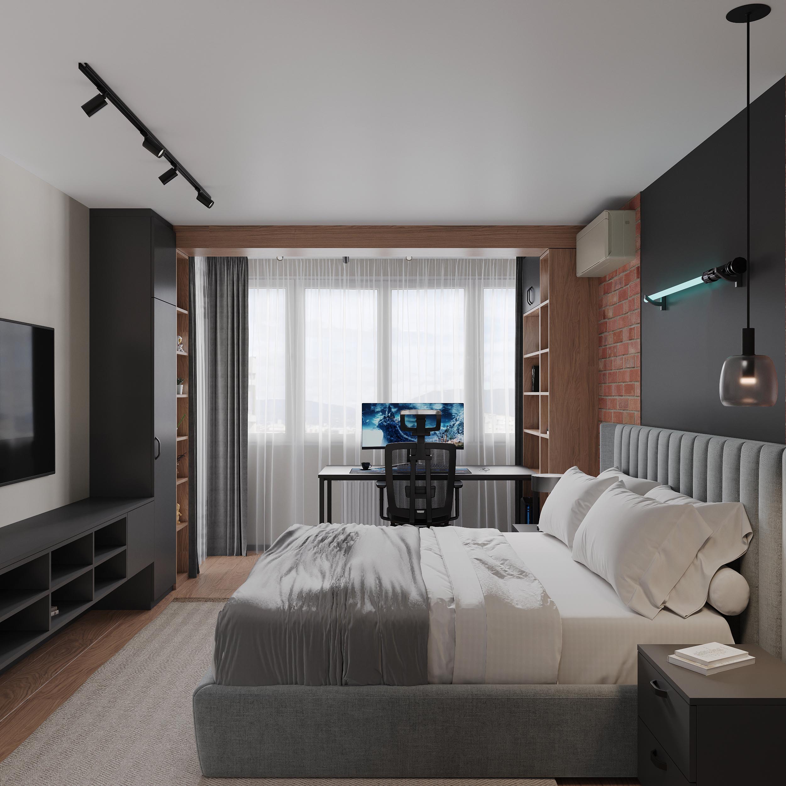 Елегантността среща индустриалния стил, а топлината на ореха балансира суровото излъчване на тухлите. Тъмносините акценти и сивите повърхности добавят дълбочина и модерно спокойствие.