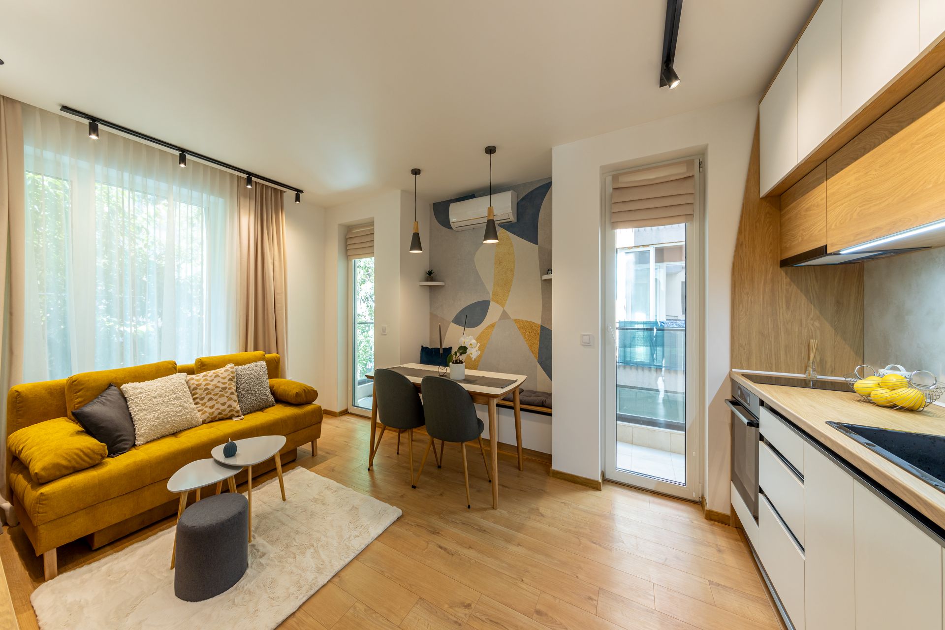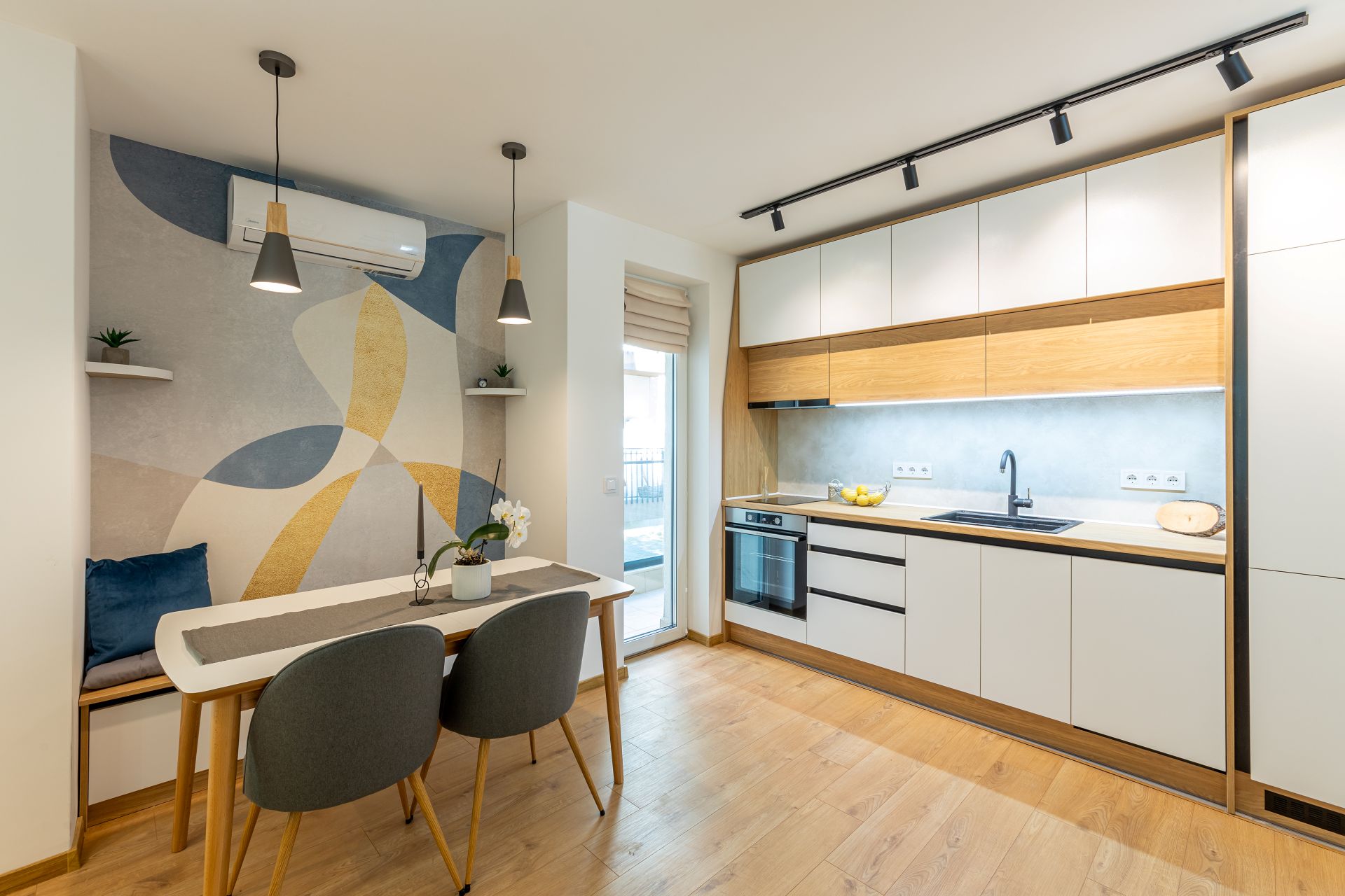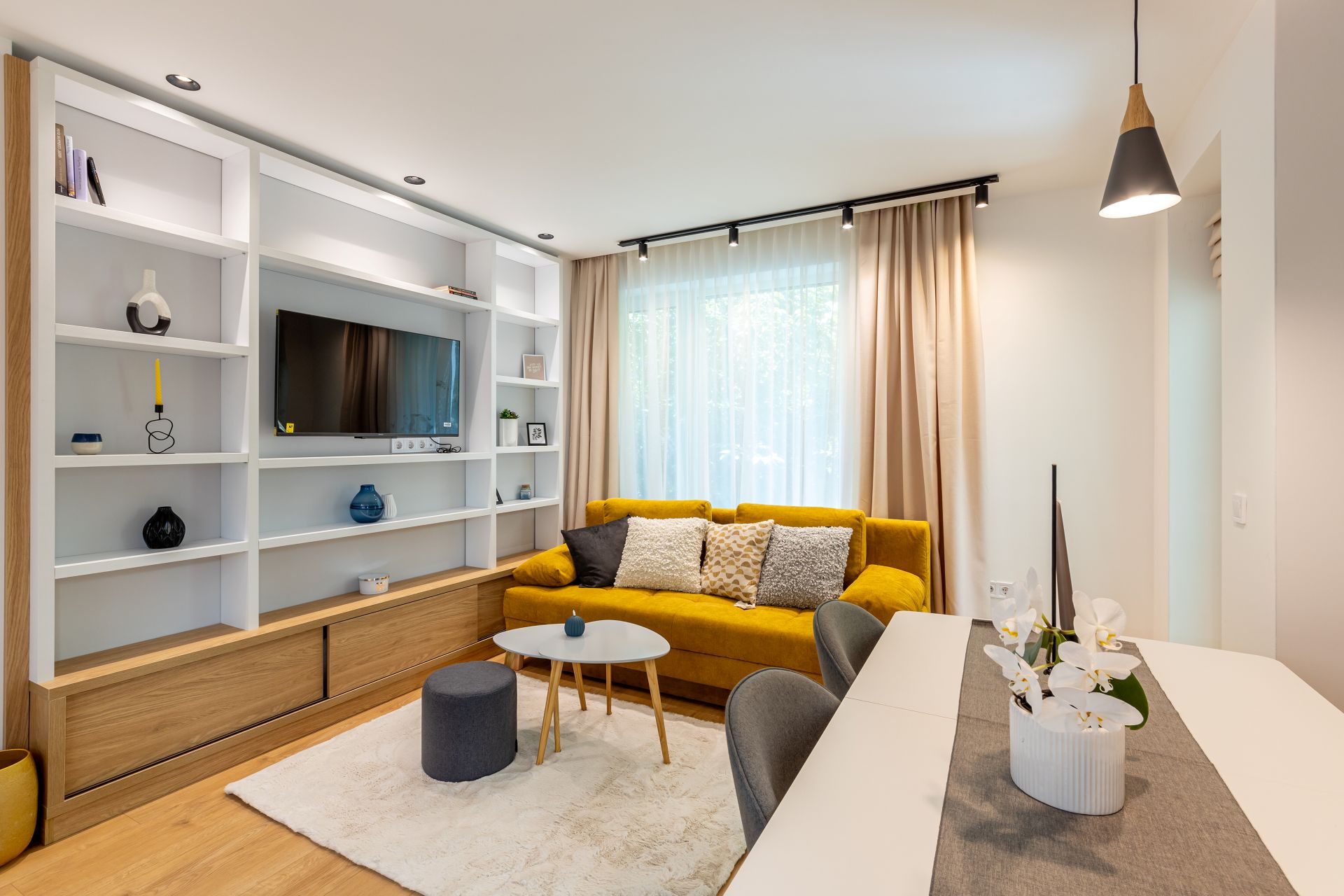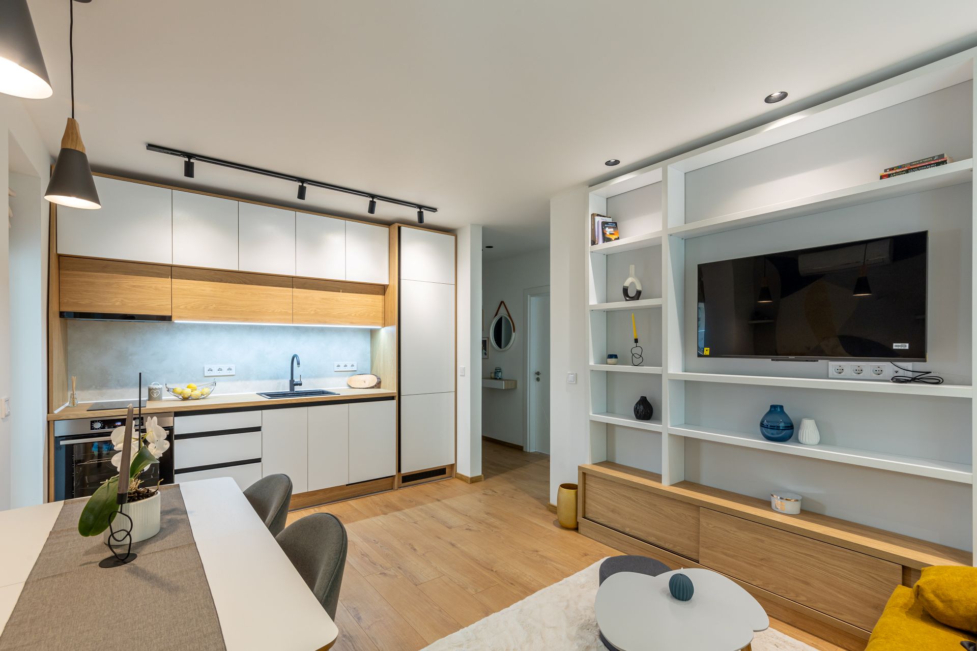 Дневната зона обединява кухня, трапезария и хол в ясна и рационална композиция. Индивидуално проектираните мебели и интегрираните системи за съхранение оптимизират ограничената площ, като същевременно запазват визуалната лекота и пространствената четимост. Осветлението има ключова архитектурна роля – комбинация от общо, работно и акцентно осветление моделира обема, подчертава пропорциите и подобрява функционалността.