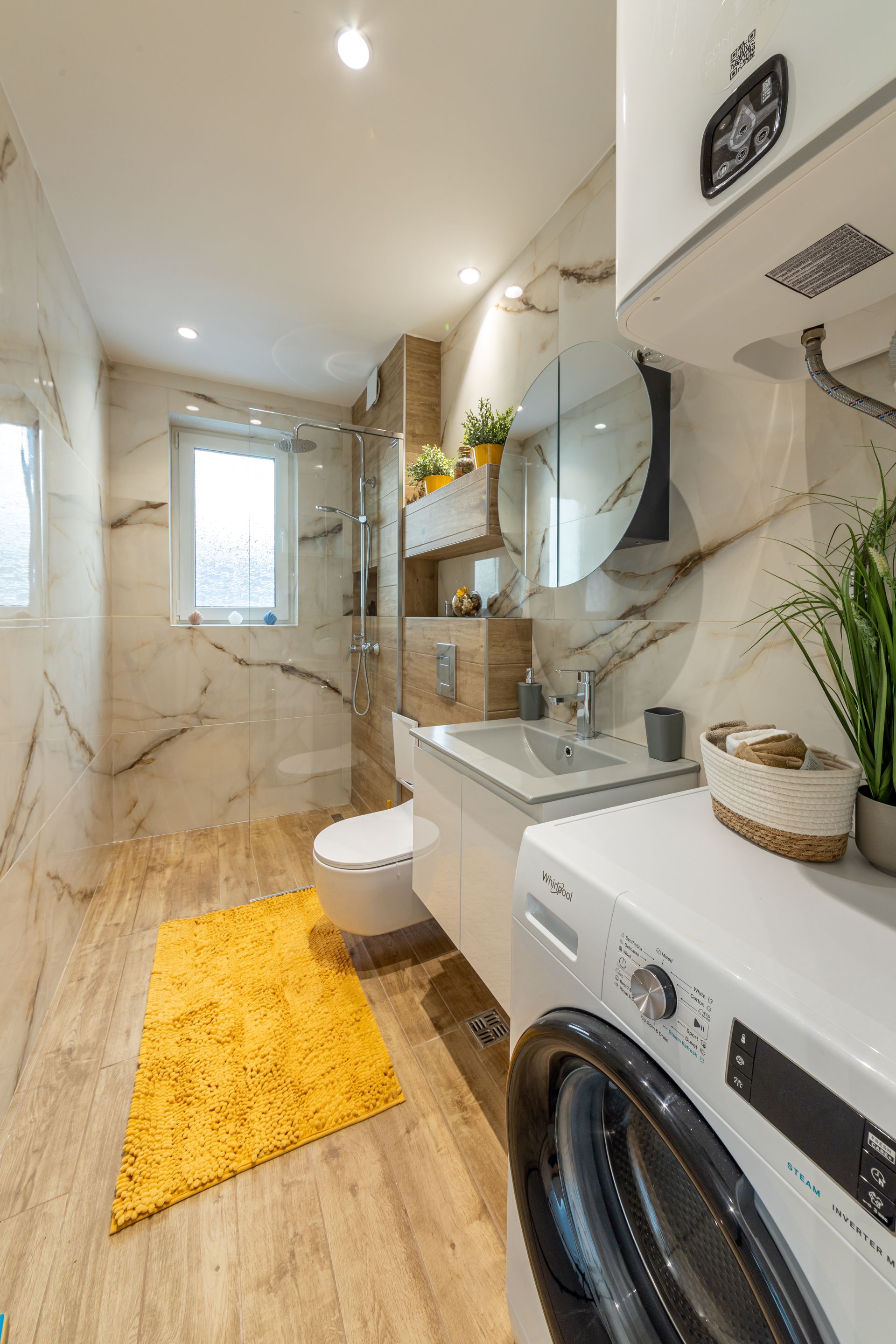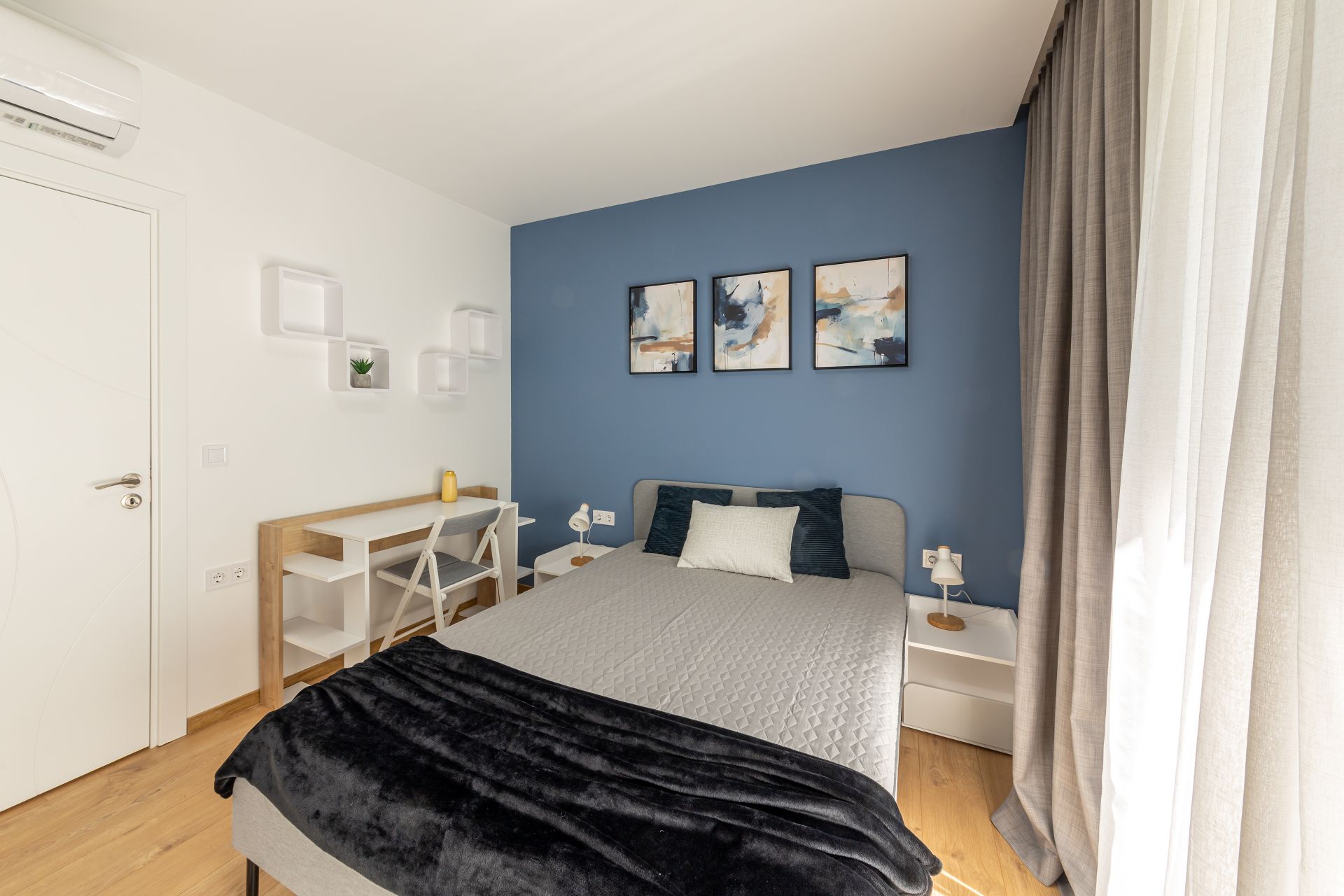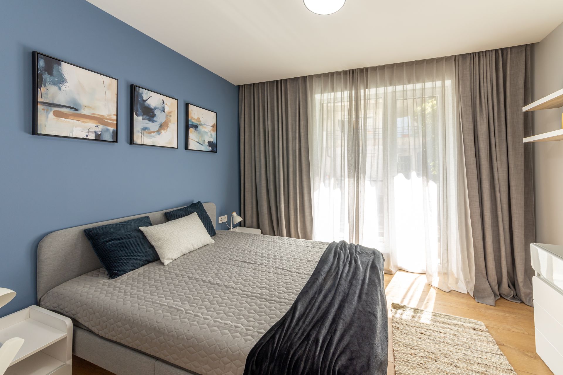 Частните пространства следват същата концептуална логика, като акцентът е върху спокойствието, комфорта и материалната последователност. Спалнята е оформена като зона за уединение, а банята залага на ясна функционална организация и дълготрайни покрития.