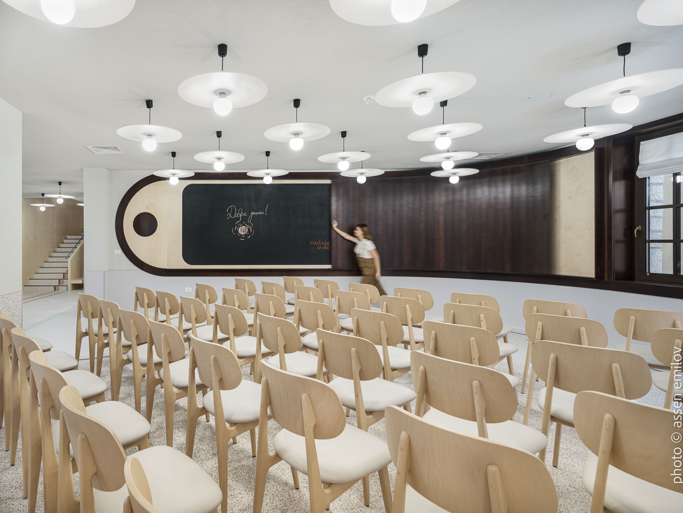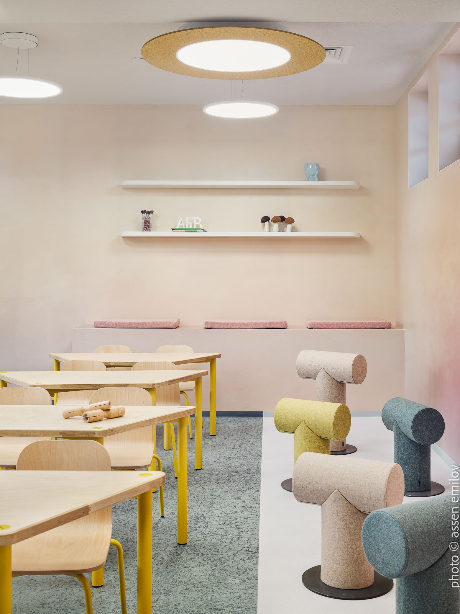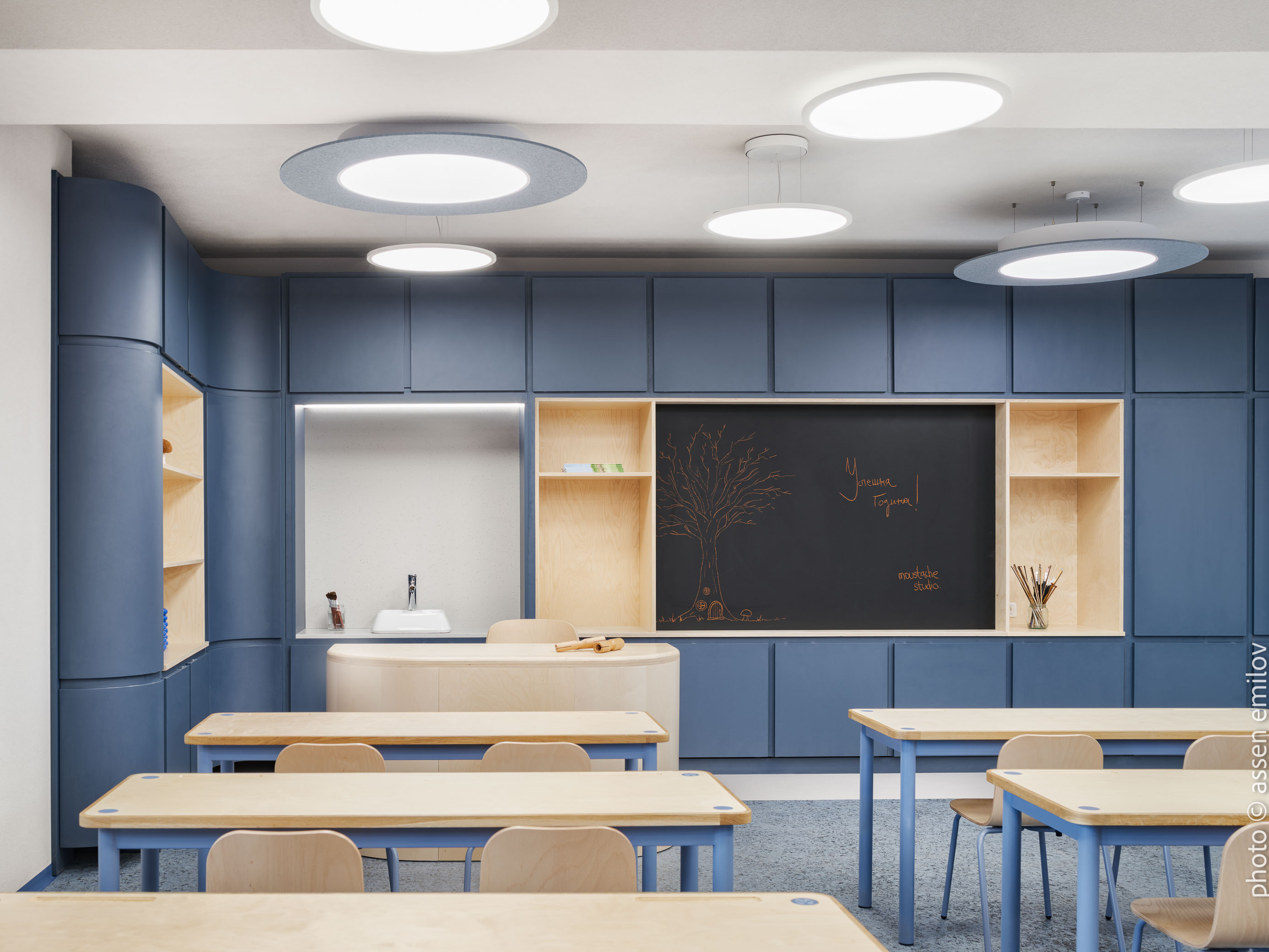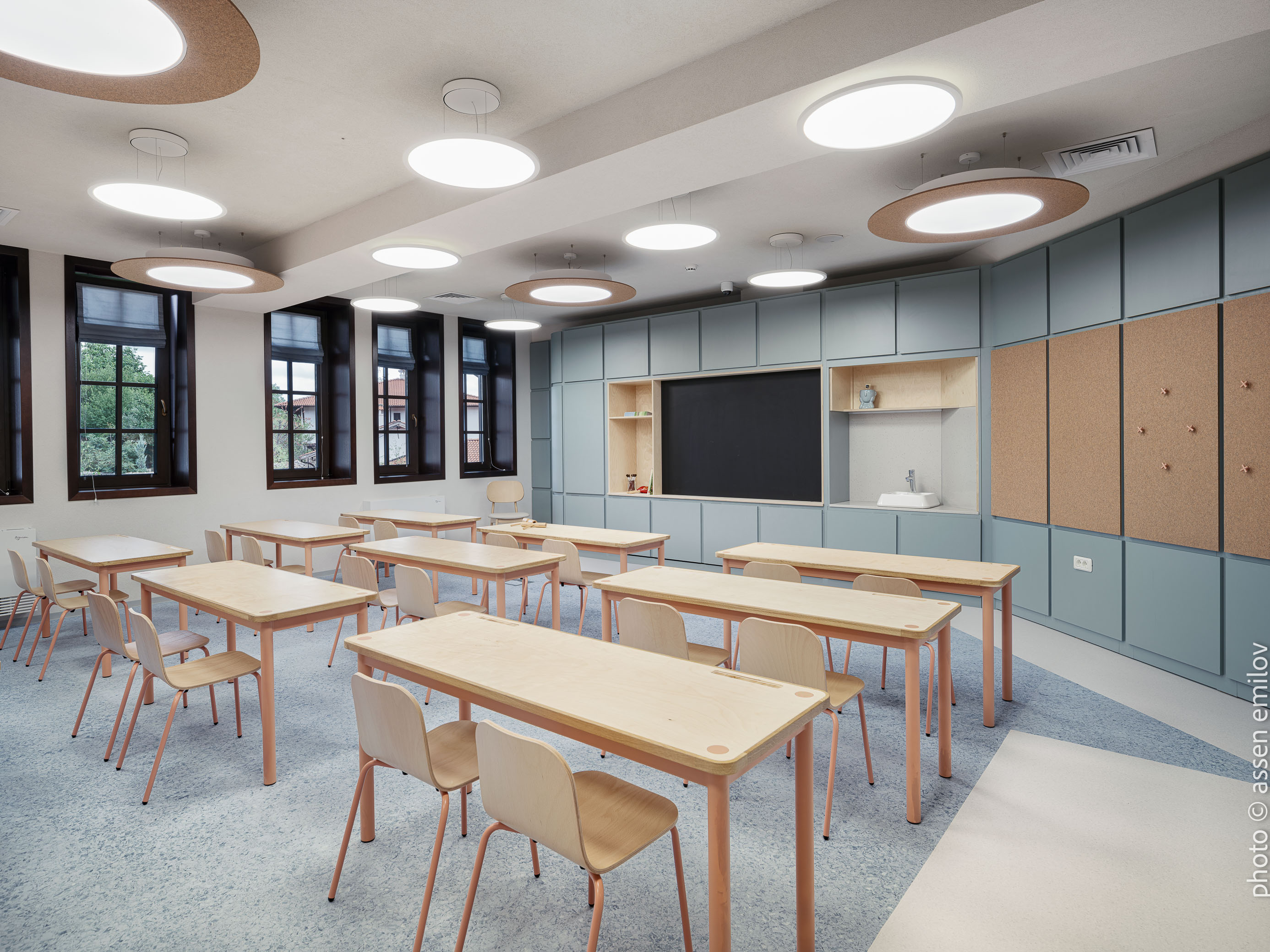 Проектът е вдъхновен от Валдорфската образователна традиция, където свободата на духа, хармонията и връзката с природата са водещи принципи. Затова всяка от класните стаи е създадена с мисъл за възрастовата група: при най-малките – топли тонове, меки форми и уютни пространства, а при по-големите – по-издължени помещения, изчистени линии и постепенно изсветляваща палитра. В предучилищните групи се появяват архетипните образи на „Дървото“ и „Къщата“. Артистична инсталация под формата на разперено дърво в центъра на помещенията, предразполага към общи занимания, а короната му от ефирен текстил, ще се сменя според сезона. „Къщата“ от своя страна е убежище за тишина и самостоятелни занимания, в което всяко дете намира своя малък кът за уединение. Масите на децата са ергономично съобразени и с трапецовидна форма, позволяваща множество различни подредби, както в затворен контур, така и на по-малки и разнородни групи. В класните стаи, черните дъски са вградени в единствената корпусна мебел в помещенията, която се явява основен цветови акцент. Подиумите в класните стаи, ориентирани по диагонал разчупват традиционната подредба и се превръщат в сцена за театър, музика и занаяти. В коридорите и залите специално място е отделено за детските рисунки и творби, превръщайки училището в непрекъснато обновяваща се галерия. //EN The project is inspired by the Waldorf educational tradition, where freedom of spirit, harmony, and a deep connection to nature are core principles. For this reason, each classroom has been designed with careful consideration of the children’s age group. Spaces for the youngest pupils feature warm tones, soft forms, and a strong sense of coziness, while classrooms for older children become more elongated, with cleaner lines and a gradually lightening color palette.