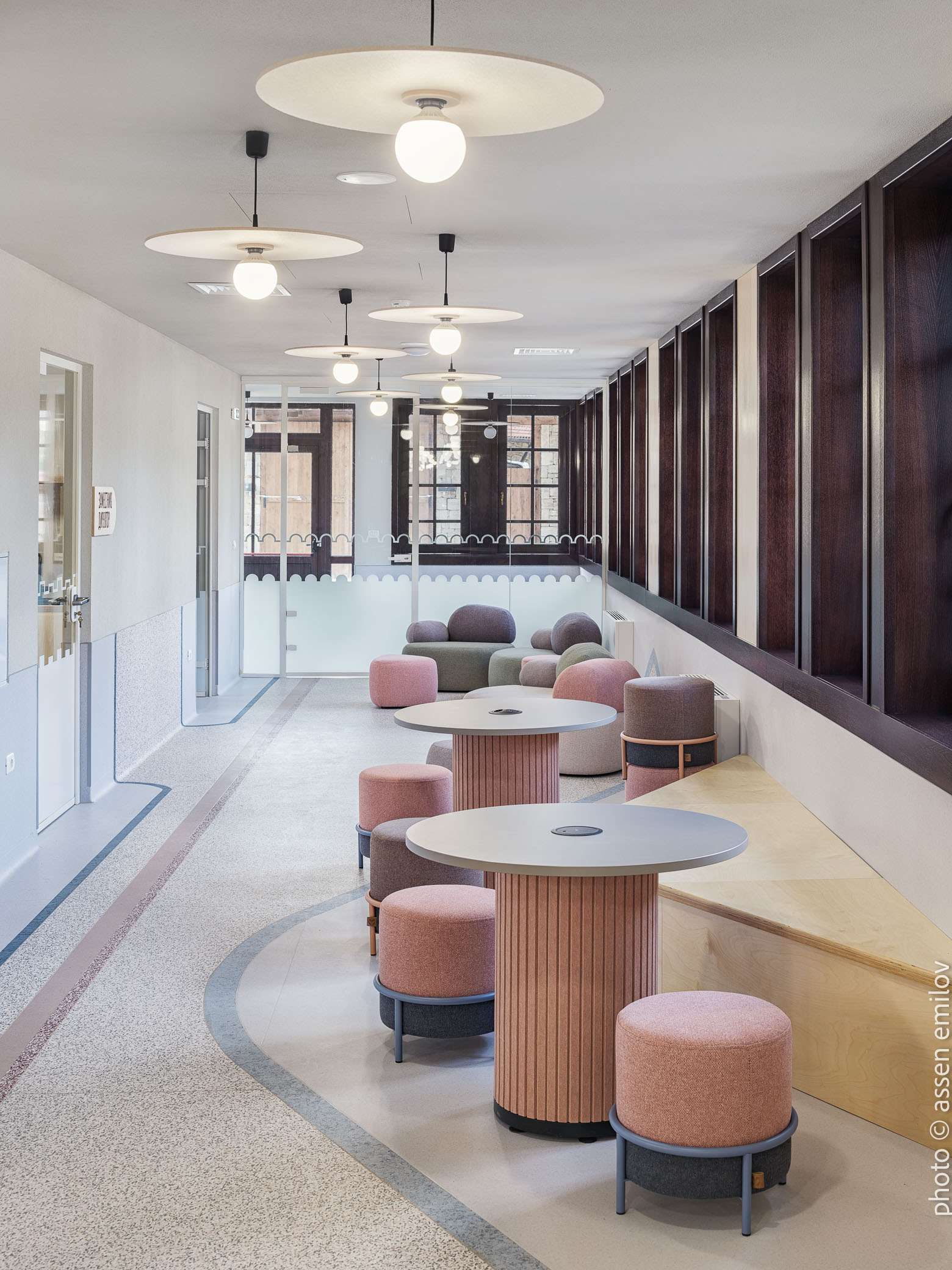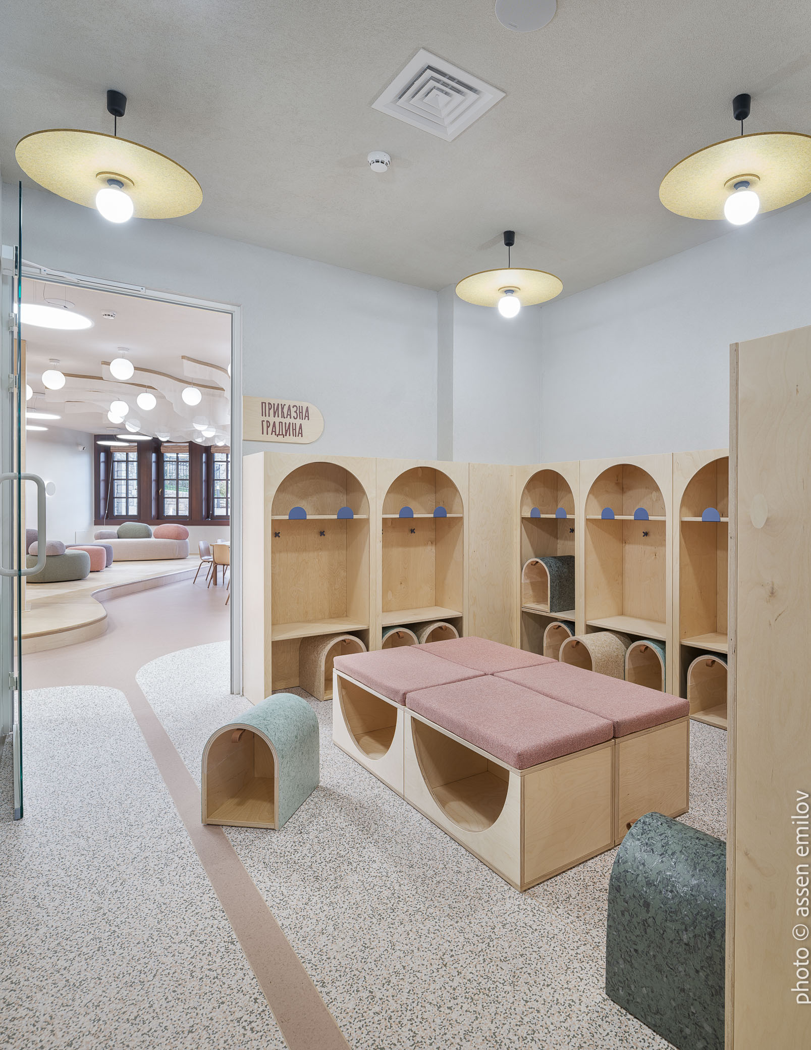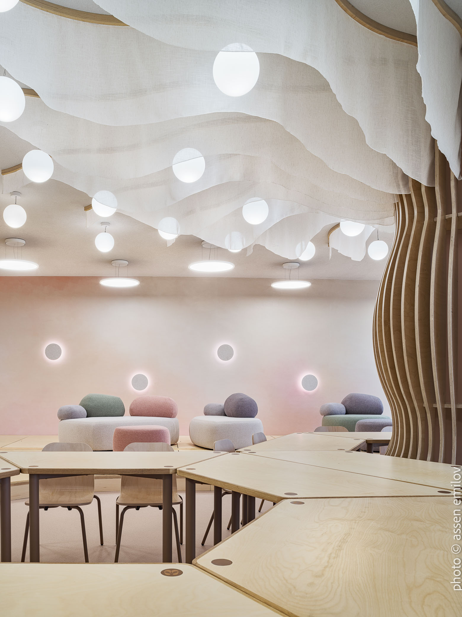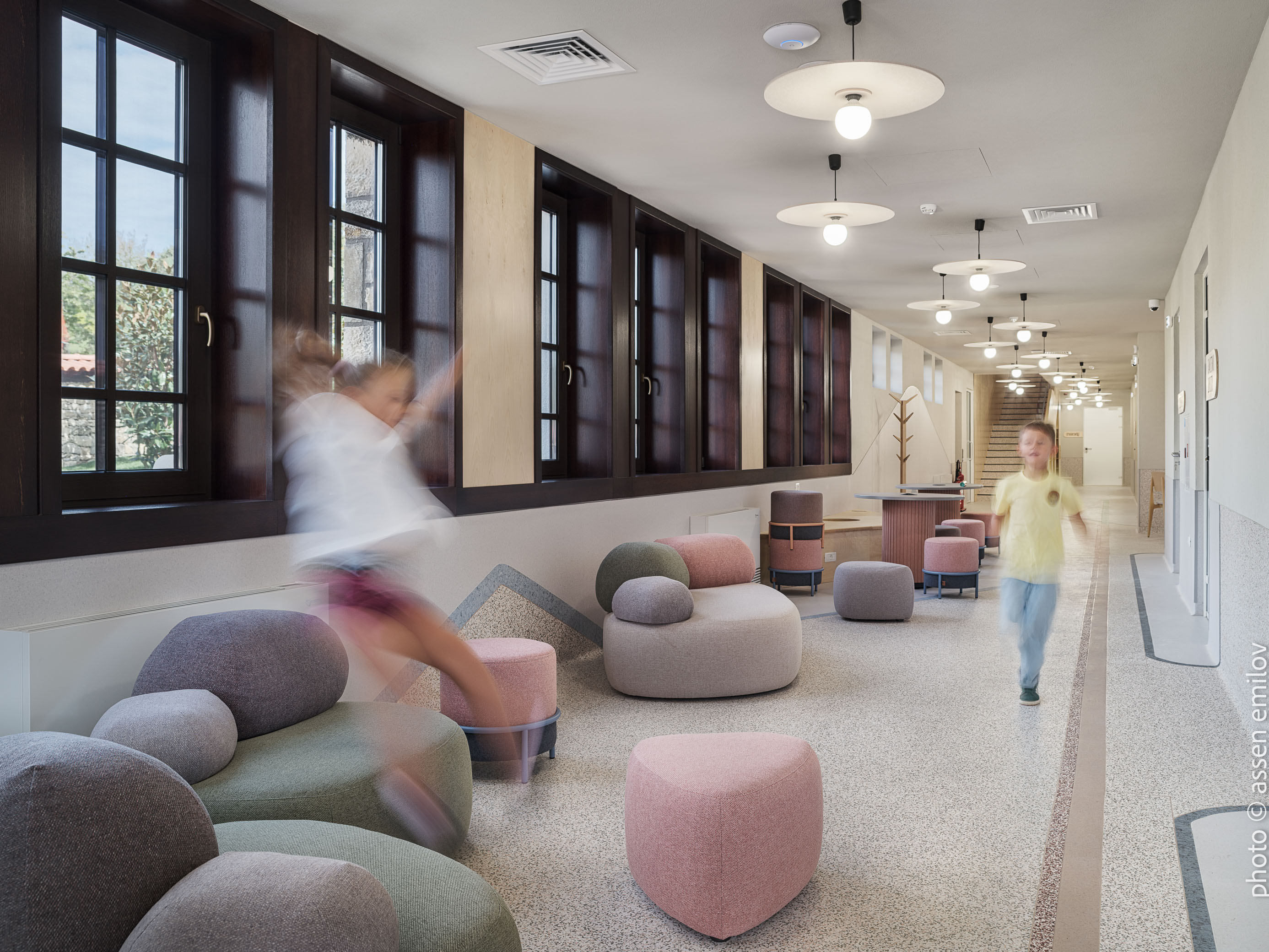 Проектът е вдъхновен от Валдорфската образователна традиция, където свободата на духа, хармонията и връзката с природата са водещи принципи. Затова всяка от класните стаи е създадена с мисъл за възрастовата група: при най-малките – топли тонове, меки форми и уютни пространства, а при по-големите – по-издължени помещения, изчистени линии и постепенно изсветляваща палитра. В предучилищните групи се появяват архетипните образи на „Дървото“ и „Къщата“. Артистична инсталация под формата на разперено дърво в центъра на помещенията, предразполага към общи занимания, а короната му от ефирен текстил, ще се сменя според сезона. „Къщата“ от своя страна е убежище за тишина и самостоятелни занимания, в което всяко дете намира своя малък кът за уединение. Масите на децата са ергономично съобразени и с трапецовидна форма, позволяваща множество различни подредби, както в затворен контур, така и на по-малки и разнородни групи. В класните стаи, черните дъски са вградени в единствената корпусна мебел в помещенията, която се явява основен цветови акцент. Подиумите в класните стаи, ориентирани по диагонал разчупват традиционната подредба и се превръщат в сцена за театър, музика и занаяти. В коридорите и залите специално място е отделено за детските рисунки и творби, превръщайки училището в непрекъснато обновяваща се галерия. //EN The project is inspired by the Waldorf educational tradition, where freedom of spirit, harmony, and a deep connection to nature are core principles. For this reason, each classroom has been designed with careful consideration of the children’s age group. Spaces for the youngest pupils feature warm tones, soft forms, and a strong sense of coziness, while classrooms for older children become more elongated, with cleaner lines and a gradually lightening color palette.