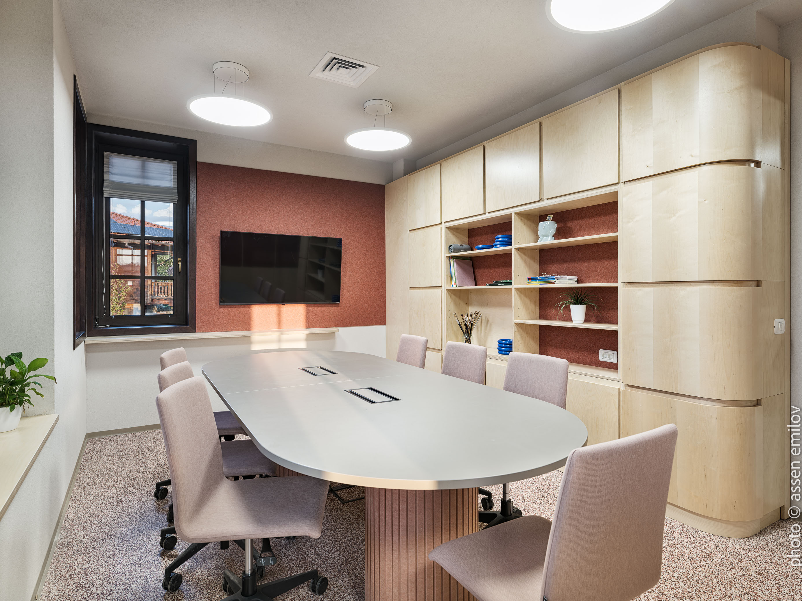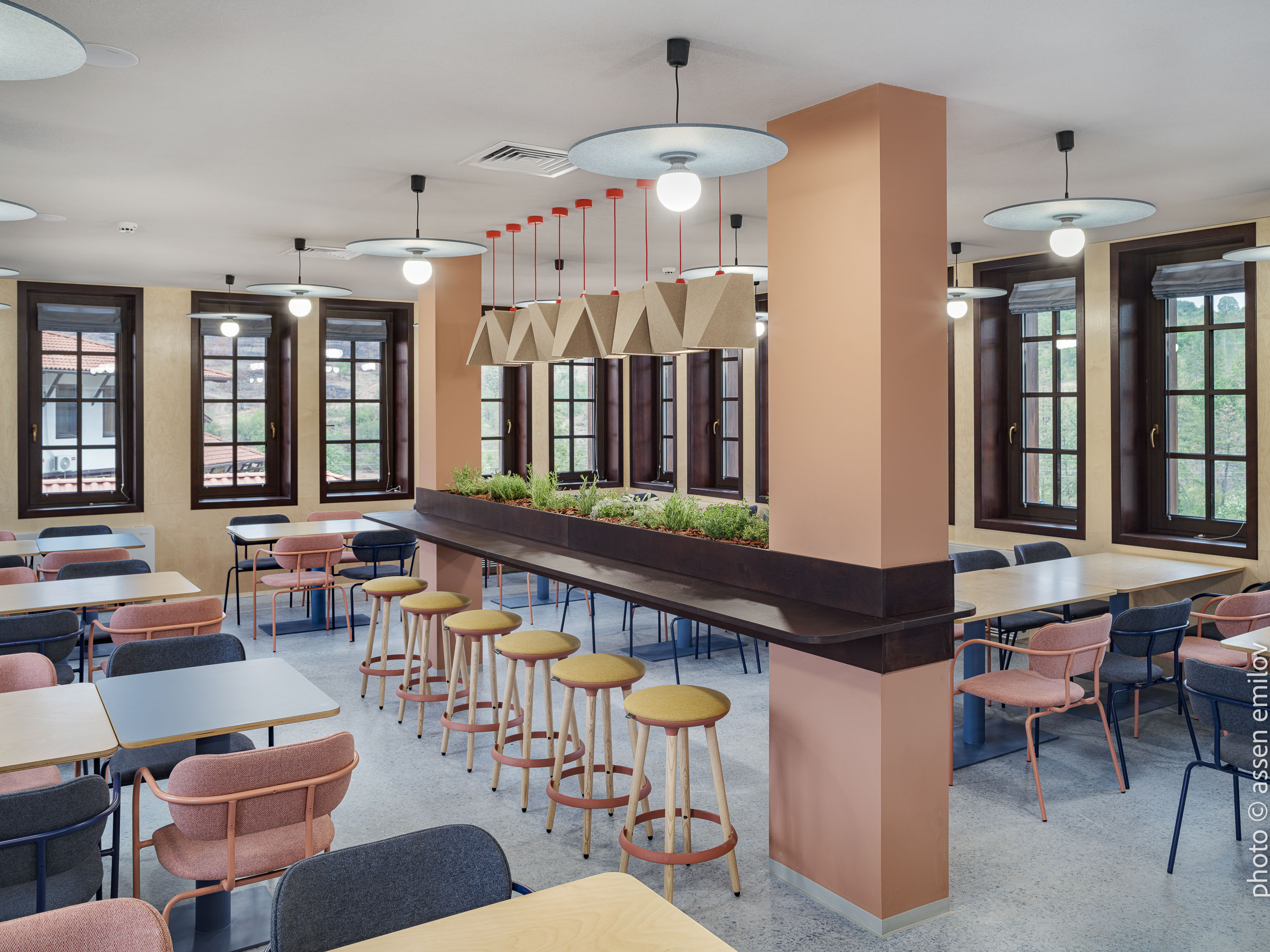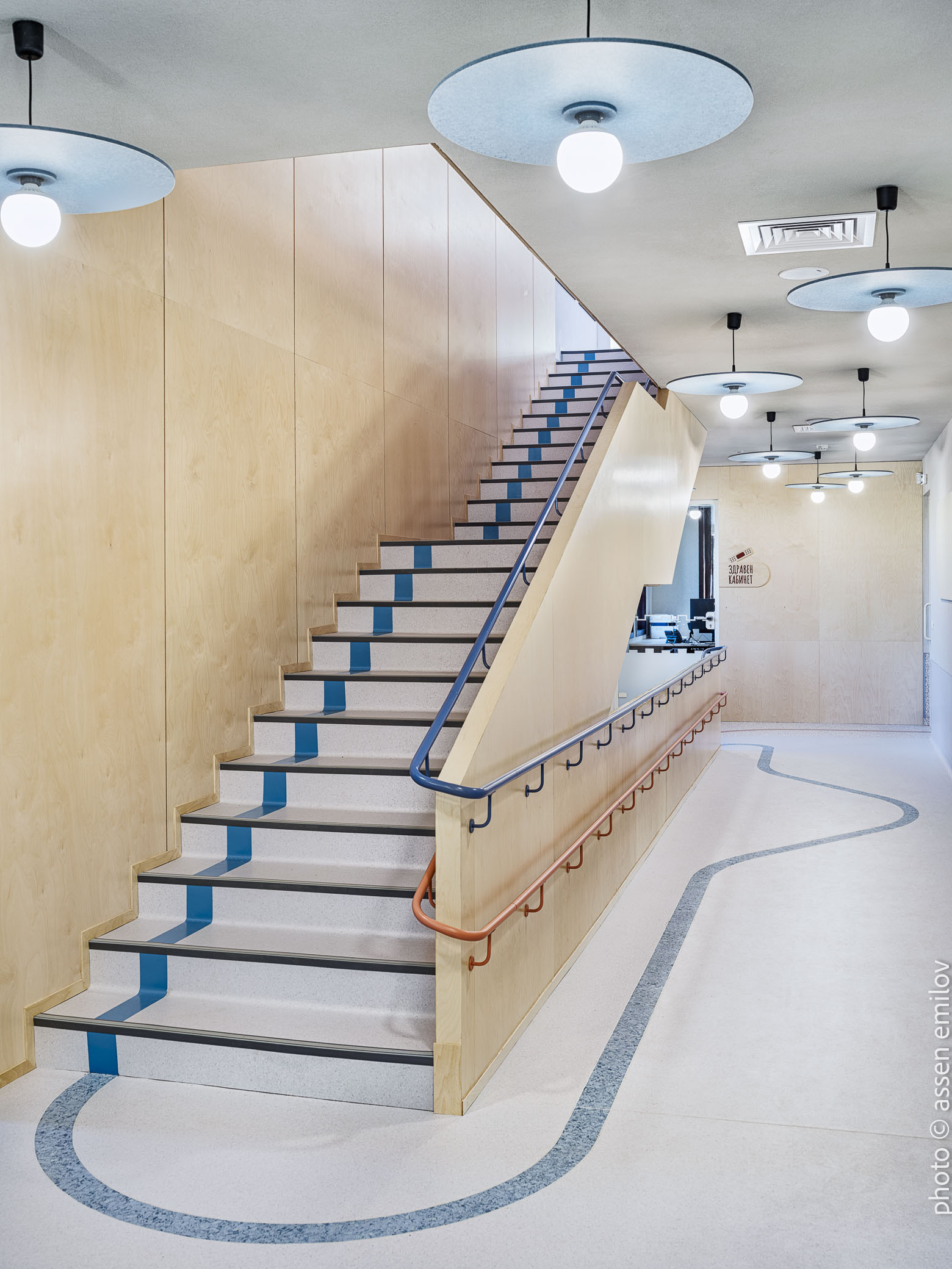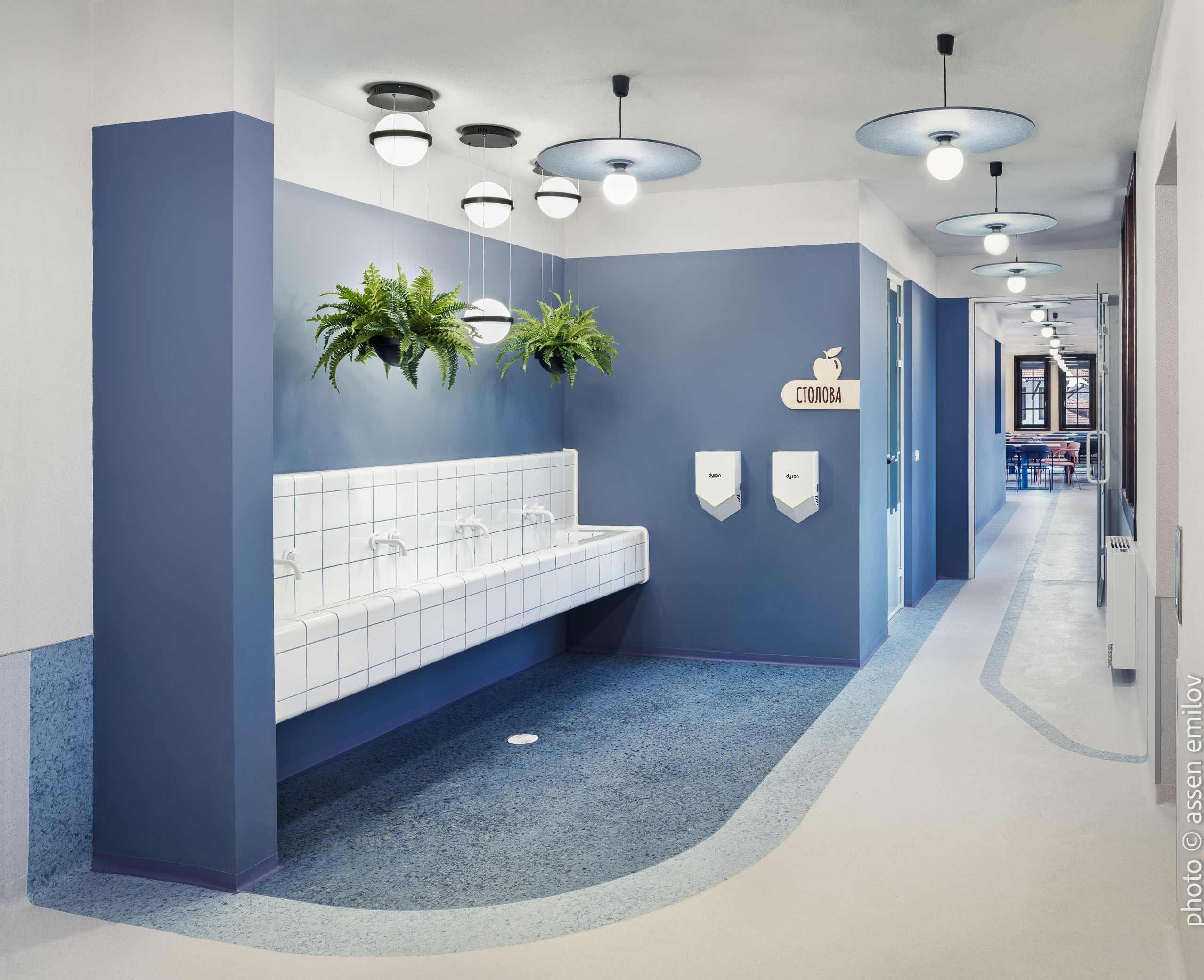 Проектът е вдъхновен от Валдорфската образователна традиция, където свободата на духа, хармонията и връзката с природата са водещи принципи. Затова всяка от класните стаи е създадена с мисъл за възрастовата група: при най-малките – топли тонове, меки форми и уютни пространства, а при по-големите – по-издължени помещения, изчистени линии и постепенно изсветляваща палитра. В предучилищните групи се появяват архетипните образи на „Дървото“ и „Къщата“. Артистична инсталация под формата на разперено дърво в центъра на помещенията, предразполага към общи занимания, а короната му от ефирен текстил, ще се сменя според сезона. „Къщата“ от своя страна е убежище за тишина и самостоятелни занимания, в което всяко дете намира своя малък кът за уединение. Масите на децата са ергономично съобразени и с трапецовидна форма, позволяваща множество различни подредби, както в затворен контур, така и на по-малки и разнородни групи. В класните стаи, черните дъски са вградени в единствената корпусна мебел в помещенията, която се явява основен цветови акцент. Подиумите в класните стаи, ориентирани по диагонал разчупват традиционната подредба и се превръщат в сцена за театър, музика и занаяти. В коридорите и залите специално място е отделено за детските рисунки и творби, превръщайки училището в непрекъснато обновяваща се галерия. //EN The project is inspired by the Waldorf educational tradition, where freedom of spirit, harmony, and a deep connection to nature are core principles. For this reason, each classroom has been designed with careful consideration of the children’s age group. Spaces for the youngest pupils feature warm tones, soft forms, and a strong sense of coziness, while classrooms for older children become more elongated, with cleaner lines and a gradually lightening color palette.