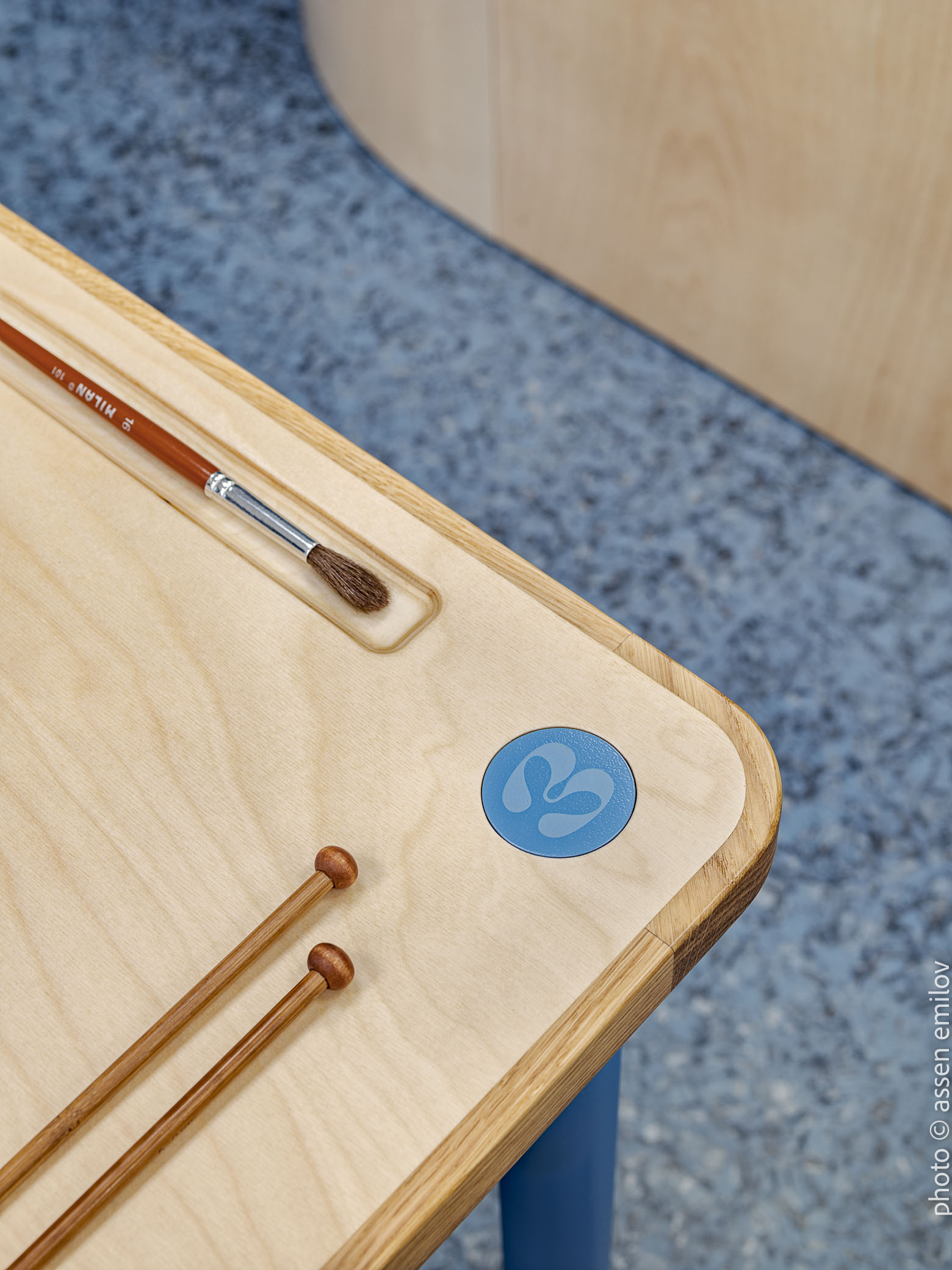 The children’s tables are ergonomically designed with a trapezoidal shape, allowing for multiple configurations—both in closed circular arrangements and in smaller, diverse groupings. In the classrooms, the blackboards are integrated into the only casework furniture element, which also functions as the main color accent within the space. Diagonally oriented platforms break away from traditional layouts and become stages for theater, music, and craft activities.