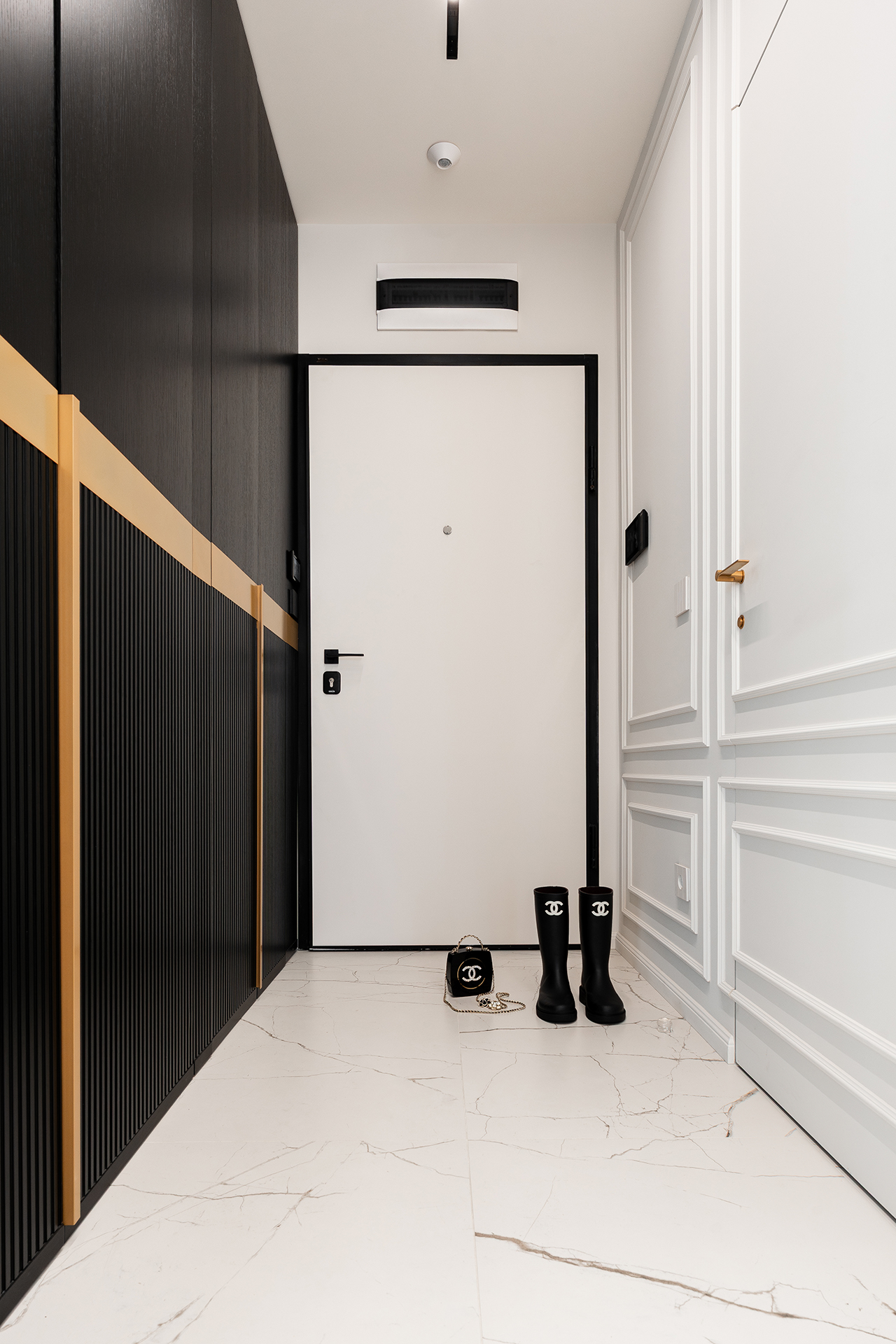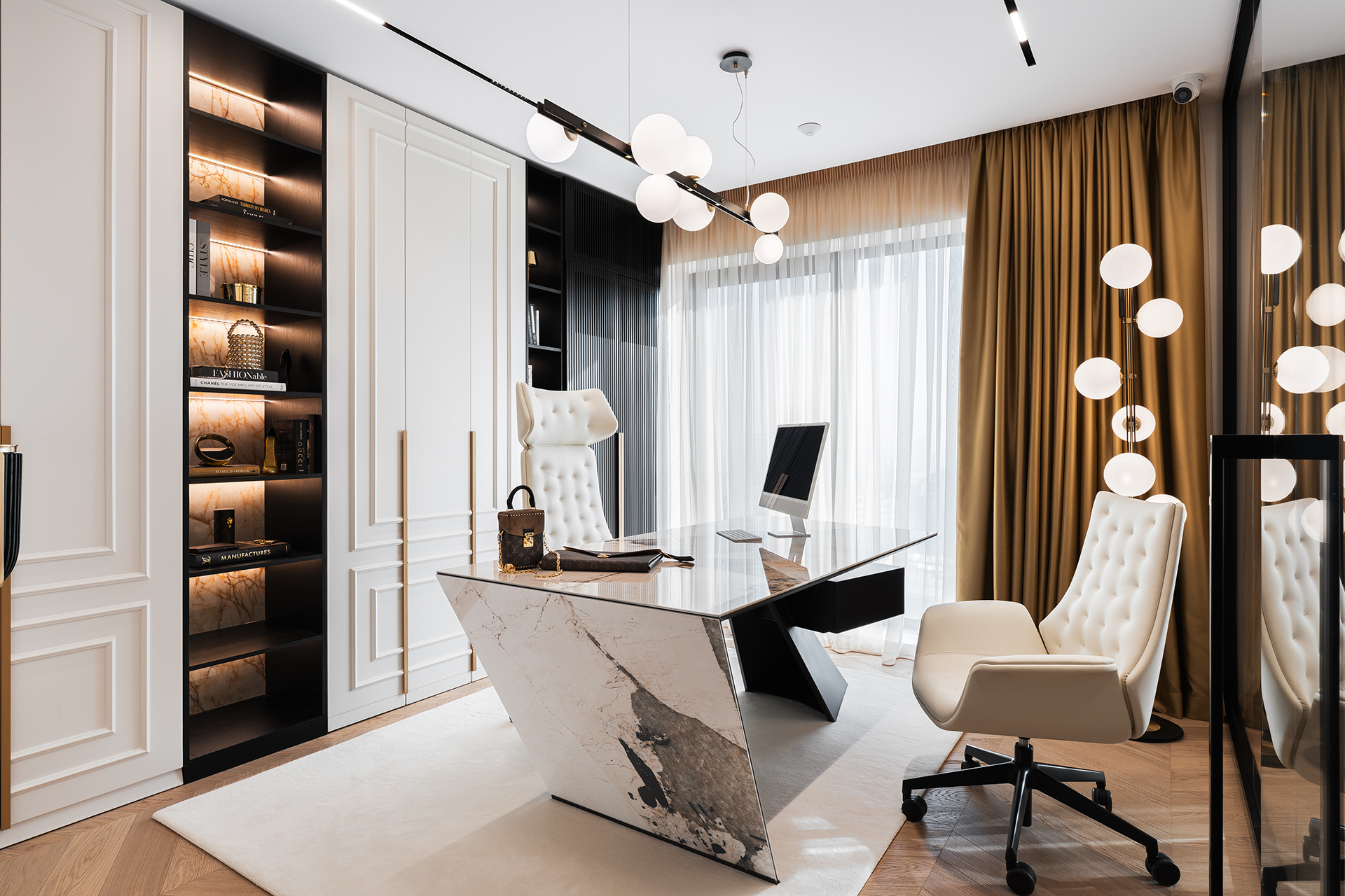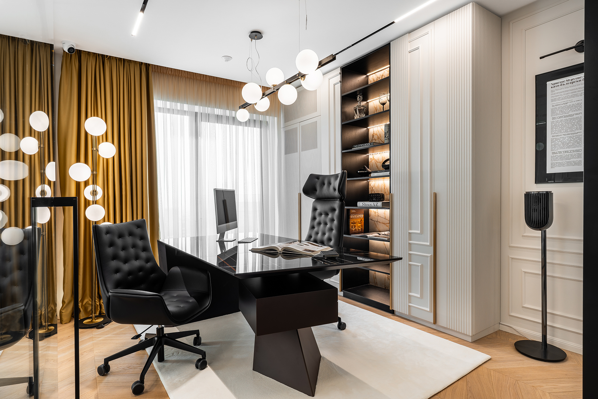 The project is a luxurious private office designed for a husband and wife, built around the philosophy of Yin and Yang. The color concept of the spaces reflects a careful balance between opposing elements, creating harmony throughout. The male office is dominated by deep black tones, conveying strength, focus, and precision, while the female office contrasts with light, soft shades that evoke a sense of ease, warmth, and elegance. Despite the contrast, the philosophical concept of Yin and Yang is expressed in both offices through the inclusion of opposite colors – black in the female office and light tones in the male – emphasizing balance and mutual harmony.