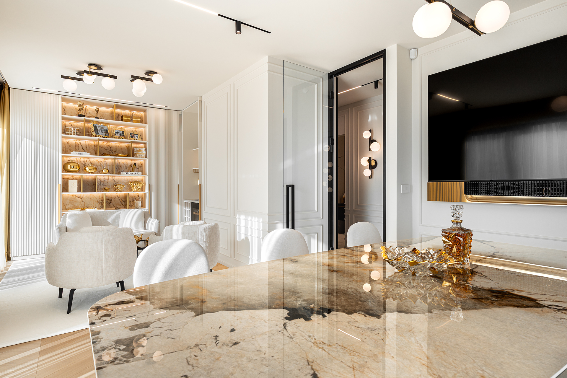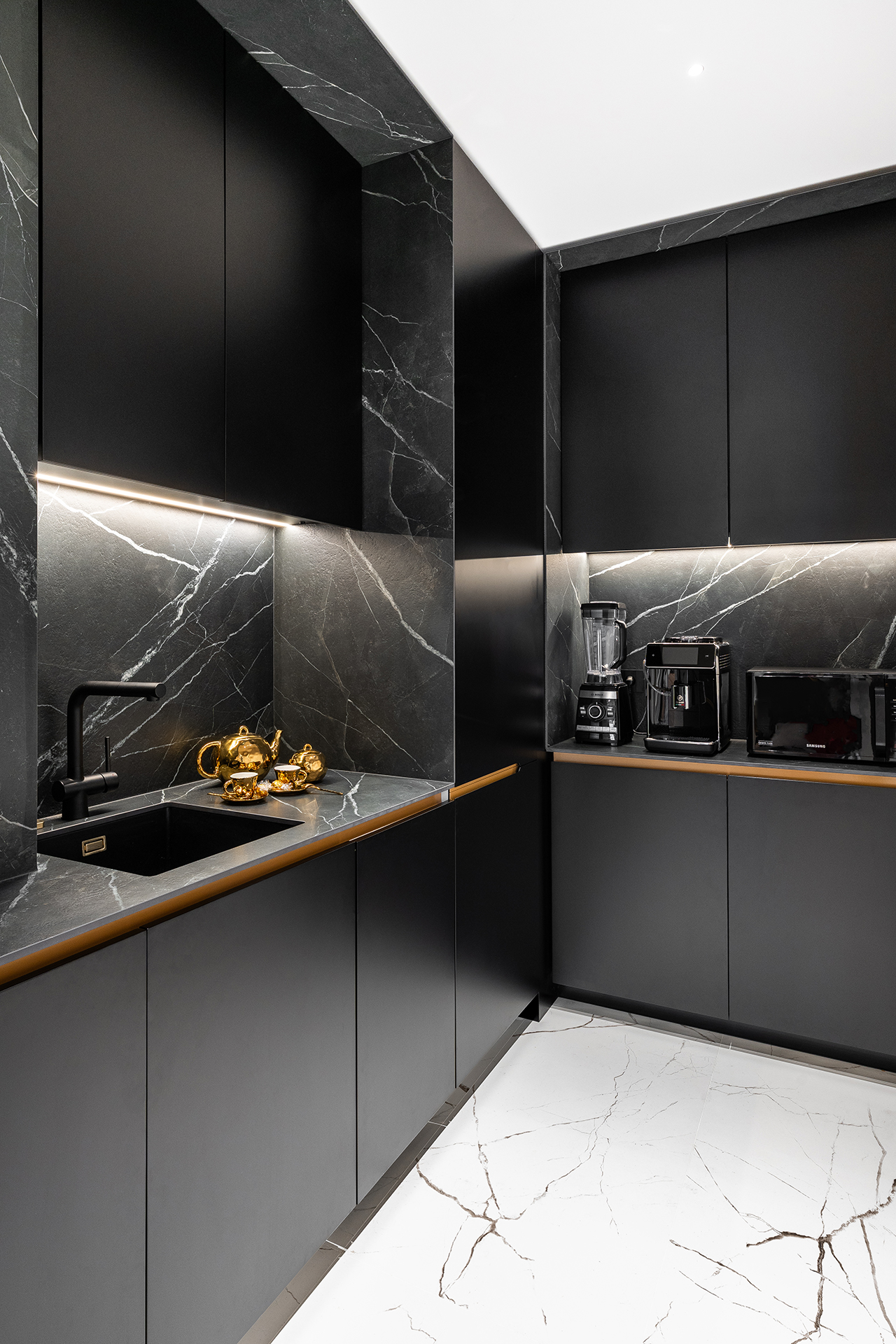 Акцентите са поставени с изящни златни метали, които създават усещане за лукс и естетическа завършеност, без да натрапват визуално. В проекта са използвани висококласни италиански изделия и материали – мрамор с деликатни жилки, текстили от естествени влакна, метални елементи с златист финиш, които подчертават вниманието към детайла. Цялостният дизайн е комбинация от съвременни и класически елементи, които придават непреходна елегантност, функционалност и комфорт, превръщайки офис пространствата не просто в работни зони, а в истински лични оазиси на стил и хармония./