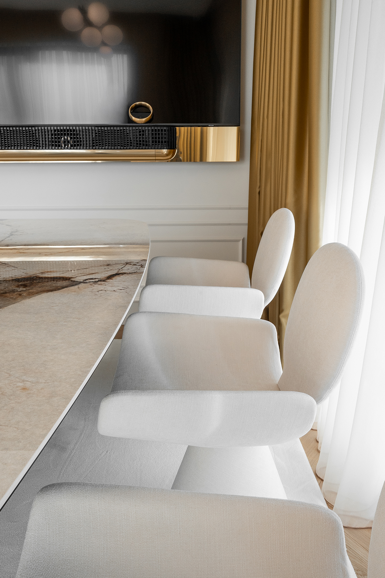 Accents are applied through refined gold metallic elements, which bring luxury and aesthetic sophistication without overwhelming the design. The project employs high-end Italian products and premium materials, including delicately veined marble, natural fiber textiles, and metallic details in gold finishes, highlighting meticulous attention to detail. The overall design merges contemporary and classical elements, creating a timeless elegance that combines functionality with comfort. These offices transcend the purely functional, transforming into personal sanctuaries that embody style, balance, and harmony, while reflecting the unique identities of their occupants.