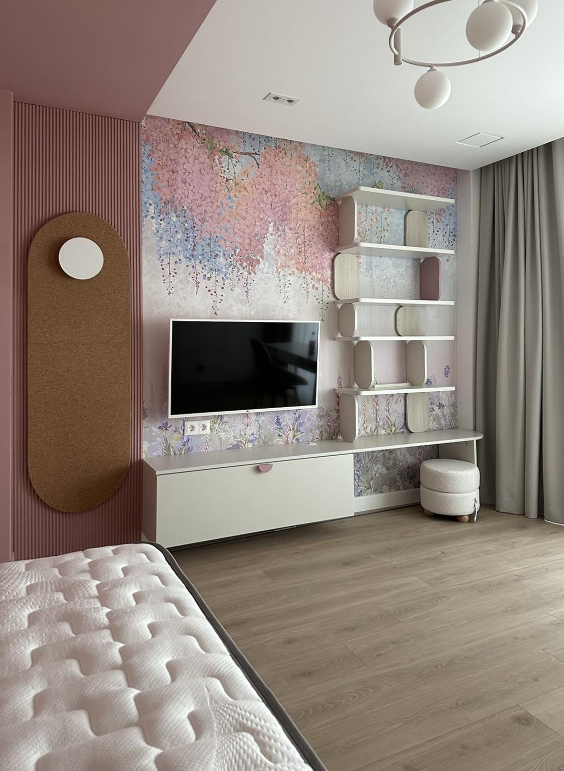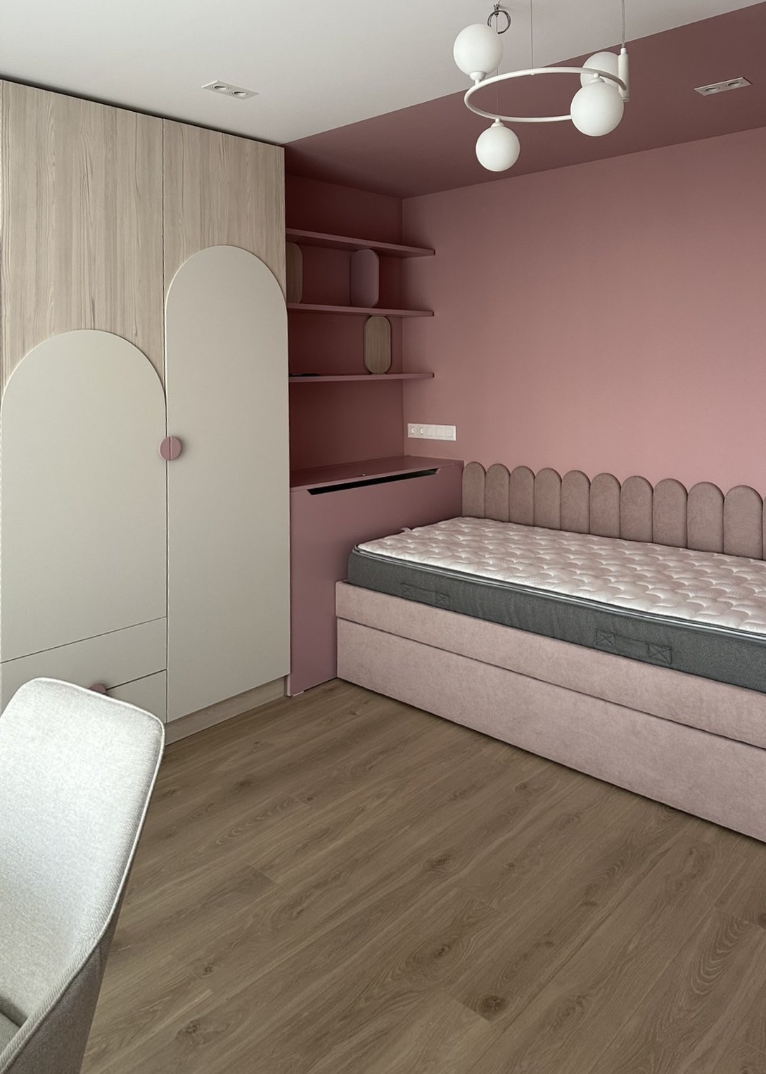 Тази модерна детска стая, създадена от нас, впечатлява с нежна розова гама и уютна атмосфера. Пространството е проектирано с внимание към детайла, съчетавайки функционалност и меко, приветливо усещане, което превръща стаята в сигурно и вдъхновяващо място за игра и почивка.