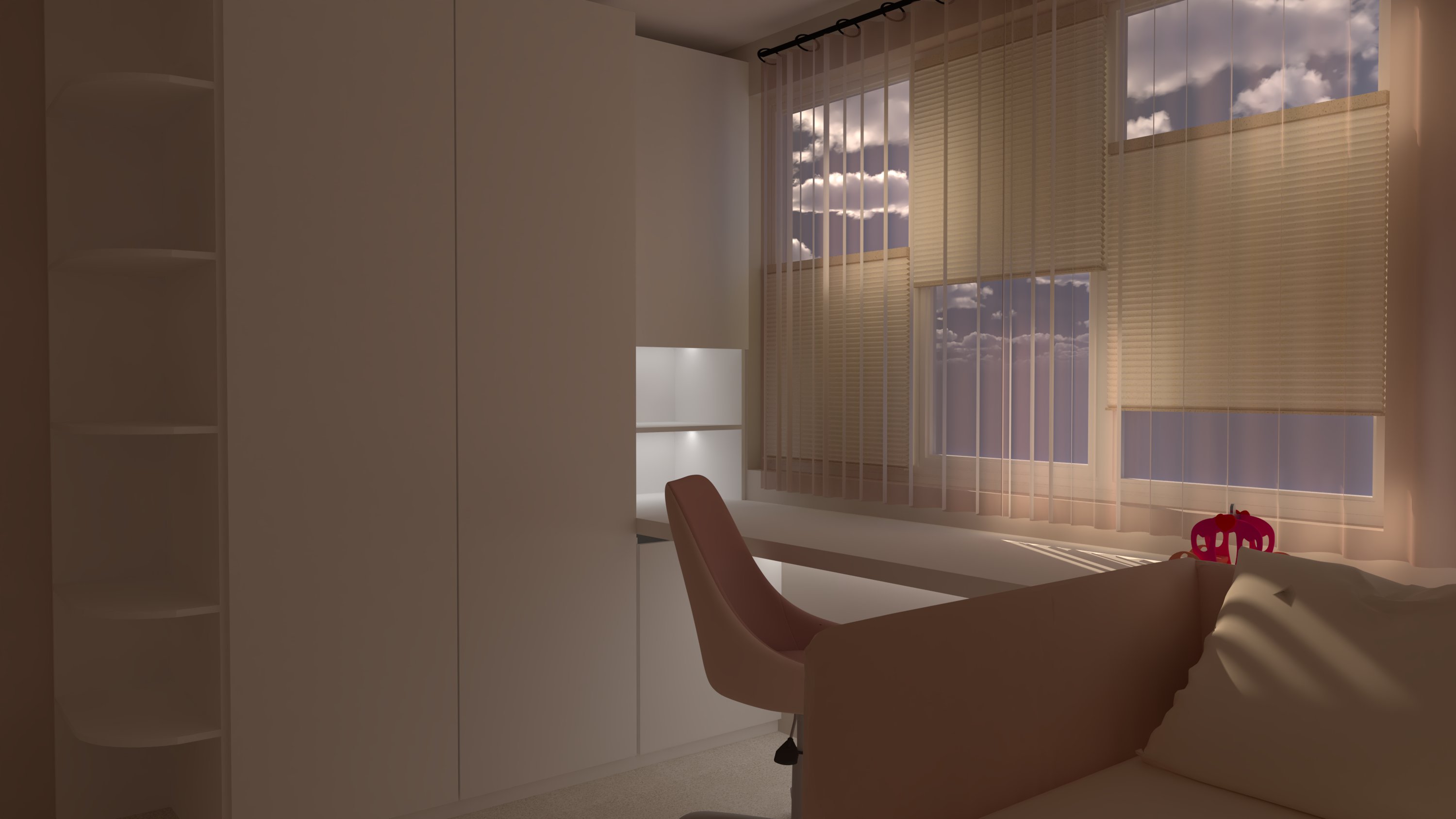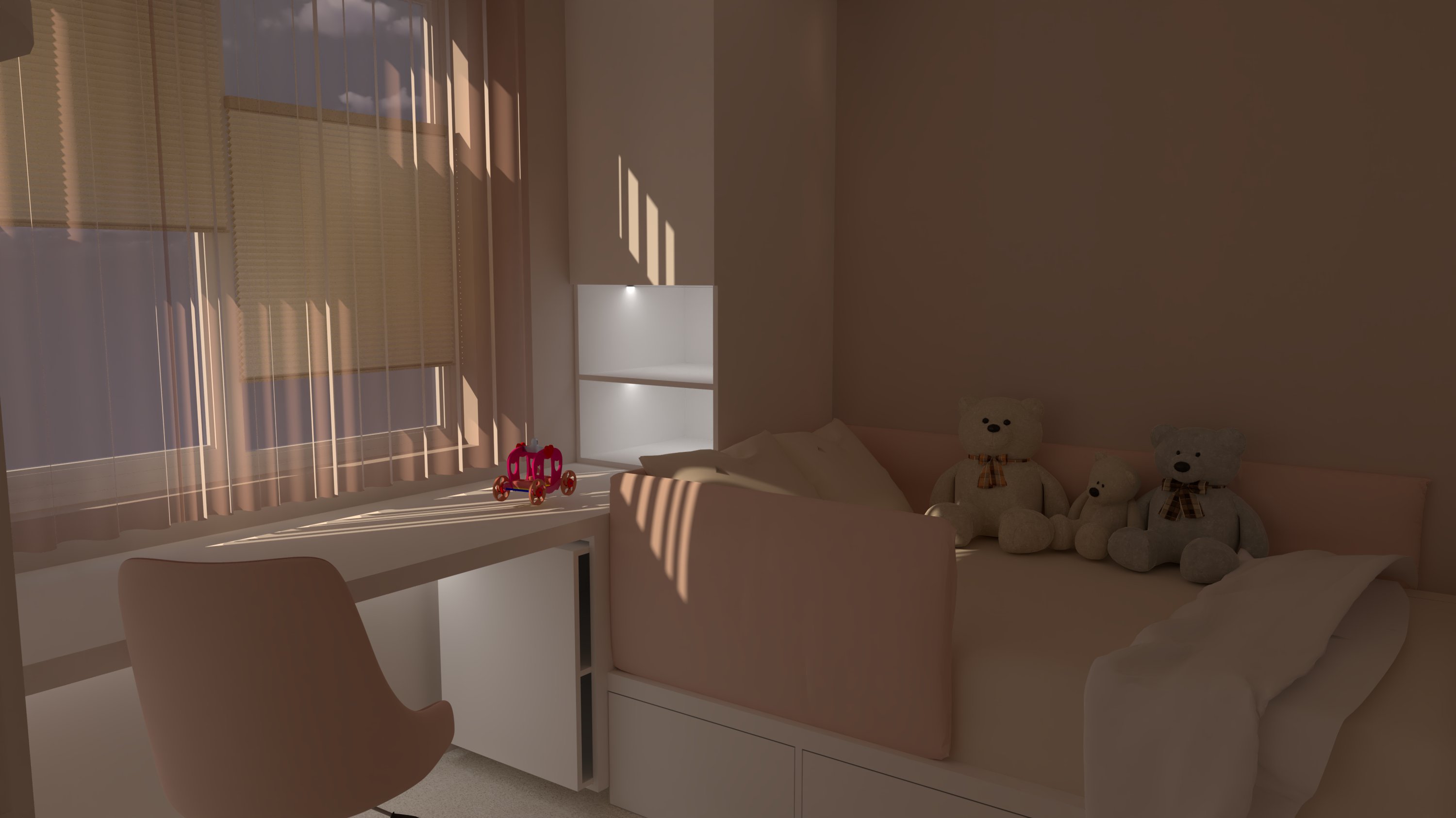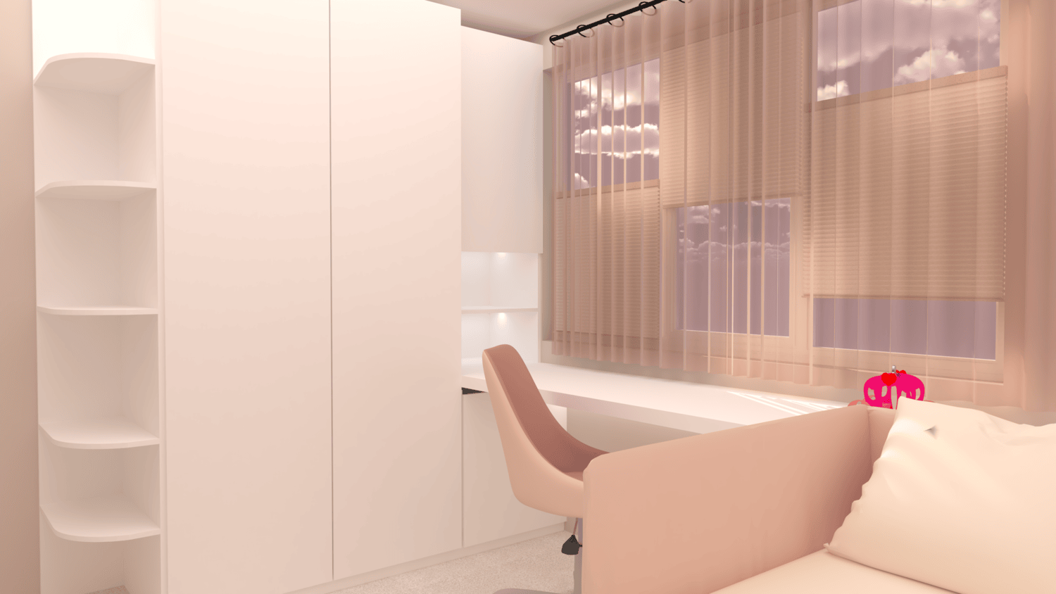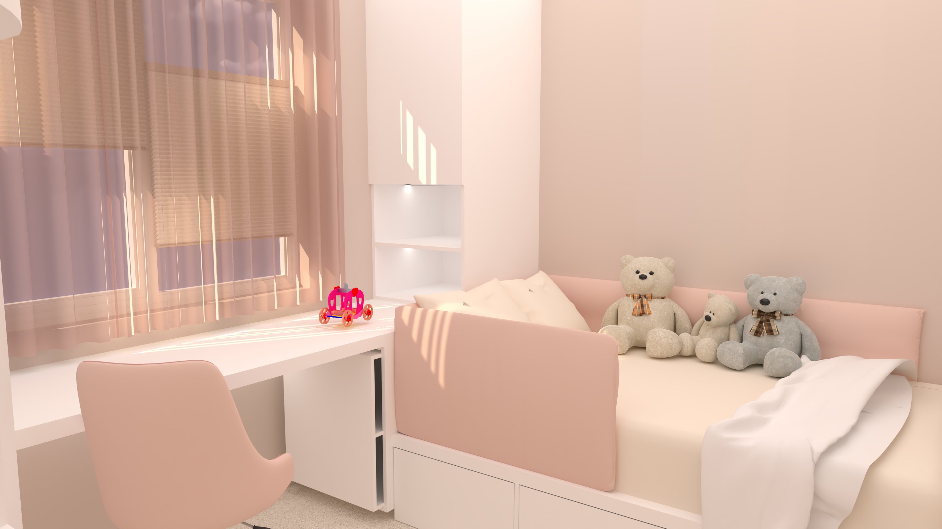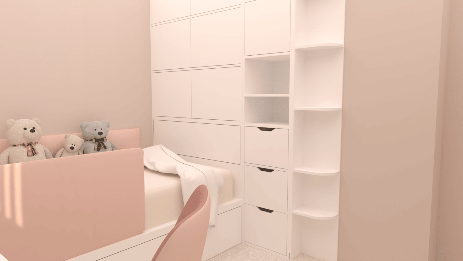По желание на клиента, приоритет беше да осигурим достатъчно място за съхранение на играчки, като същевременно създадем пространство с потенциал да се превърне в уютен ученически кът.