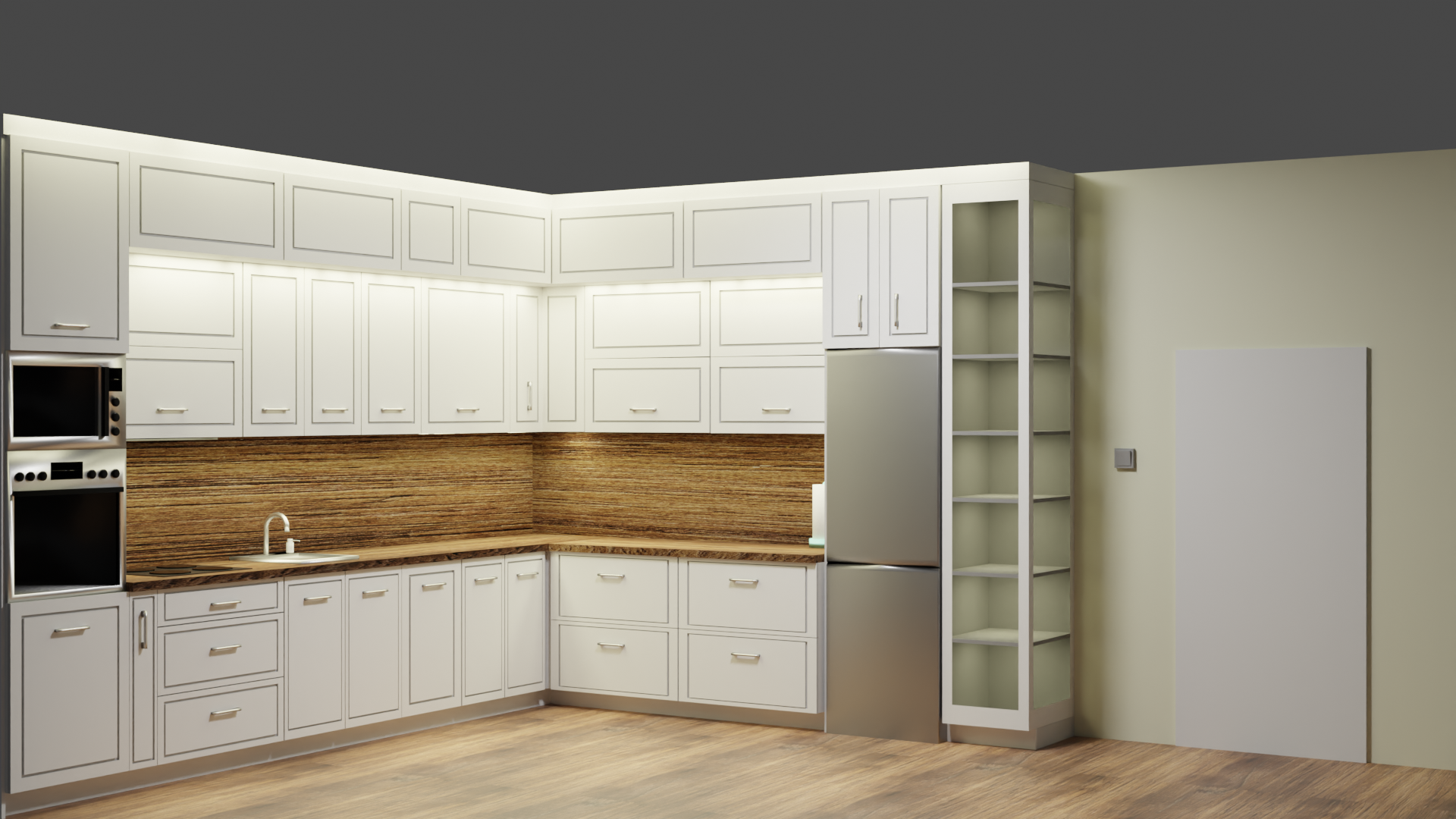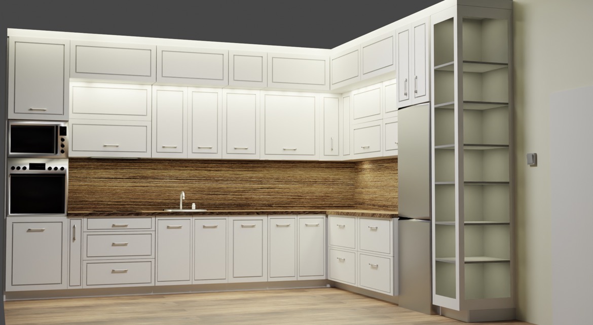 Проектът представлява дизайн на кухня, направена по поръчка на програмата “Blender”. Дизайнът бива изработен по точните размери на помещението, в което ще се намира кухнята.