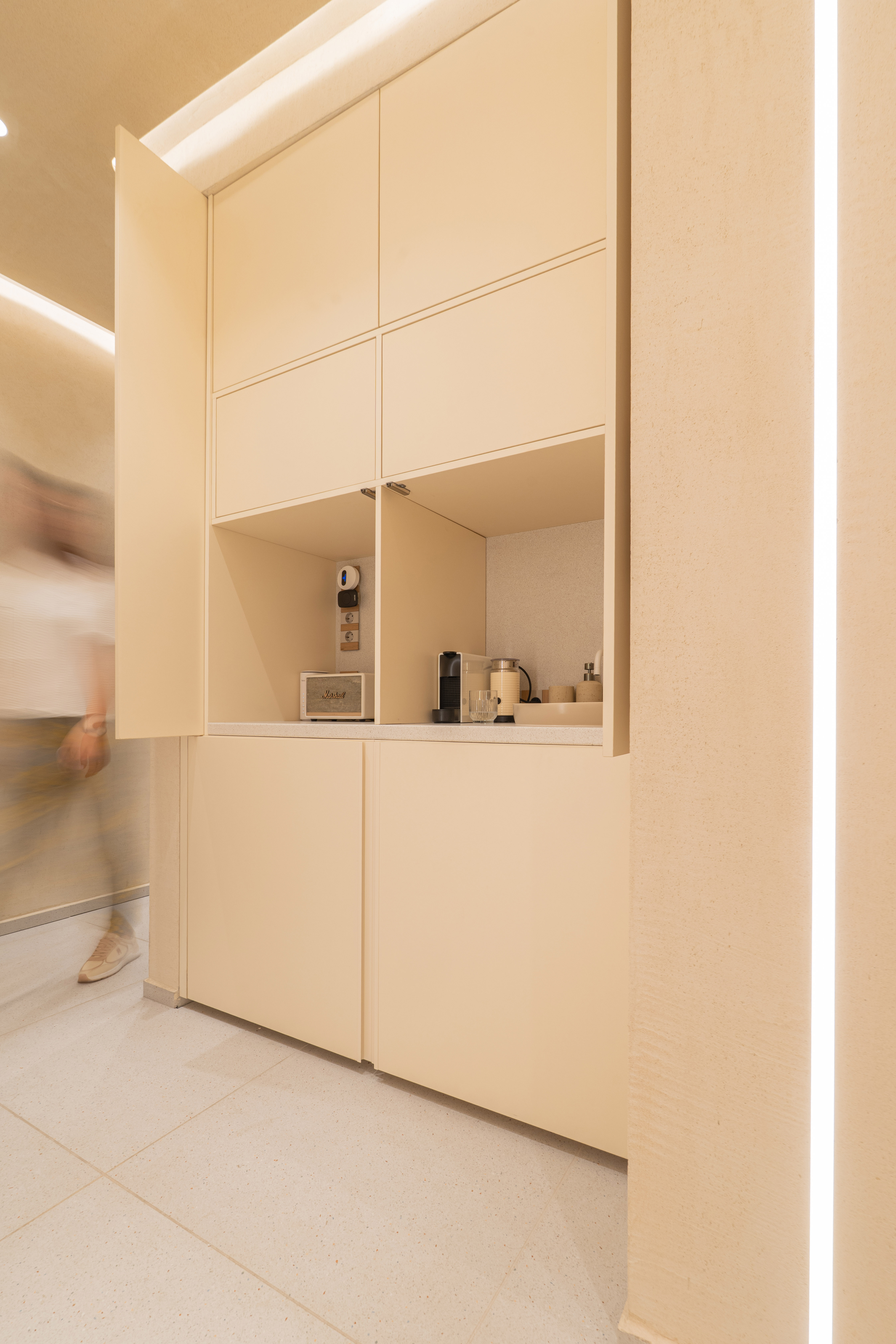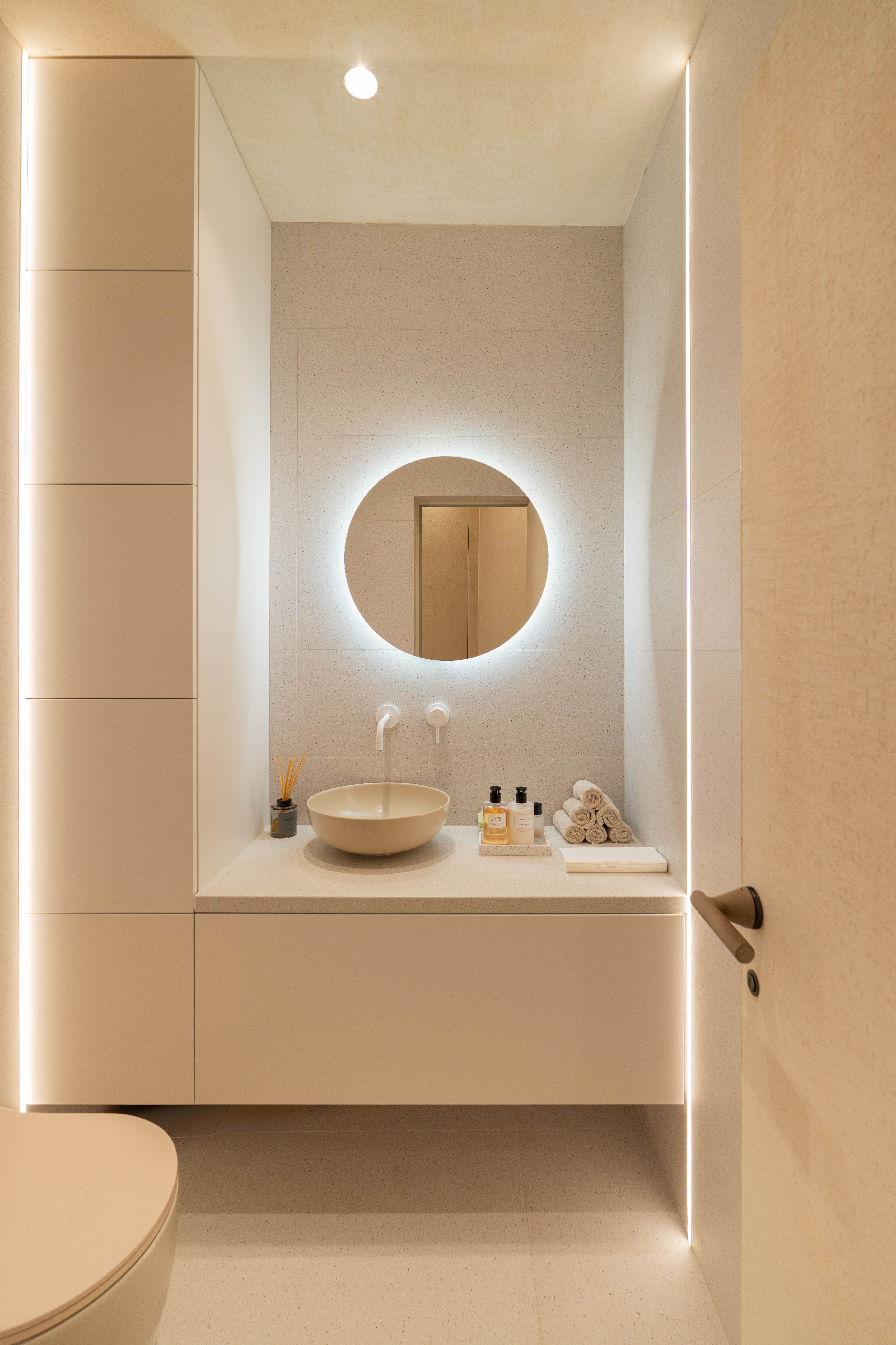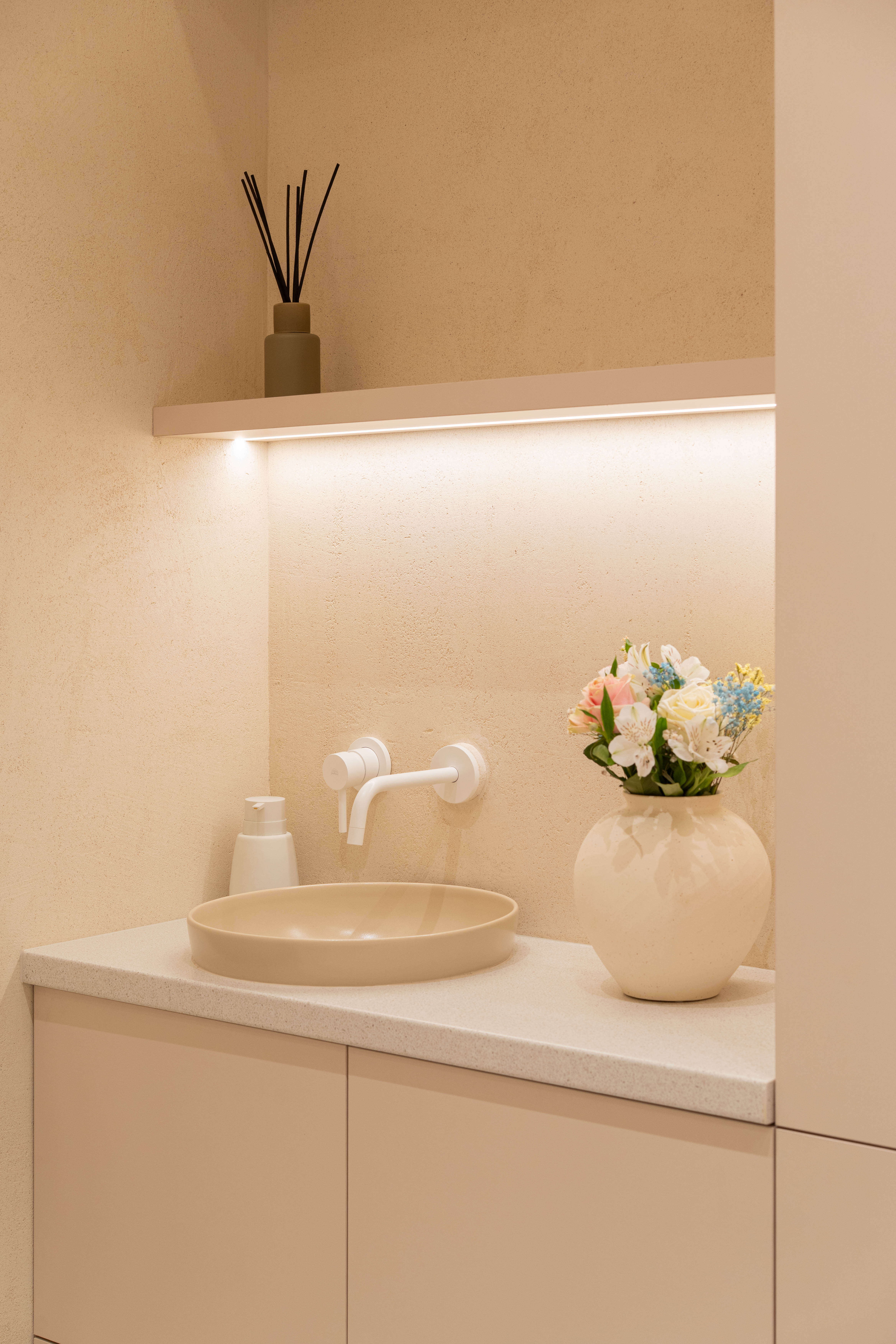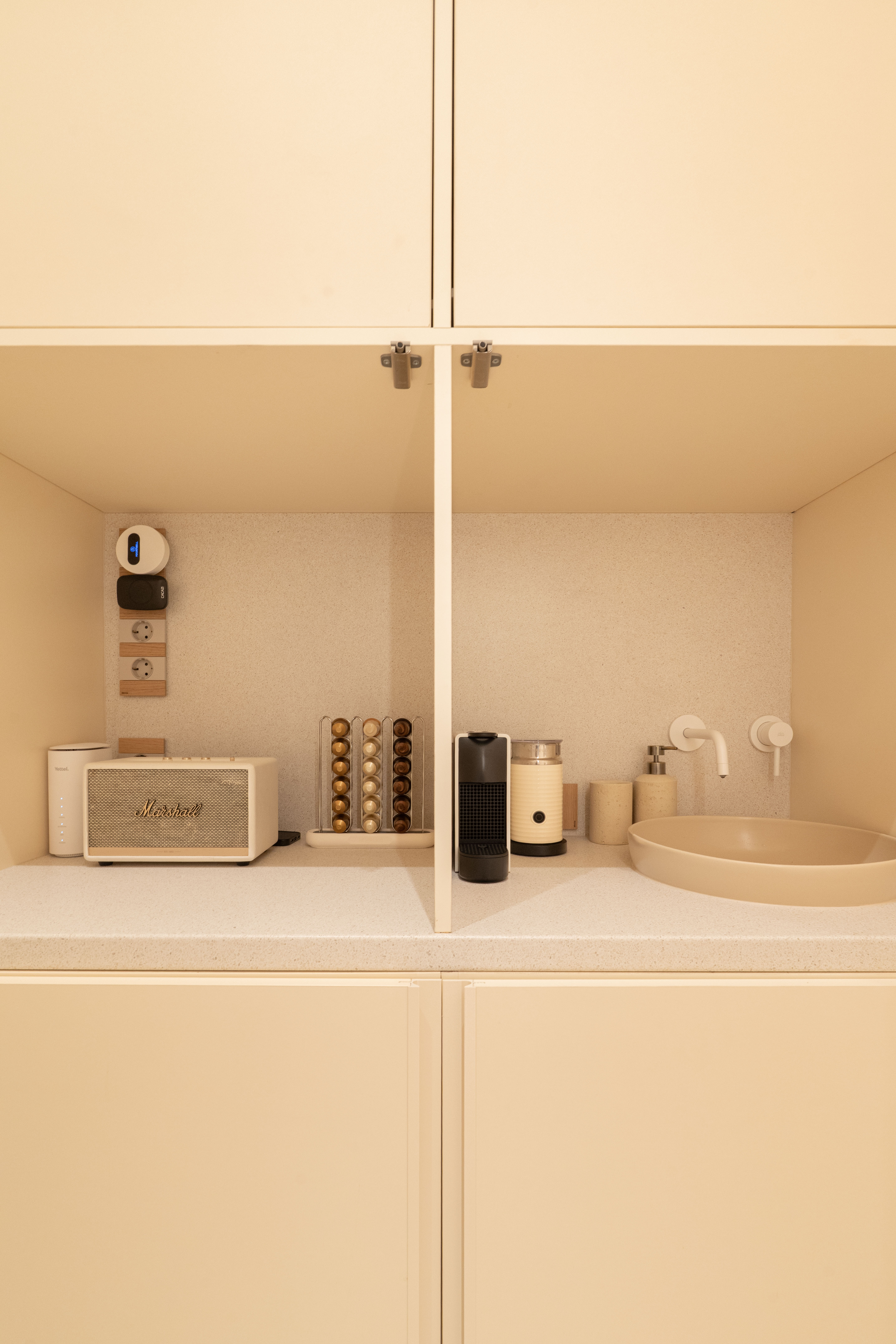 Vintage Dolls е минималистична концепция, в три цветови нюанса в различни материали и текстури - различен поглед върху комбинациите и възможностите им. Реорганизирани бяха 37 м2 в 5 помещения, посредством изграждането на нови преградни стени. Светлината е проектирана, на кръгове, за да служи спрямо нуждите, но и същевременно да акцентира върху основните точки в дизайна и да води клиента навътре в помещенията. Използваните материали са естествена мазилка върху стените и таваните, която въпреки неравномерната си текстура придава много уют и комфорт, anti-slip гранитогрес тип мозайка на пода, дръжки изработени изцяло от бетон с покритие против отпечатъци, ключове и контакти с вложка от естествен дъб, и санитария отразяваща меките цветове и текстури в интериора. Всички мебели са вградени и проектирани за пространството. Бюджетът е 65000 лв. Vintage Dolls is a minimal concept, in three colour nuances in different materials and textures - a diverse range of combinations and their possibilities. 37 m2 of total area was reorganized into 5 rooms, by building new partition walls. The light is designed in electric circles, to serve the needs, but at the same time to emphasize the main points in the design and lead the client into the space. The materials used are natural plaster on the walls and ceilings, which despite its uneven texture gives a lot of coziness and comfort, anti-slip terrazzo tiles on the floor, handles made entirely of concrete with a fingerprint-resistant coating, switches and sockets with a natural oak inset, and sanitary ware reflecting the soft colors and textures in the interior. All furniture is built-in and designed for the space. The budget is 65000 BGN.
