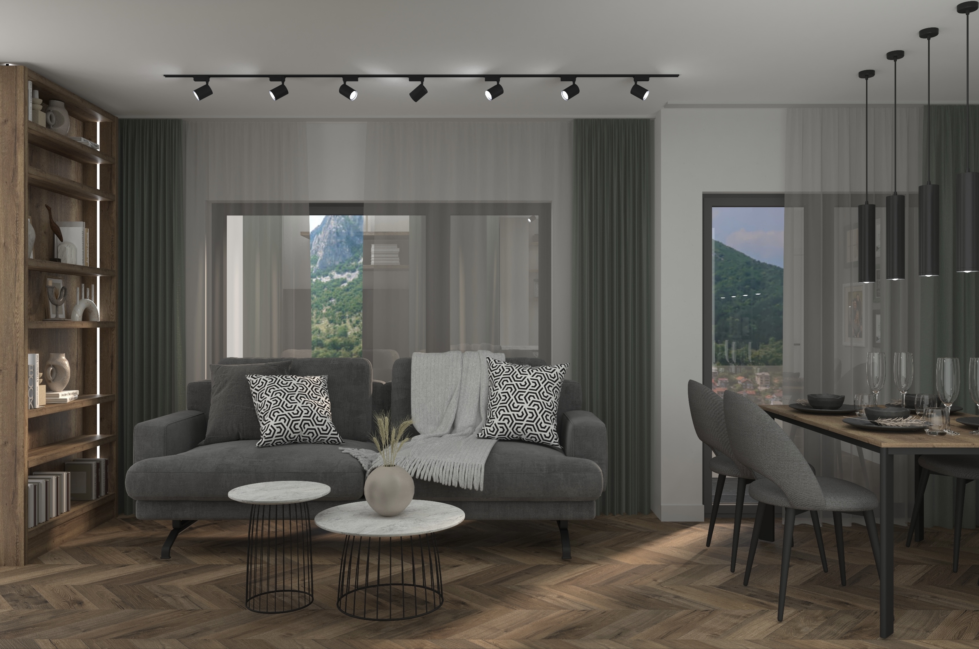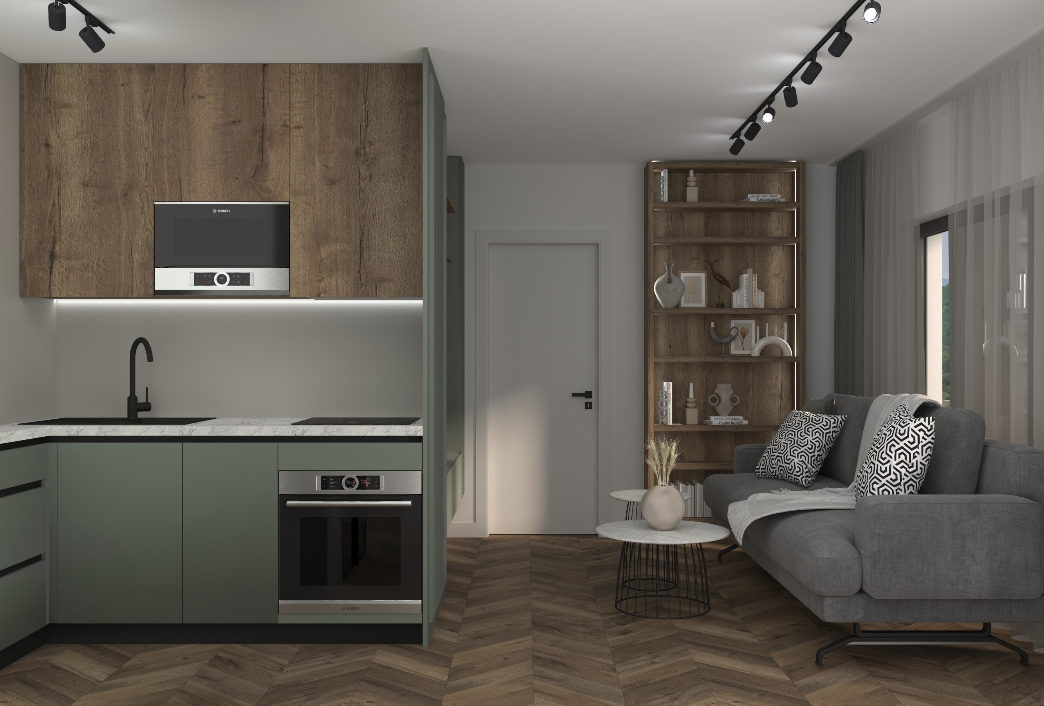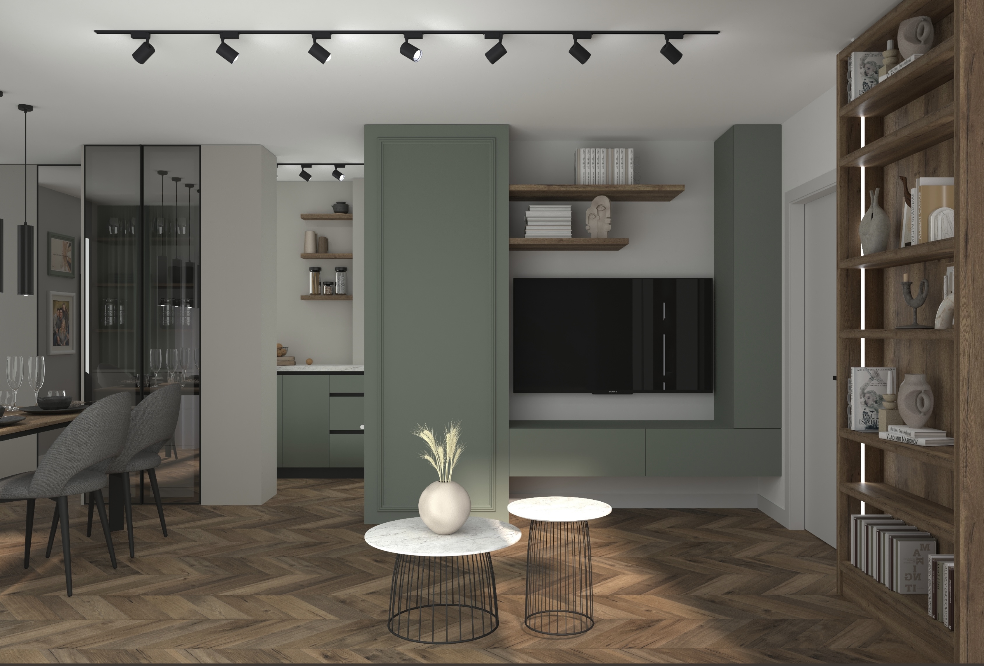 Тази 3D визуализация, създадена от нашия екип, представя интериорна концепция, обединена от един водещ цвят – маслинено зелено. Кухнята, дневната и трапезарията са оформени като едно хармонично пространство, в което цветът създава усещане за спокойствие и завършеност. Детската стая следва същата цветова линия, адаптирана към нуждите на най-малките. Проектът показва как малките пространства могат да бъдат оптимизирани по най-добрия начин, без компромис с функционалността и стила.