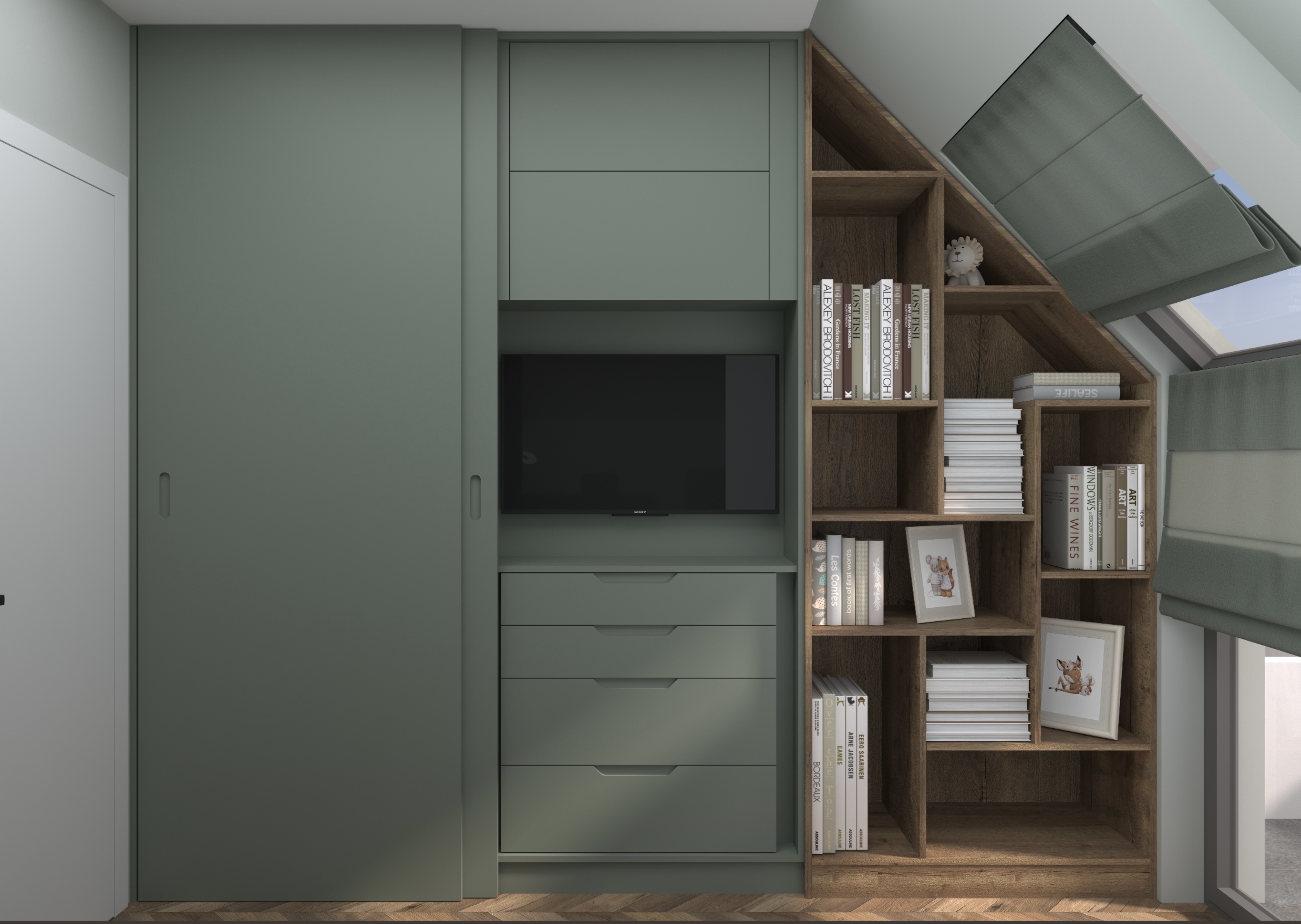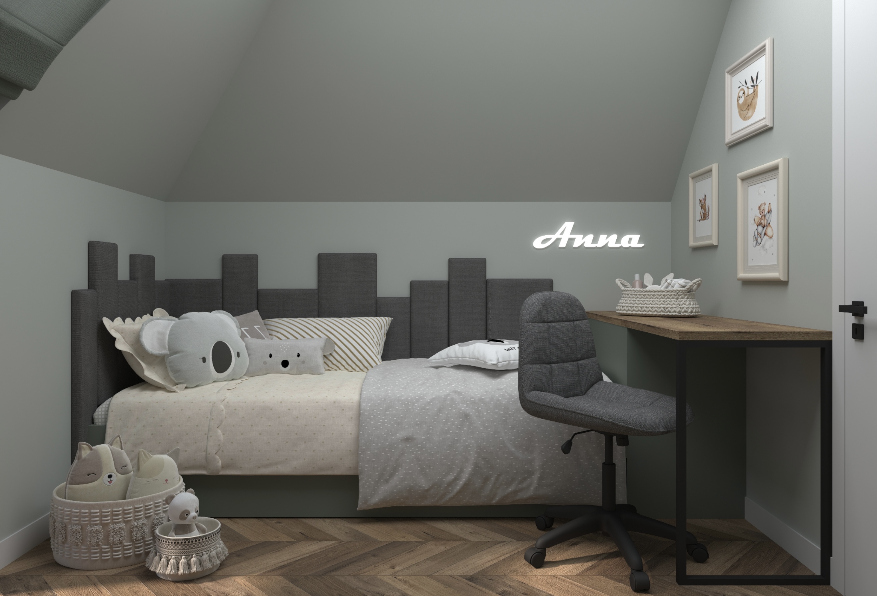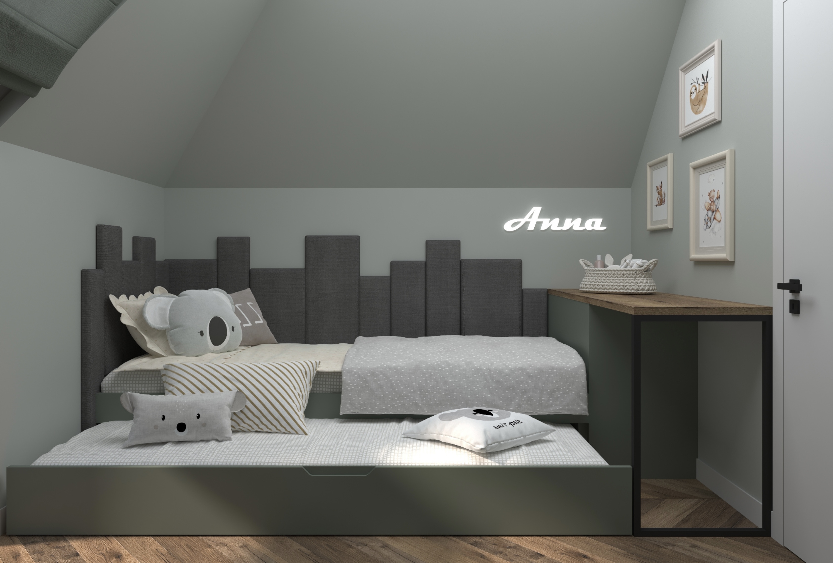 Тази 3D визуализация, създадена от нашия екип, представя интериорна концепция, обединена от един водещ цвят – маслинено зелено. Кухнята, дневната и трапезарията са оформени като едно хармонично пространство, в което цветът създава усещане за спокойствие и завършеност. Детската стая следва същата цветова линия, адаптирана към нуждите на най-малките. Проектът показва как малките пространства могат да бъдат оптимизирани по най-добрия начин, без компромис с функционалността и стила.