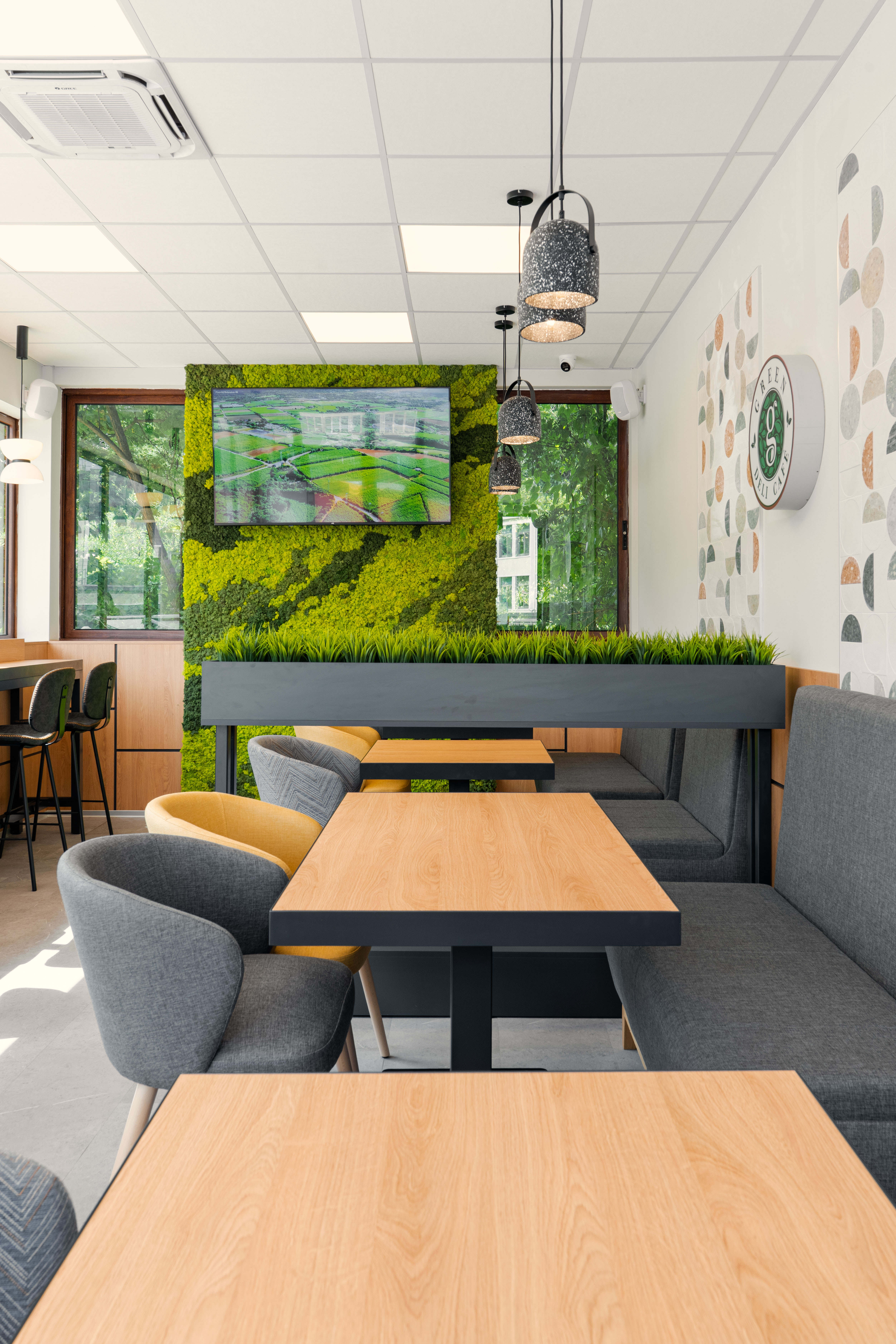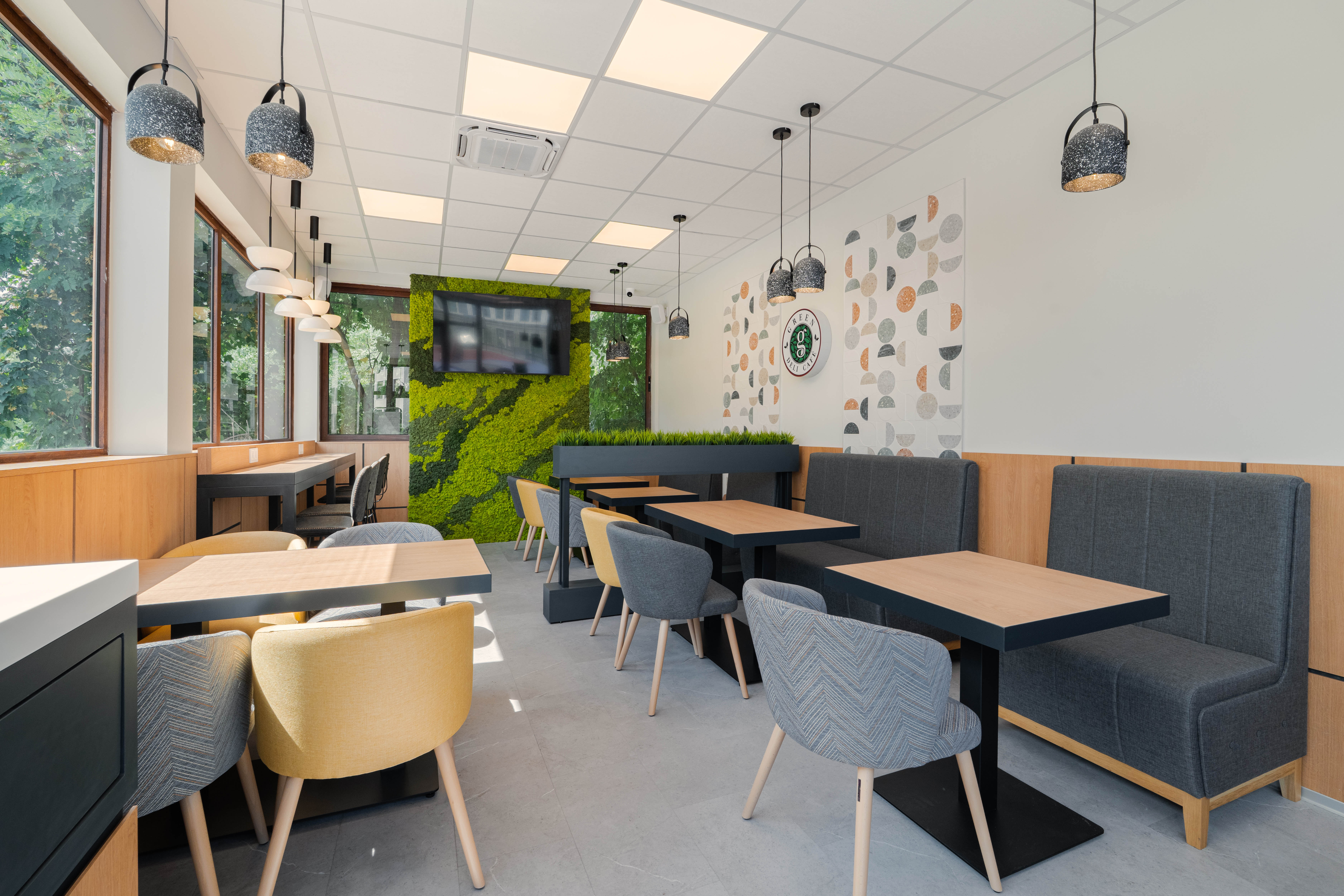 Нарекохме това уютно помещение Green Deli Lounge, тъй като съчетава познатите ни палитри, но с няколко нови акцента. Заведението е на платформа и се открива чудесна гледка към планина Витоша, което го прави много спокойно и свежо.