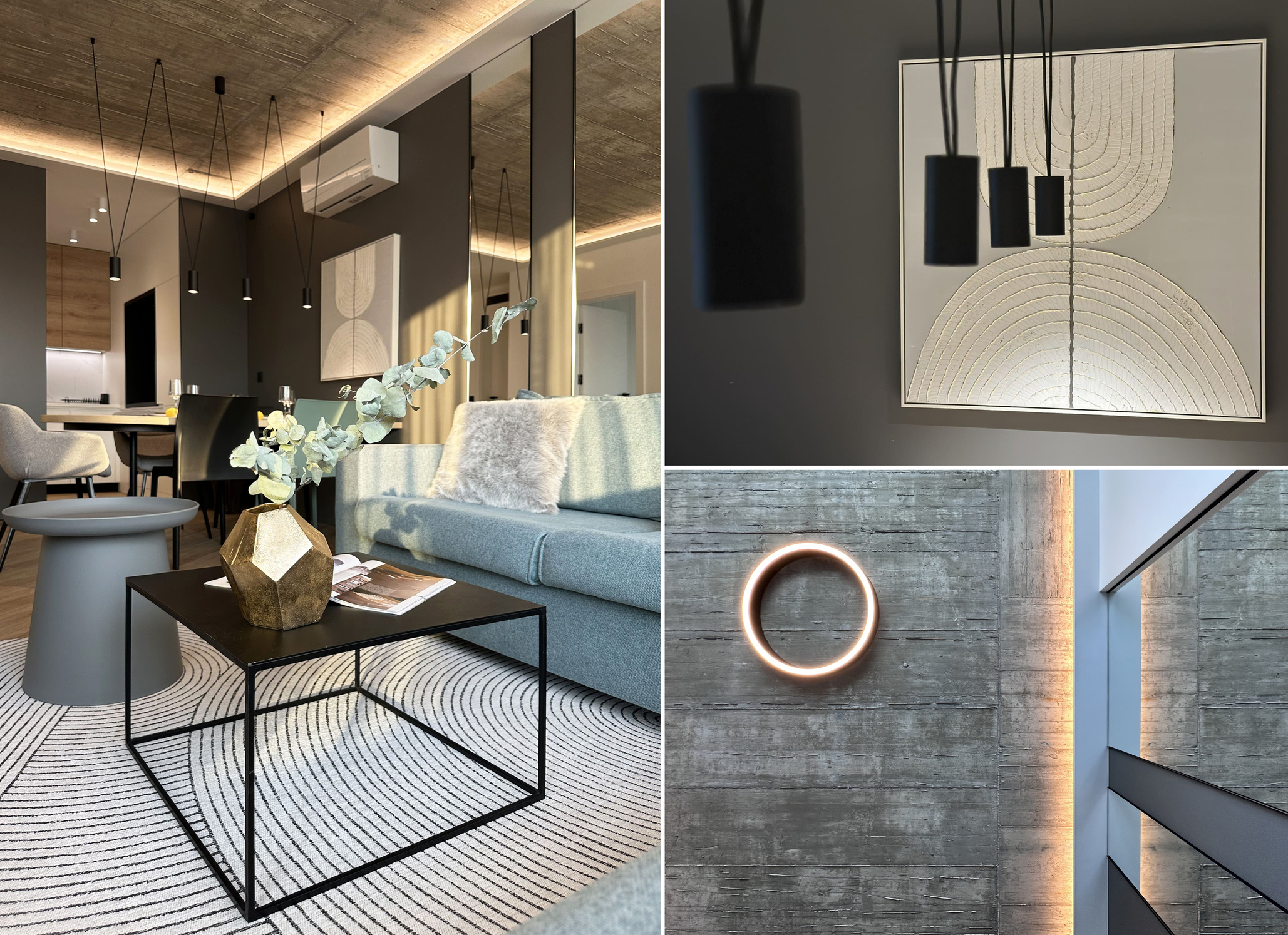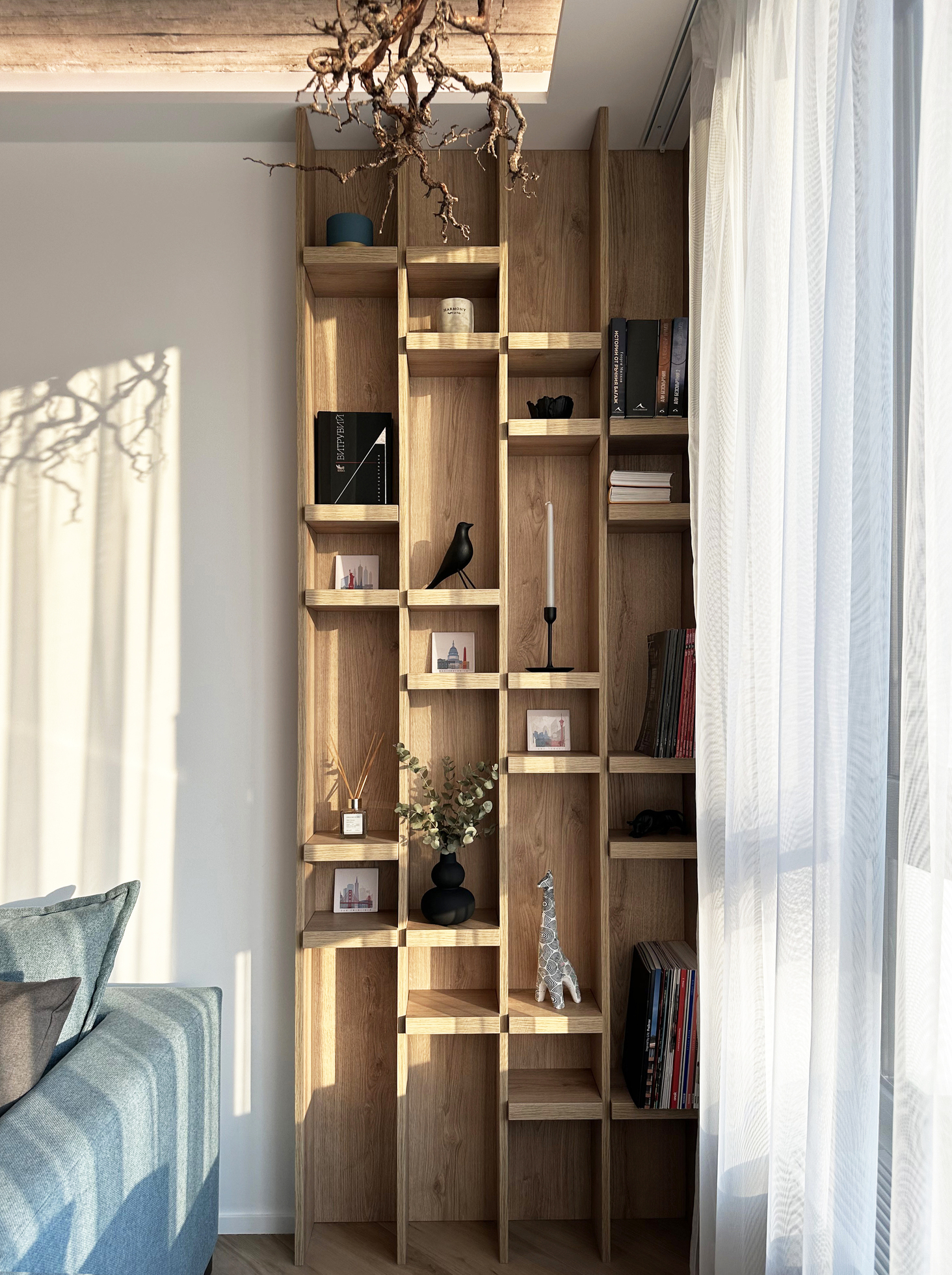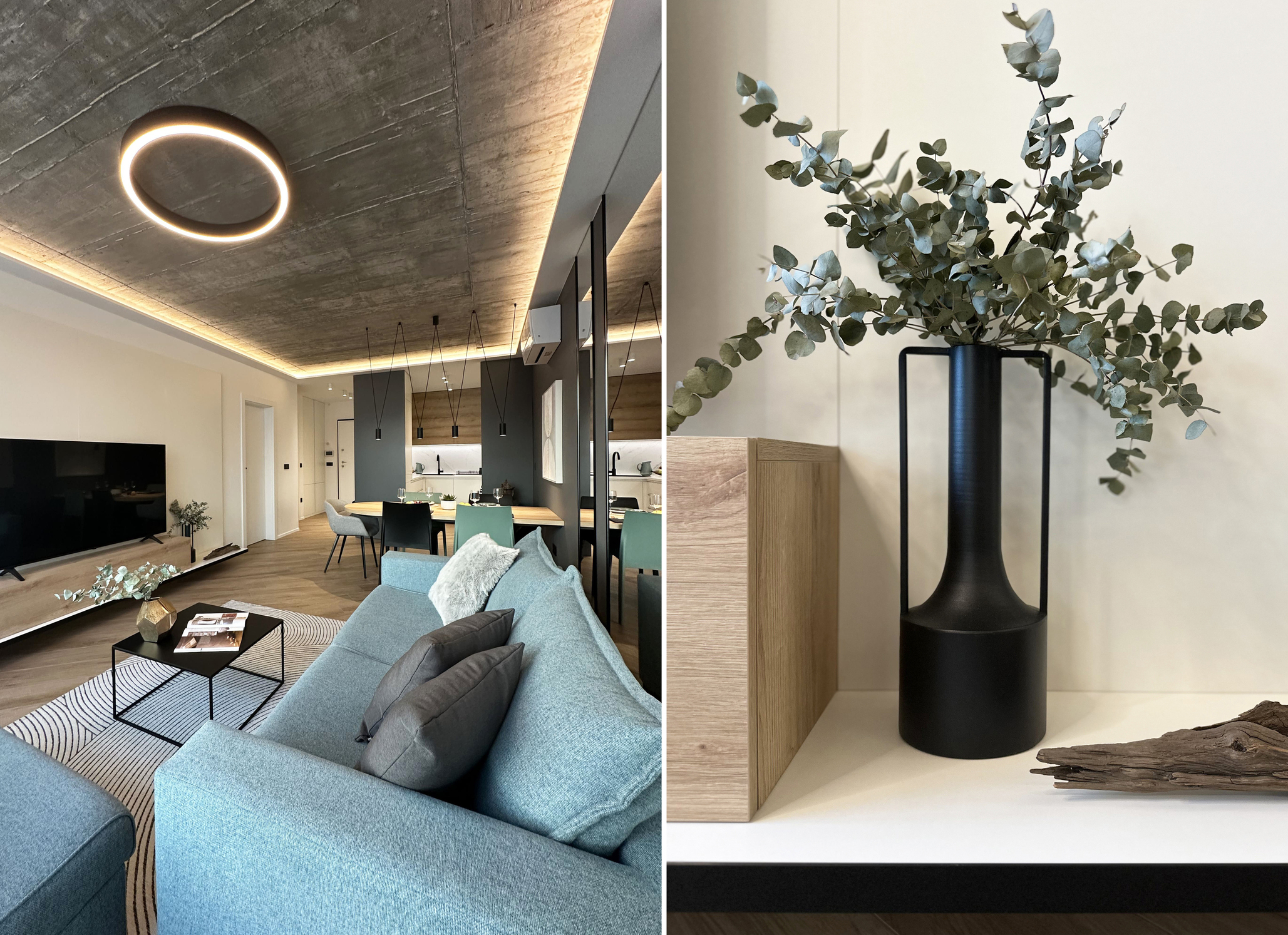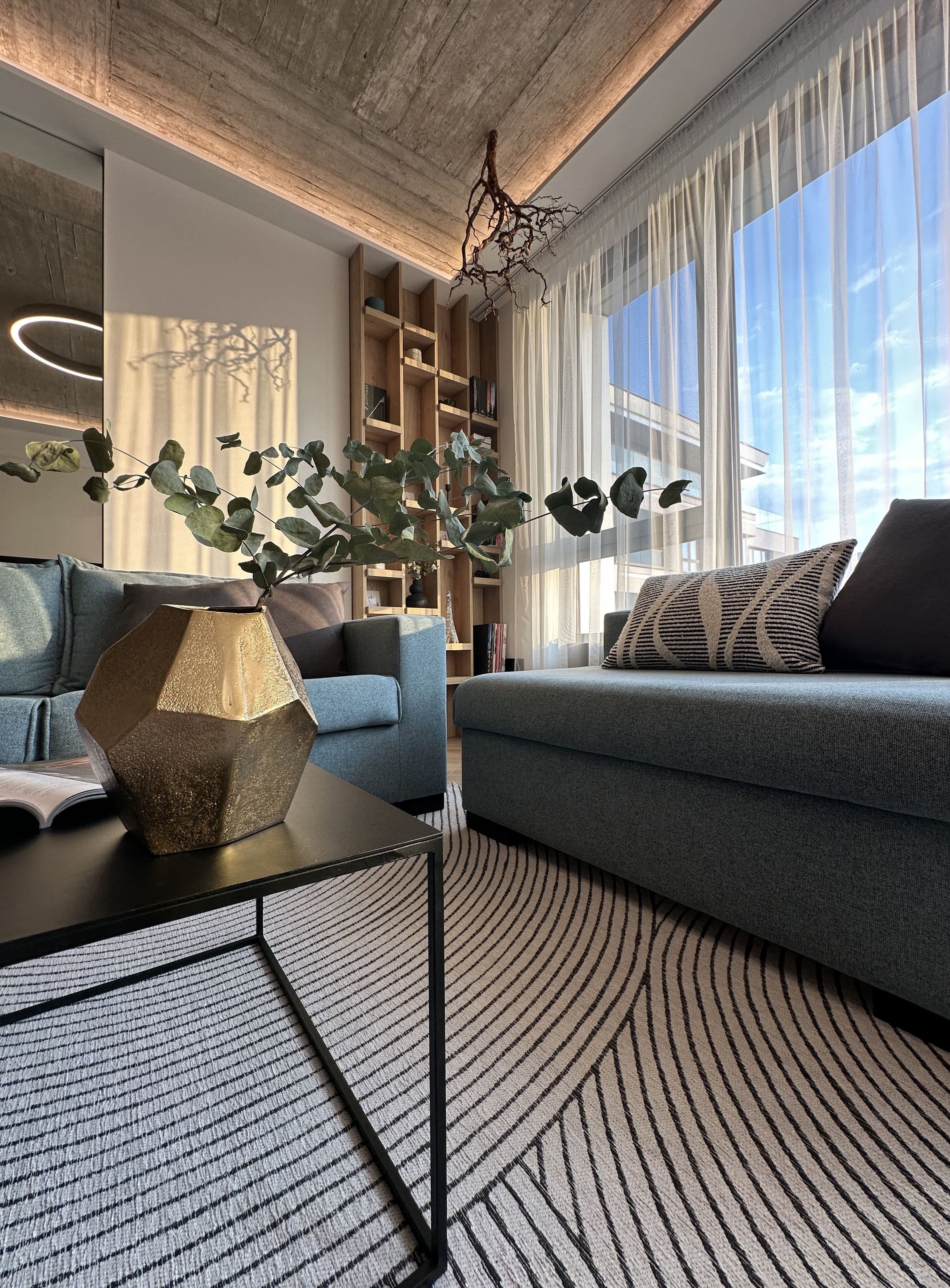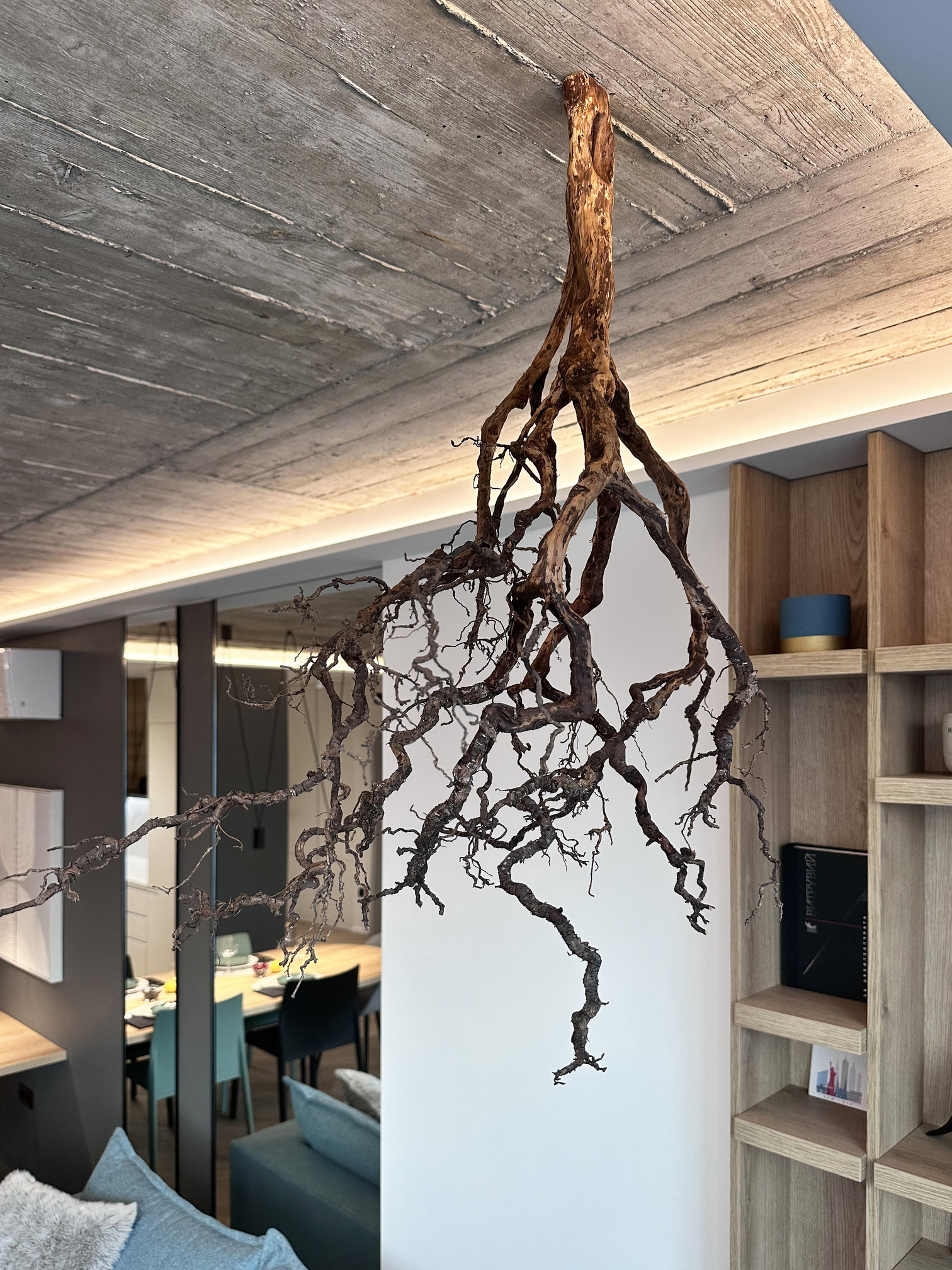The exposed concrete ceiling serves as a strong visual accent in the living room. During construction, lighting outlets were intentionally left within the concrete slab. Its combination with tree roots decorative elements adds warmth to the atmosphere and creates a distinctive and unique character.
