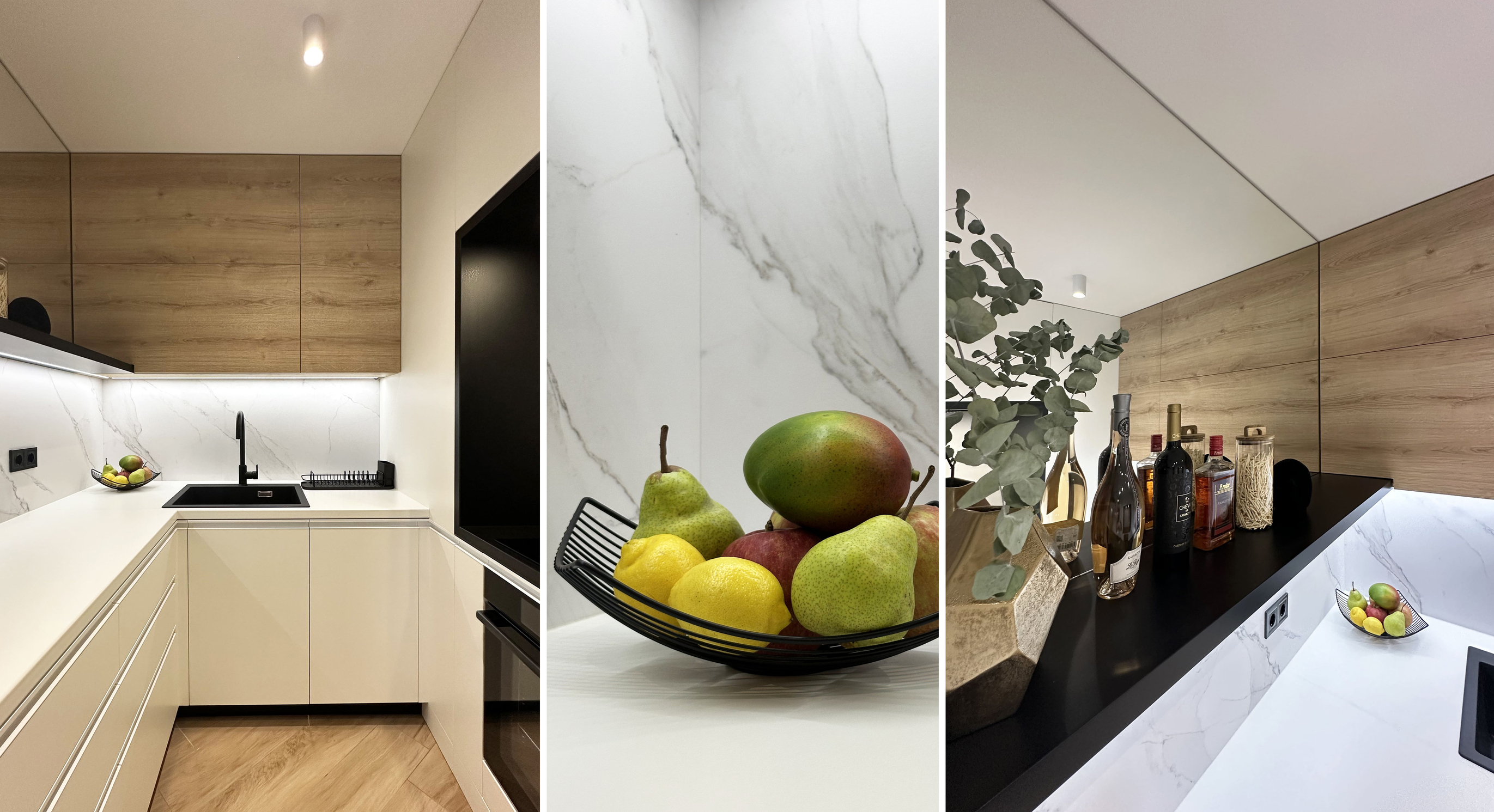 The dining table was designed with a single leg, while the weight of the tabletop is supported by wall mounting. The kitchen is visually separated from the living area, yet remains integrated into the open space through MDF side panels finished in the same dark grey tone as the dining area walls. To visually enlarge the space, a large mirrored back was installed above the kitchen worktop.