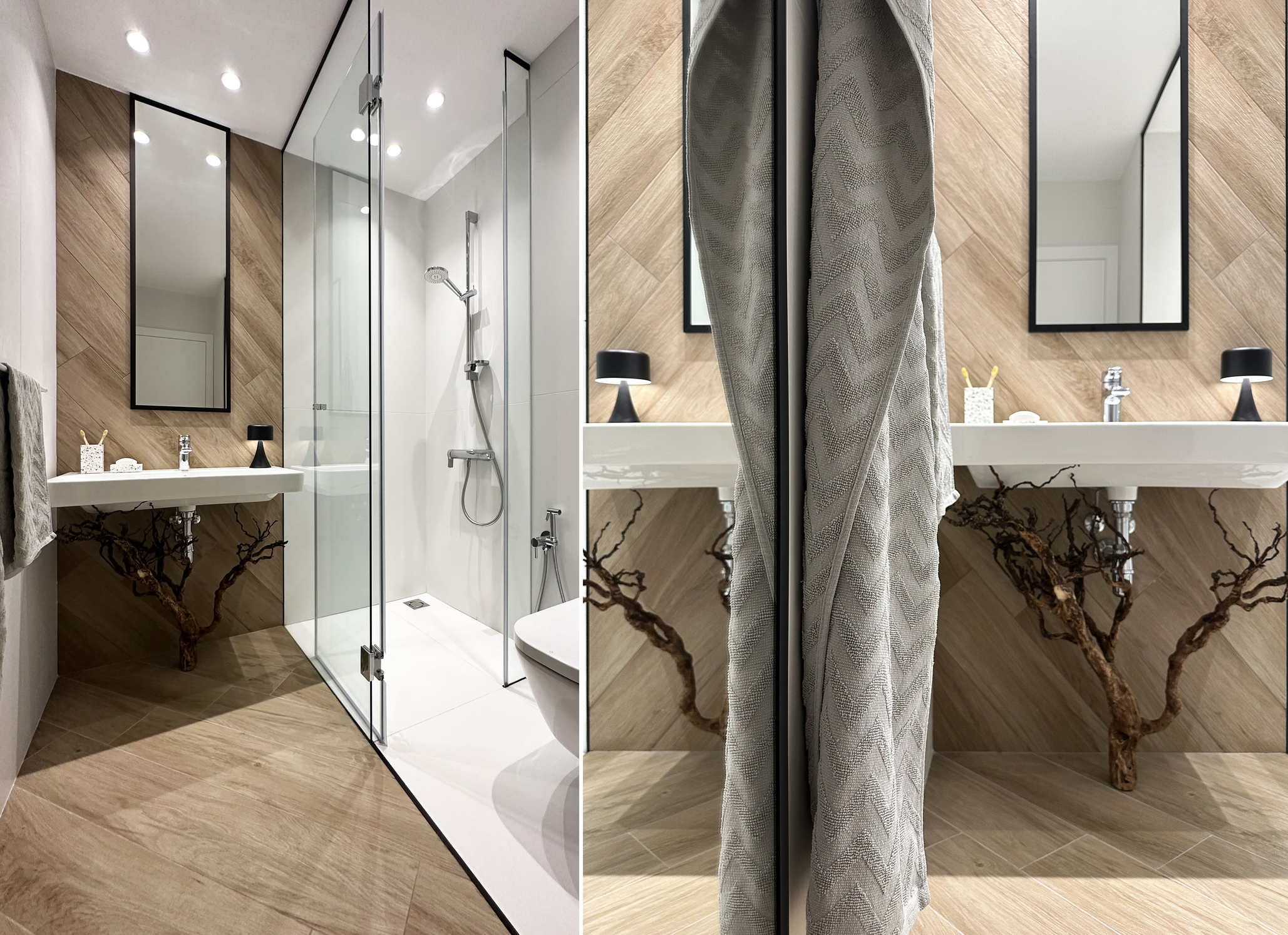 The flooring is wood-effect porcelain tile laid diagonally and extending throughout all rooms. The same material continues onto one of the bathroom walls, which is designed in a minimalist style.