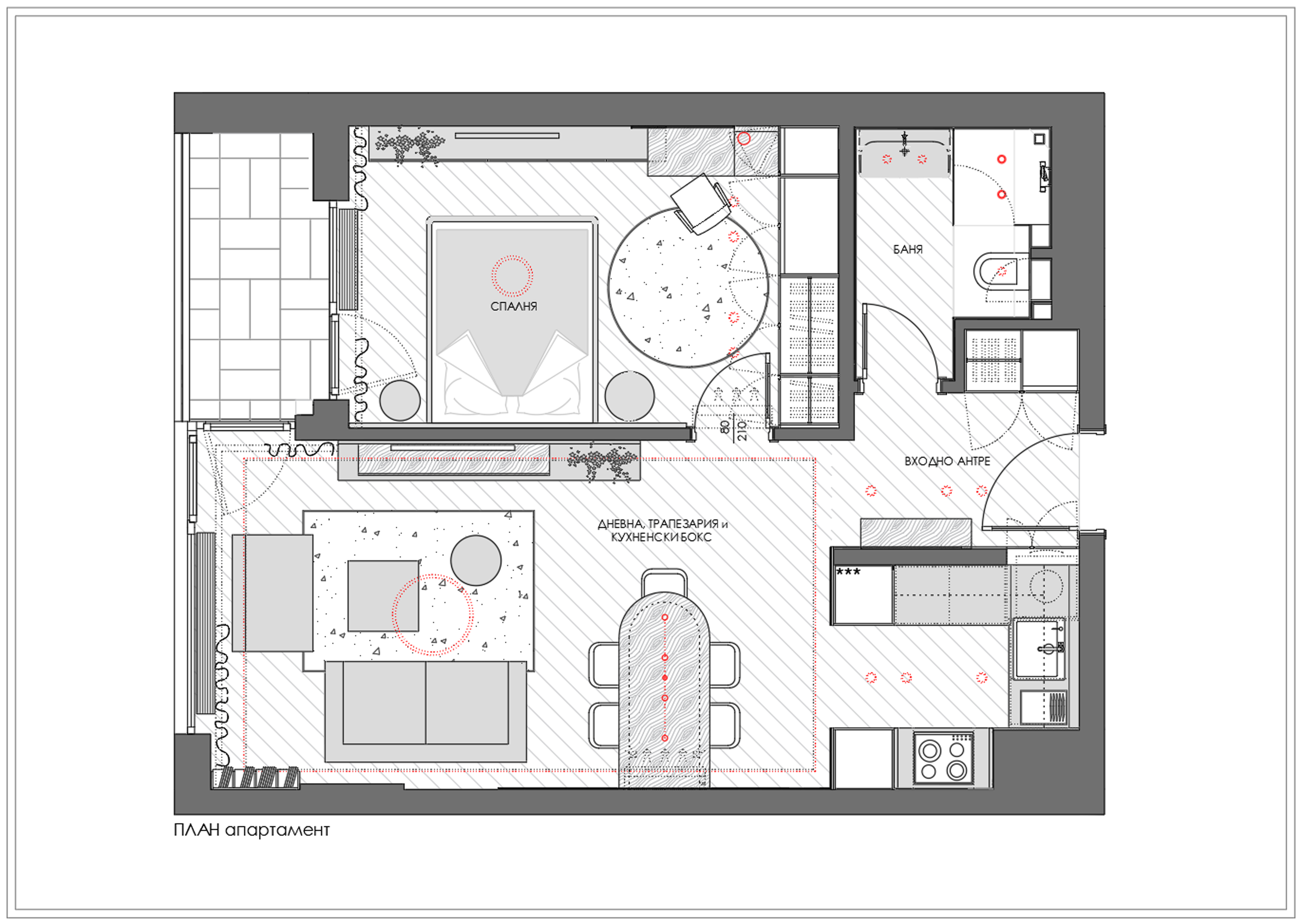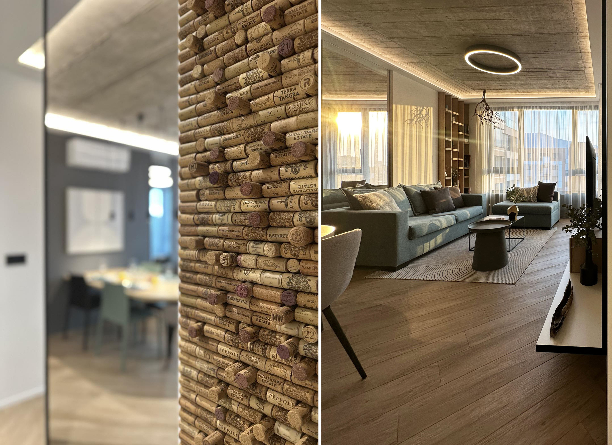 Oригиналното разпределение е преправено с цел обединяване на пространствата и създаване на общ обем на антре, дневна и кухня. С влизането ни посреща корково пано, създадено от над 1000 тапи и комбинирани в един вертикален елемент.