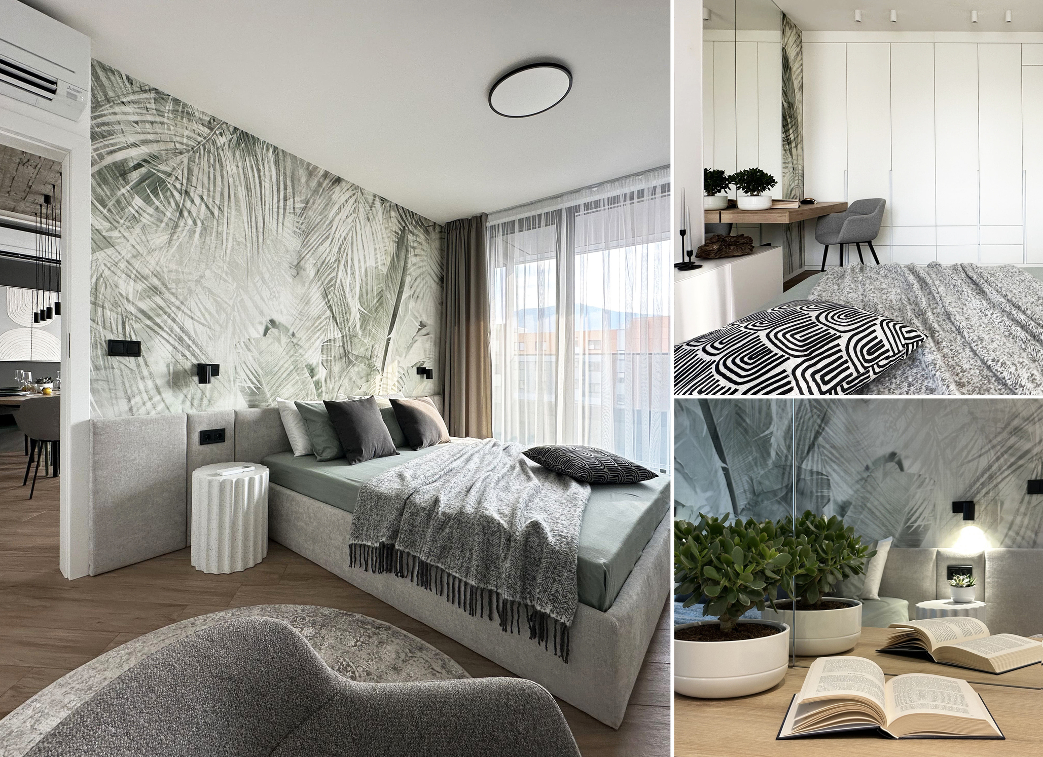 In the bedroom, the main accent is a delicate green leaf-patterned wallpaper that creates a calming, relaxing atmosphere-ideal for rest after a long working day.