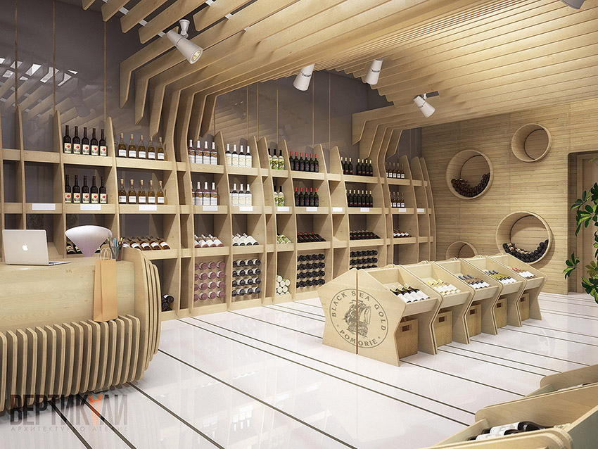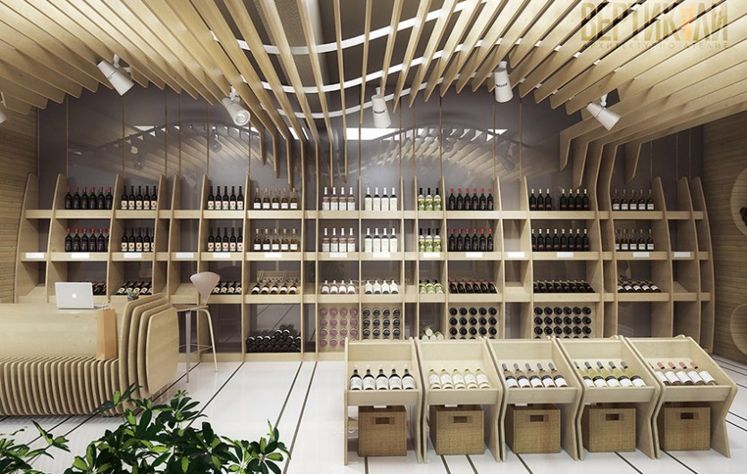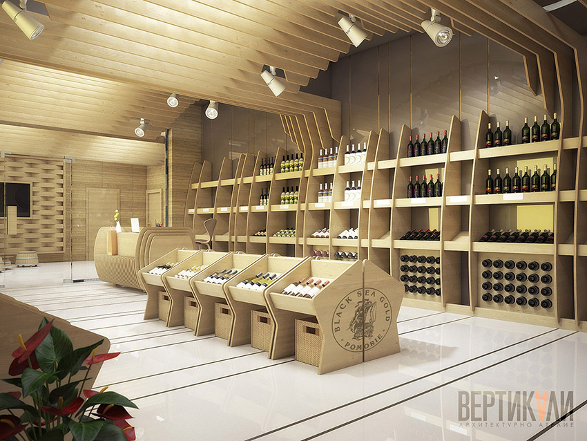 Интериор и екстериор на фирмен магазин за алкохолни напитки и зала дегустация