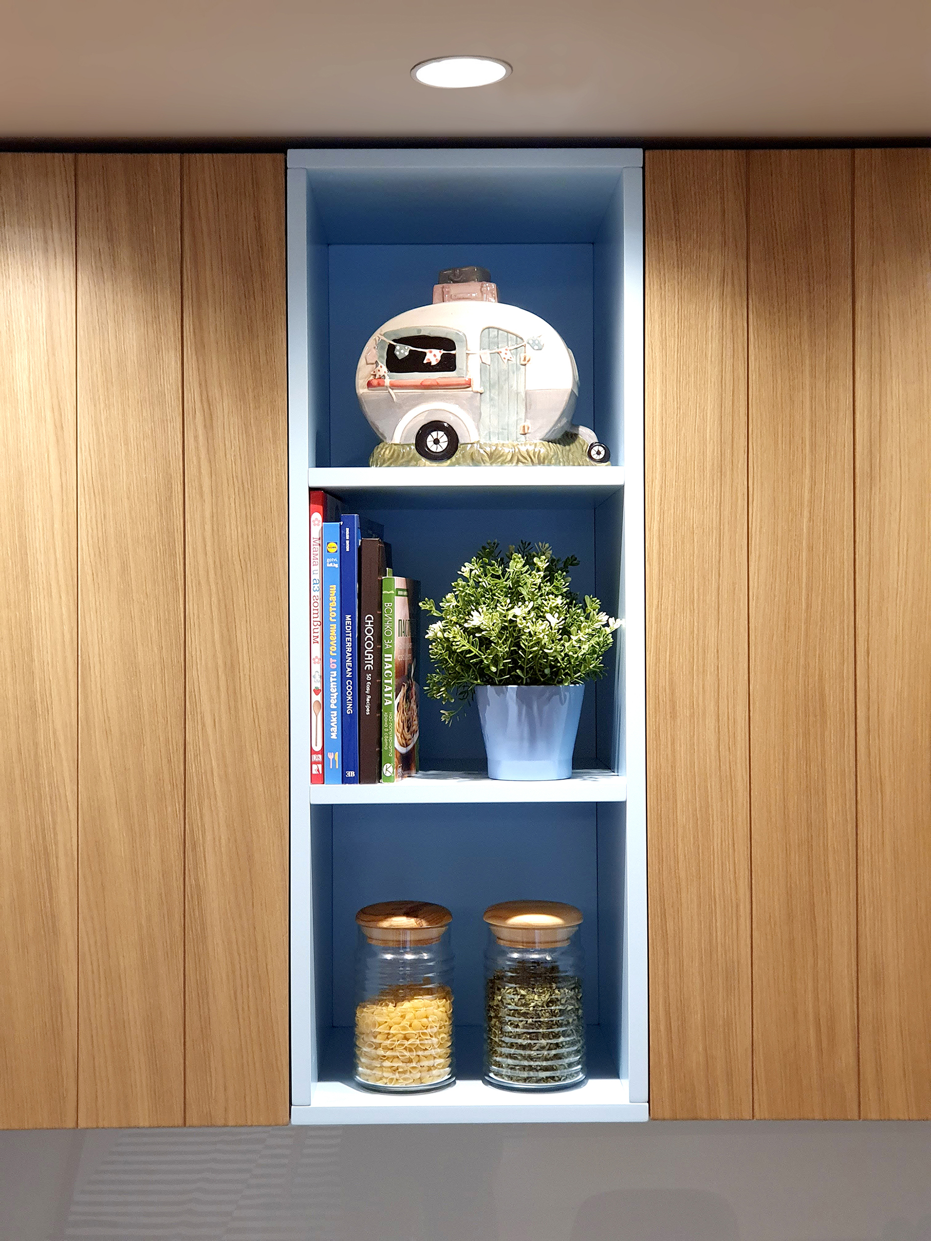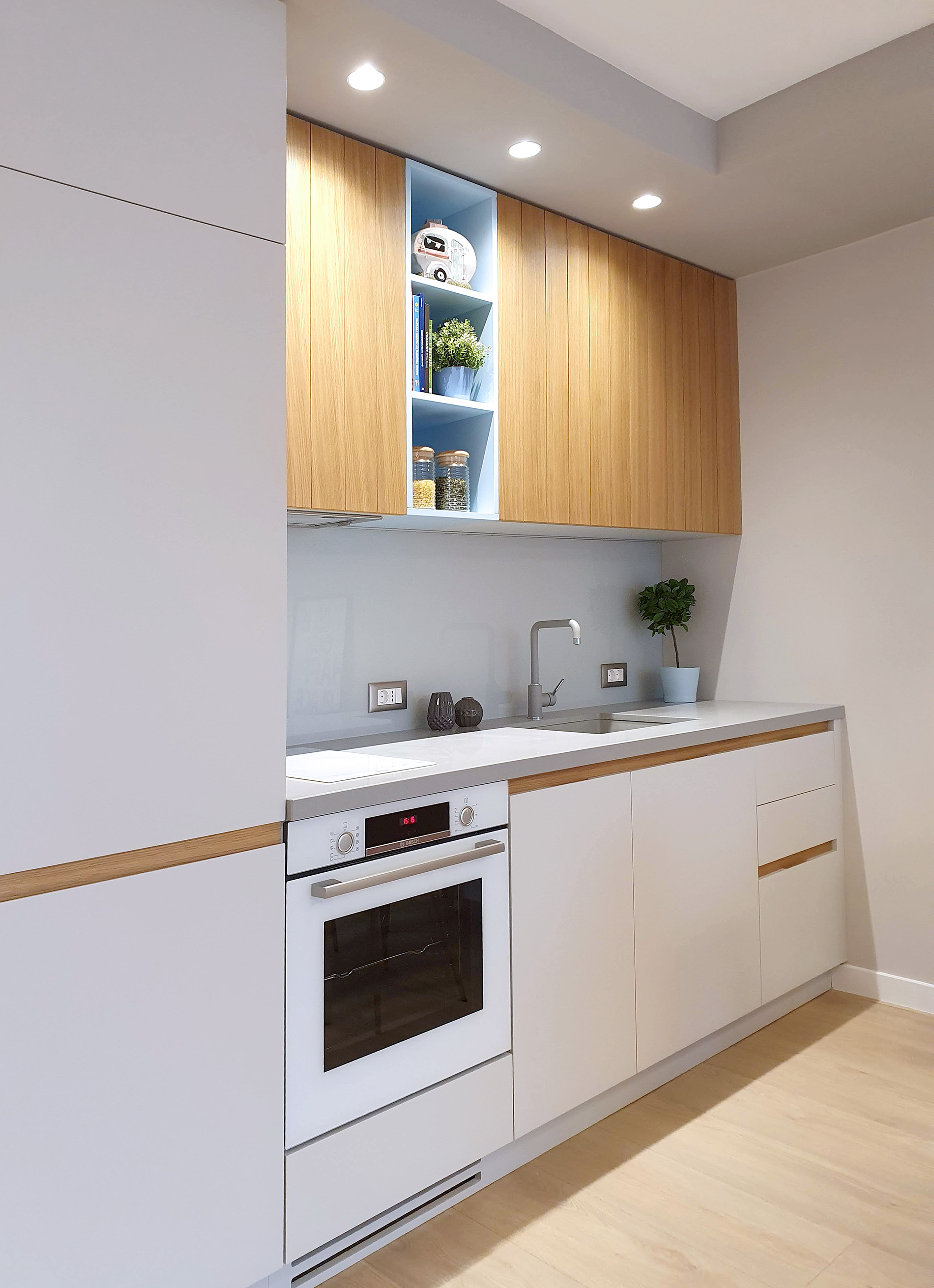 Материалите са съвременни, качествени, и устойчиви на експолатация, но с умерен бюджет - естествен фурнир дъб, МДФ-боя мат, технически камък и стъкло.