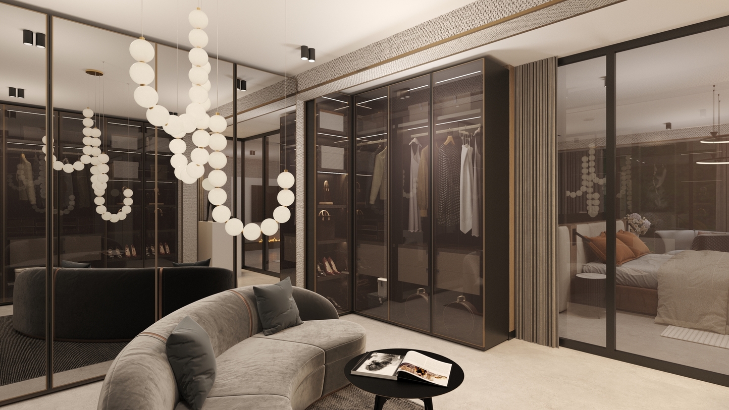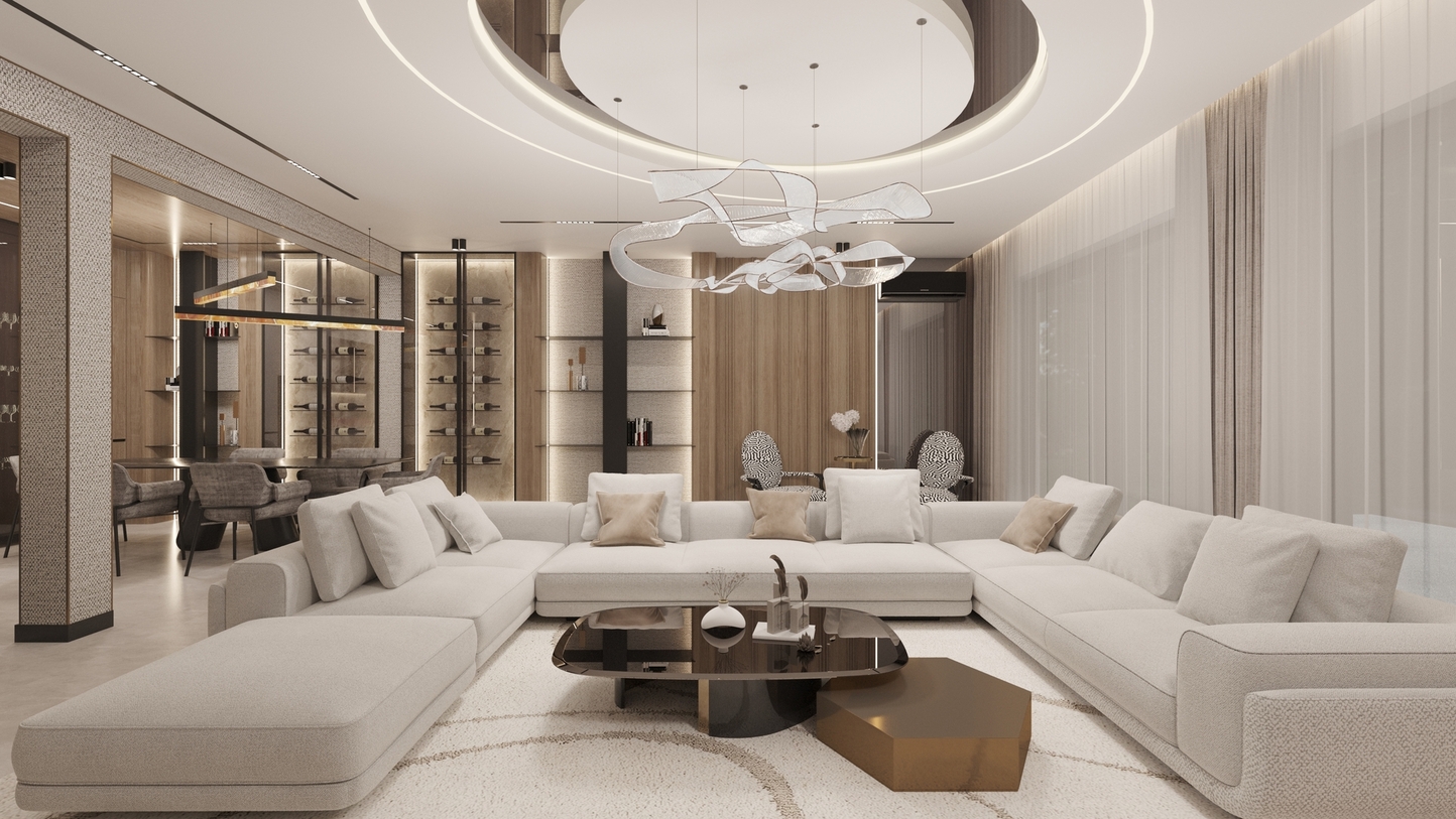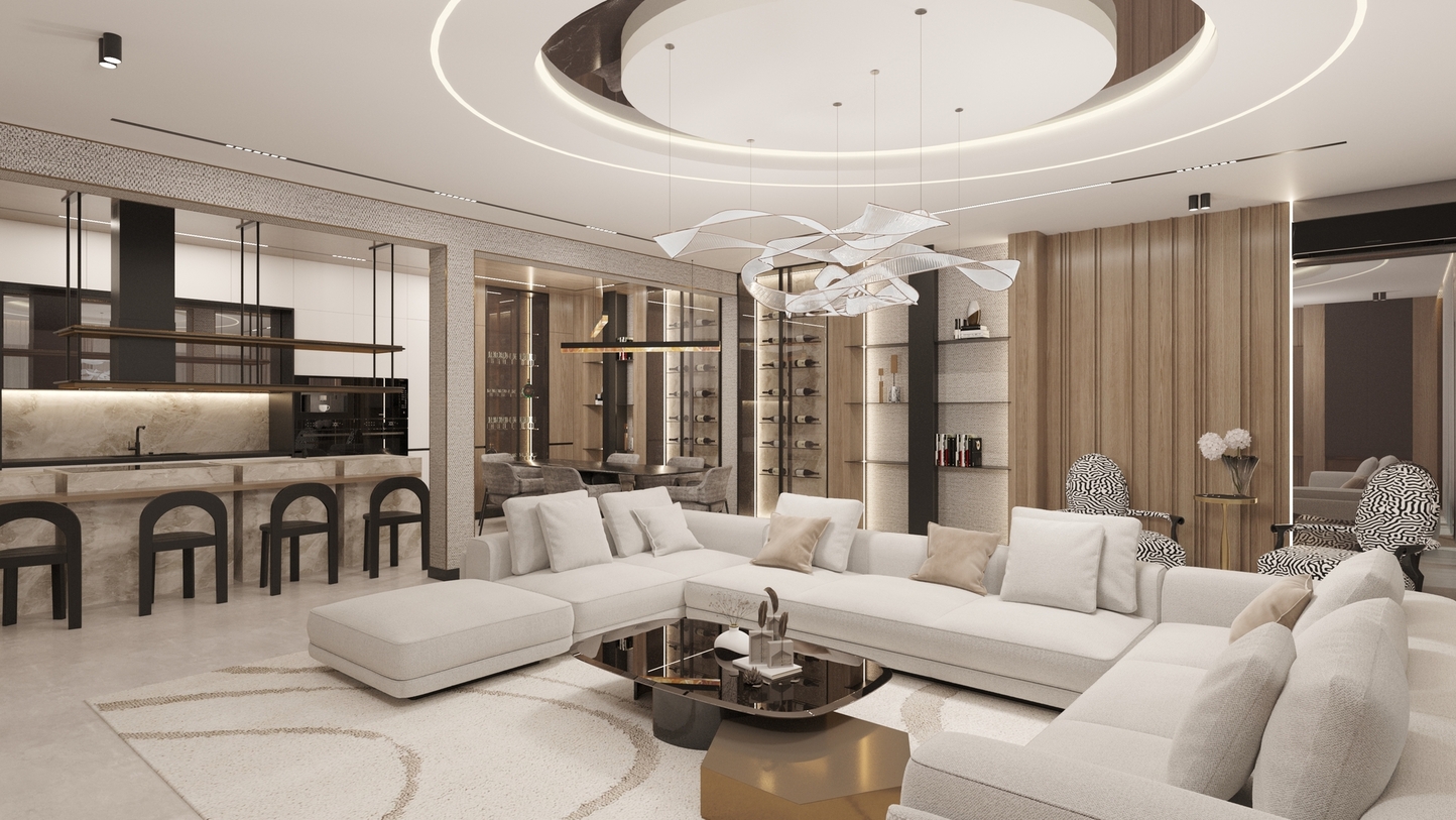 • Architecture of Volumes: The living area is designed with an emphasis on vertical rhythm and ceiling geometry. The use of integrated magnetic track systems and hidden LED lighting defines the space, providing architectural discipline.