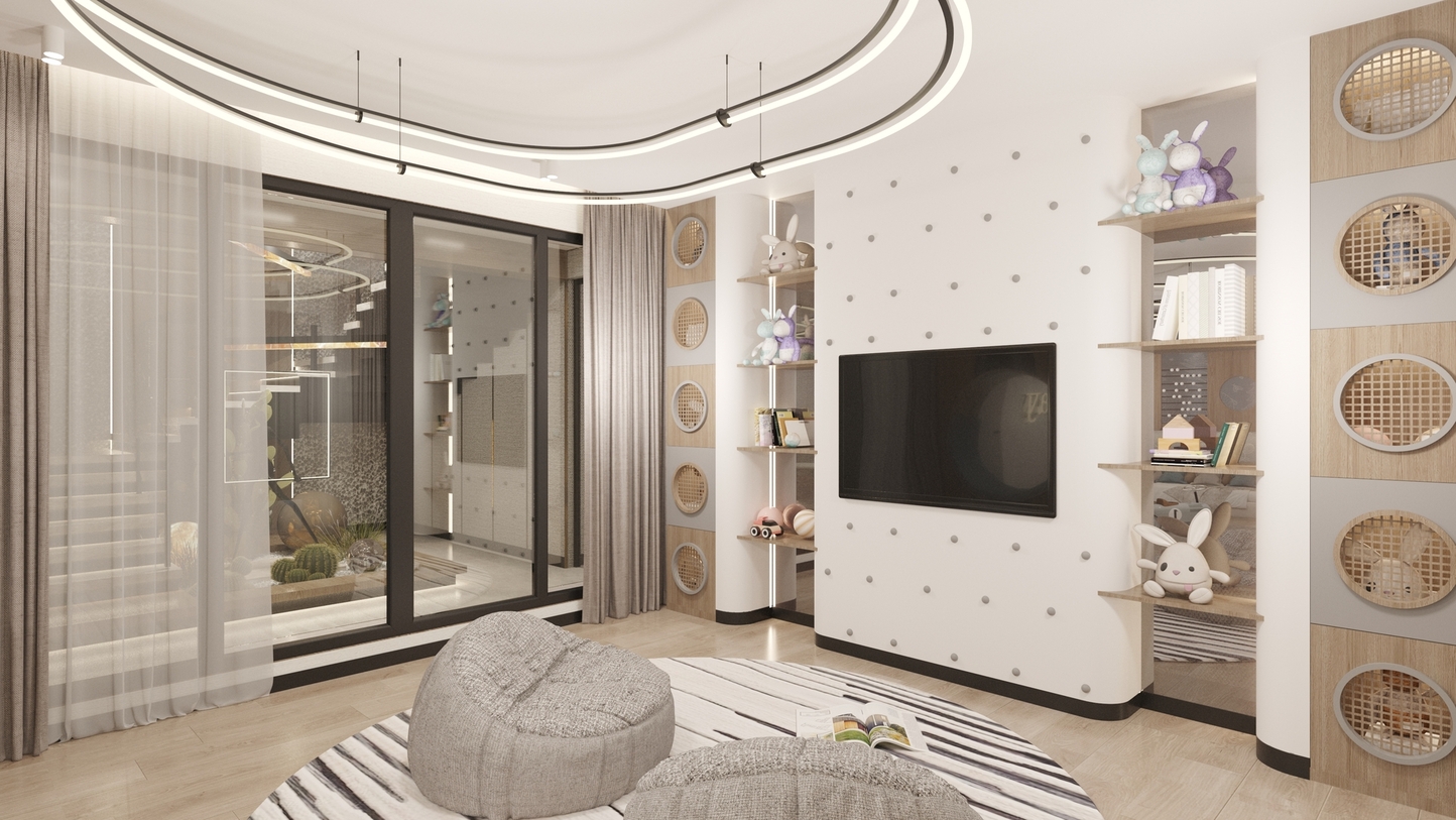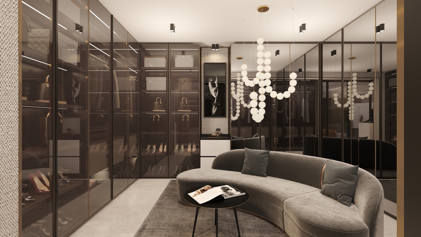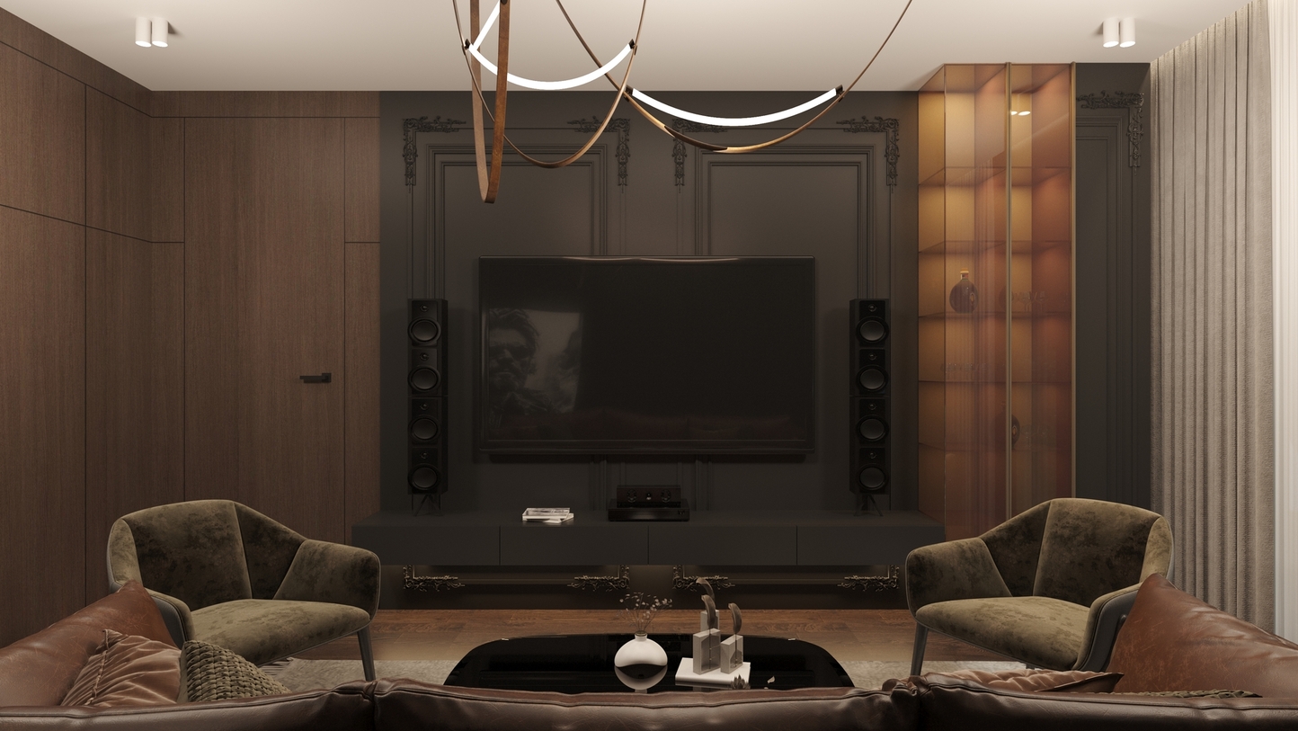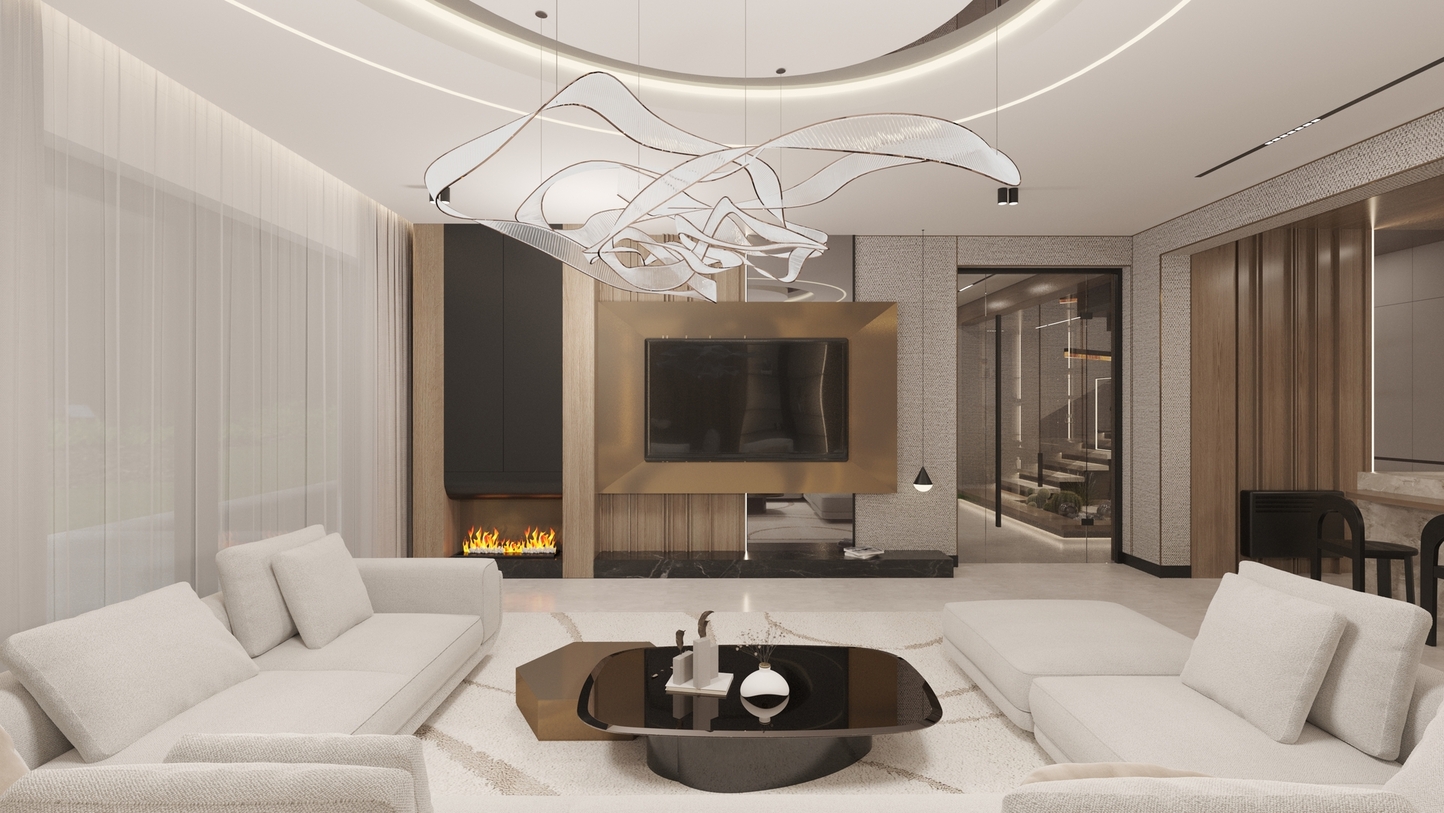 • Architecture of Volumes: The living area is designed with an emphasis on vertical rhythm and ceiling geometry. The use of integrated magnetic track systems and hidden LED lighting defines the space, providing architectural discipline.