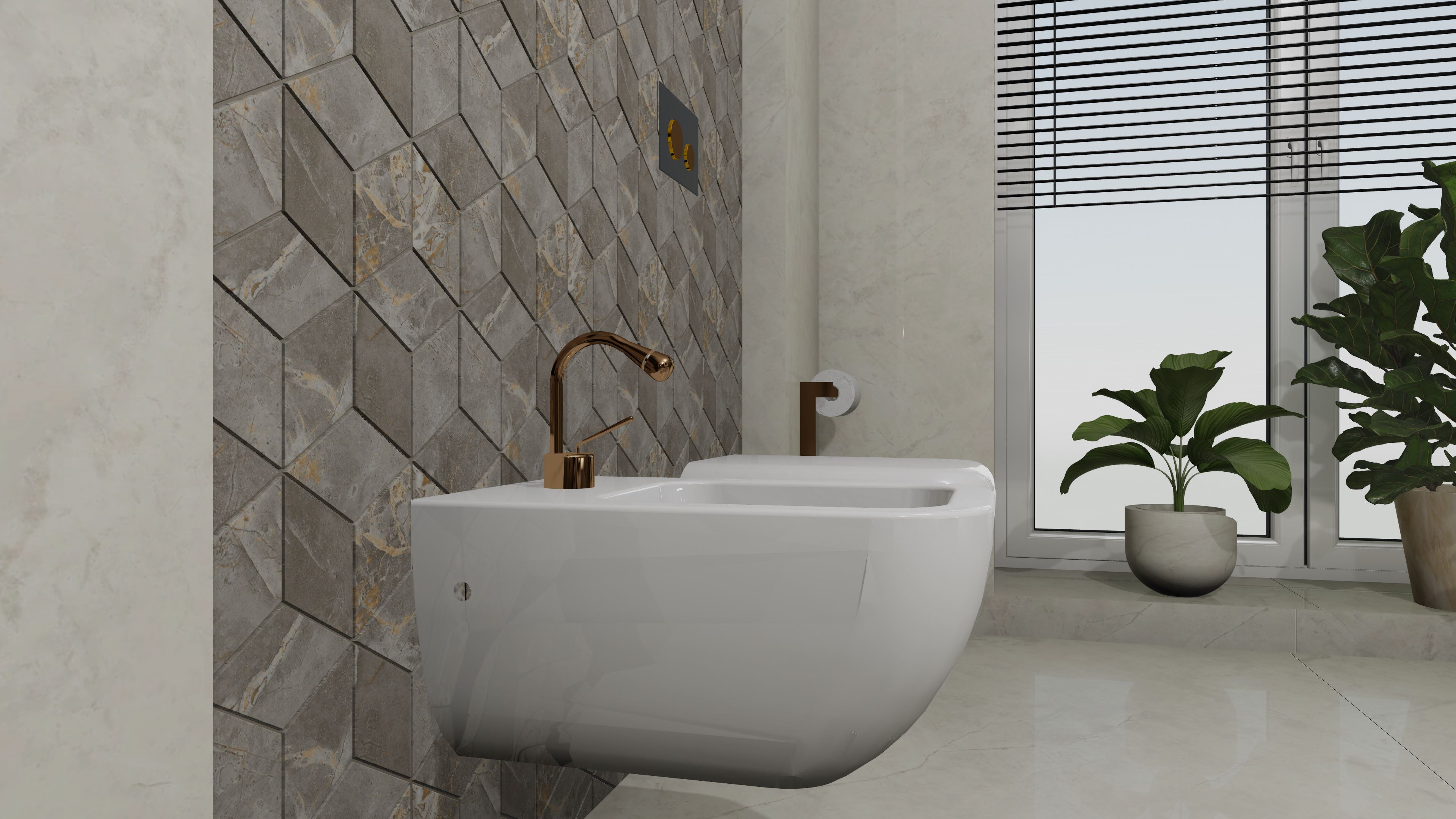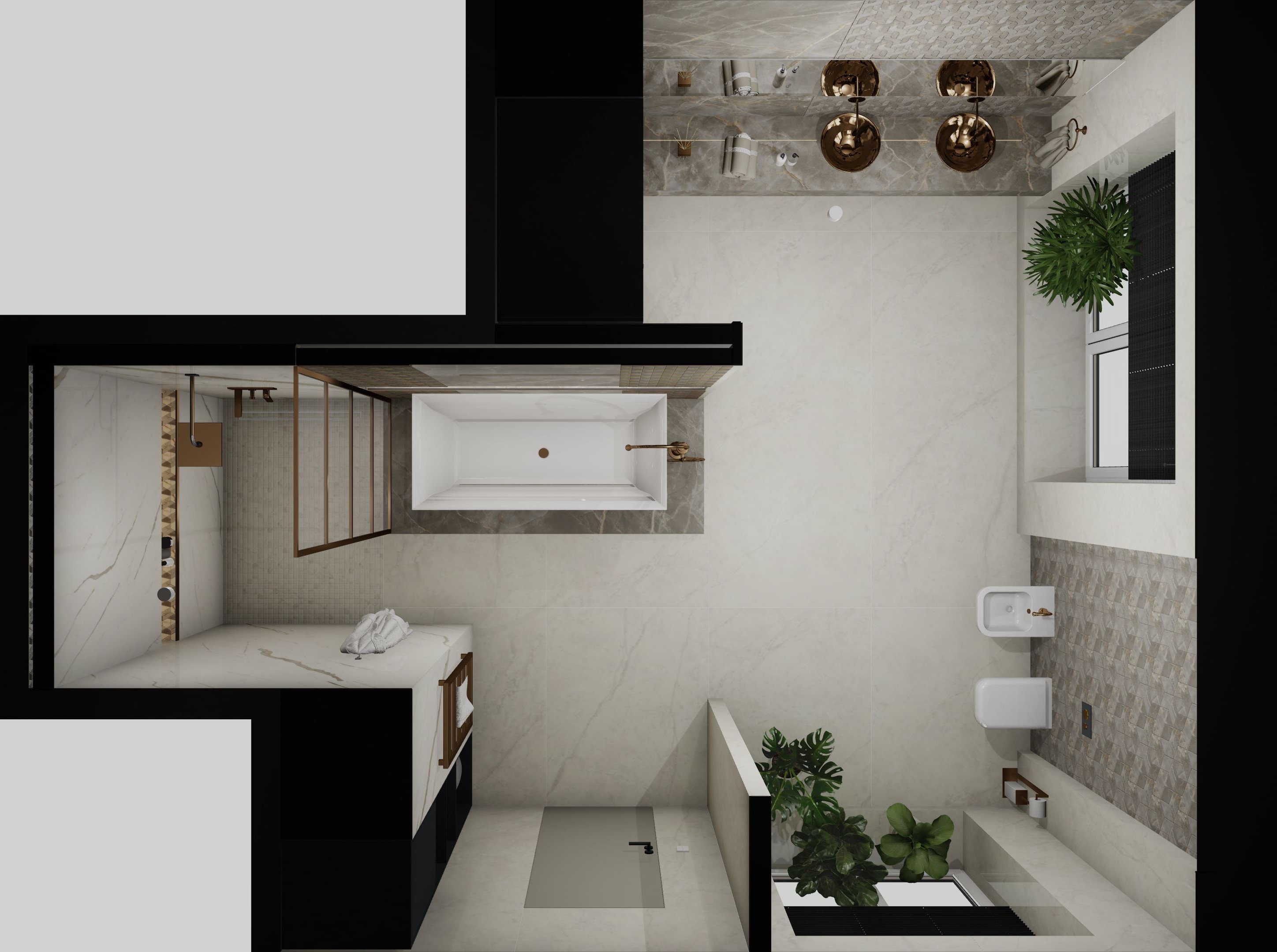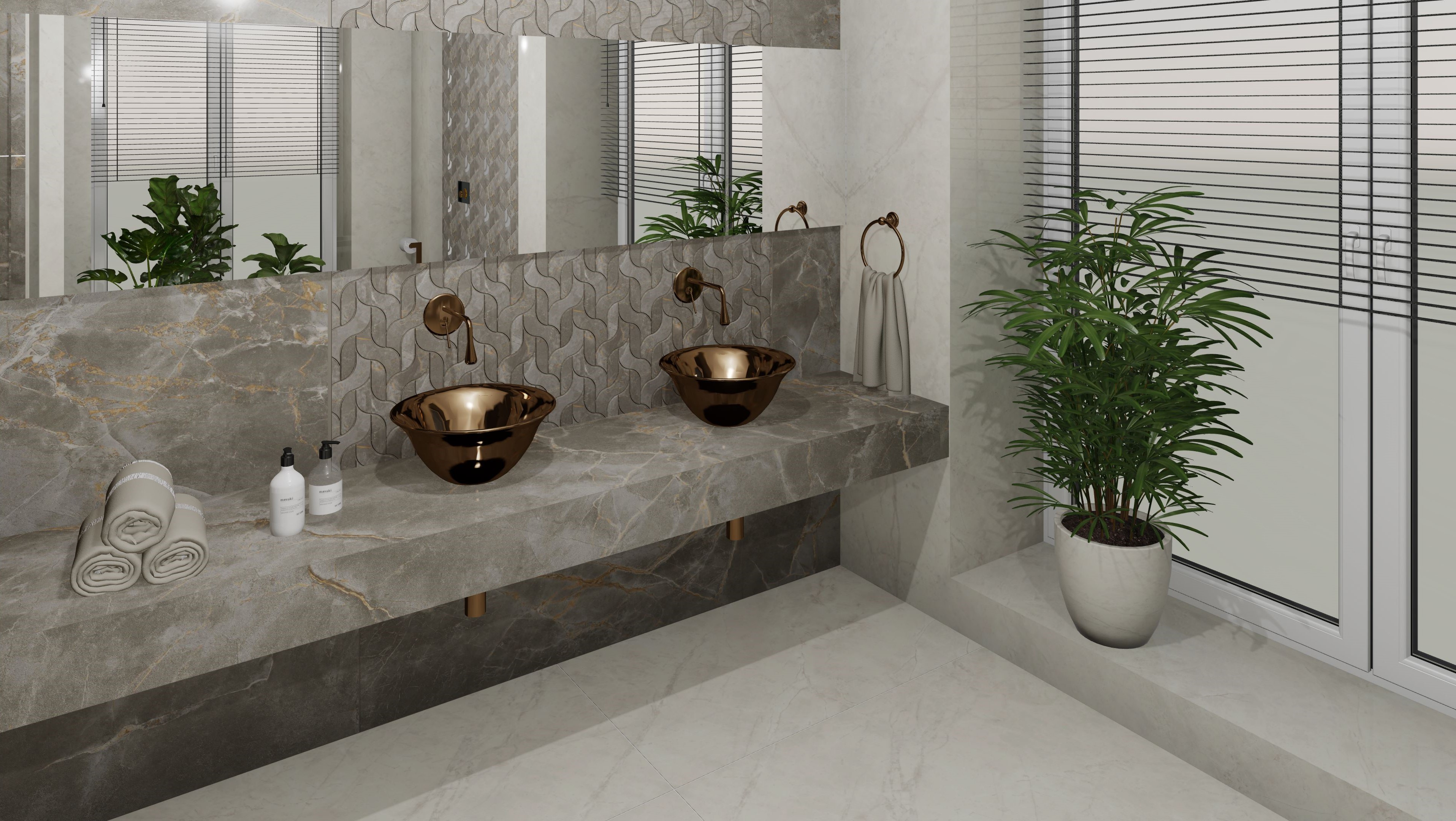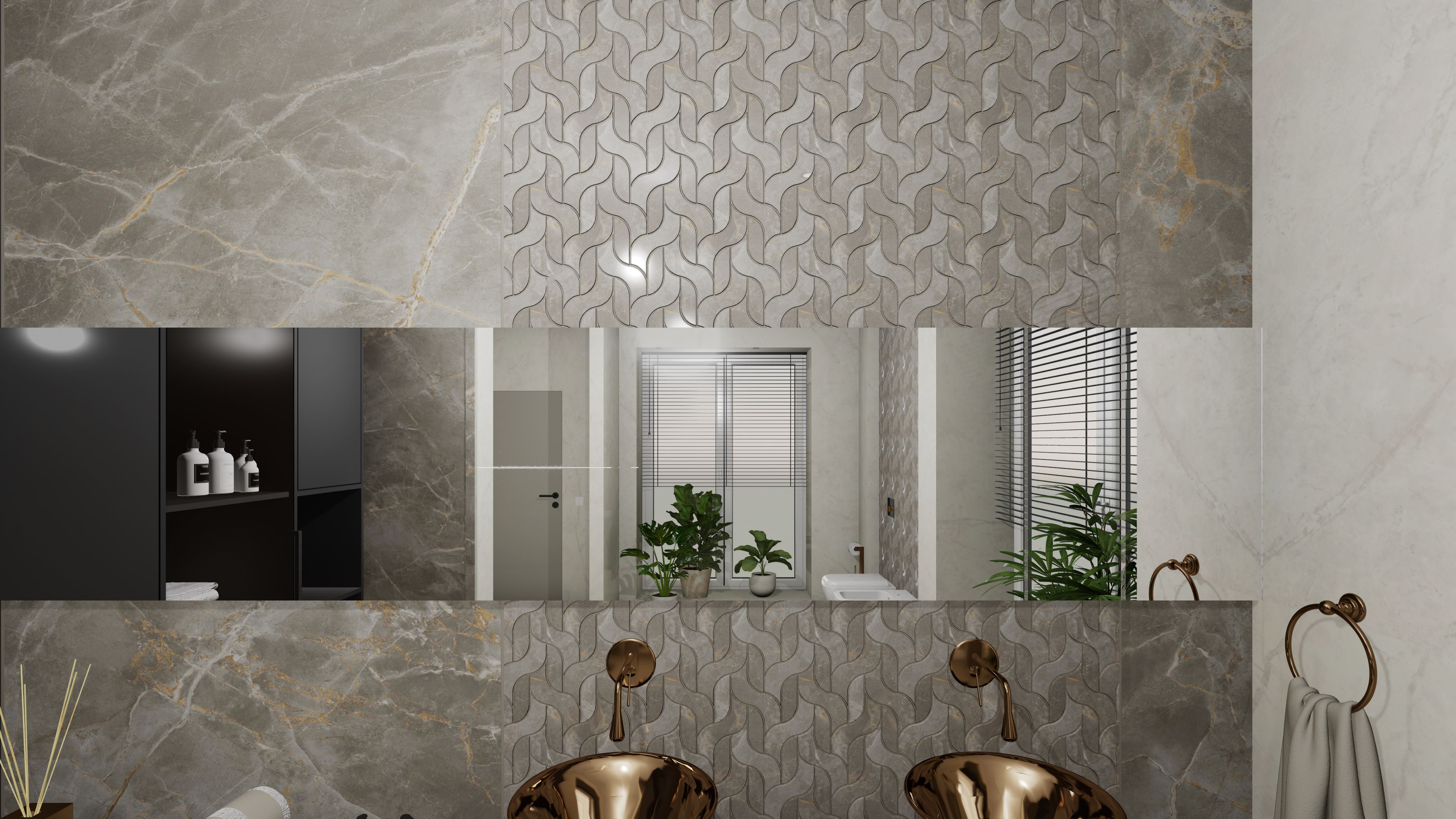Този проект представлява пълна 3D визуализация на модерна баня, използваща реални материали от производители.Проектирах пространството с плочки с голям формат. Визуализацията следва точни размери, реални продукти и професионални стандарти за интериорен дизайн.