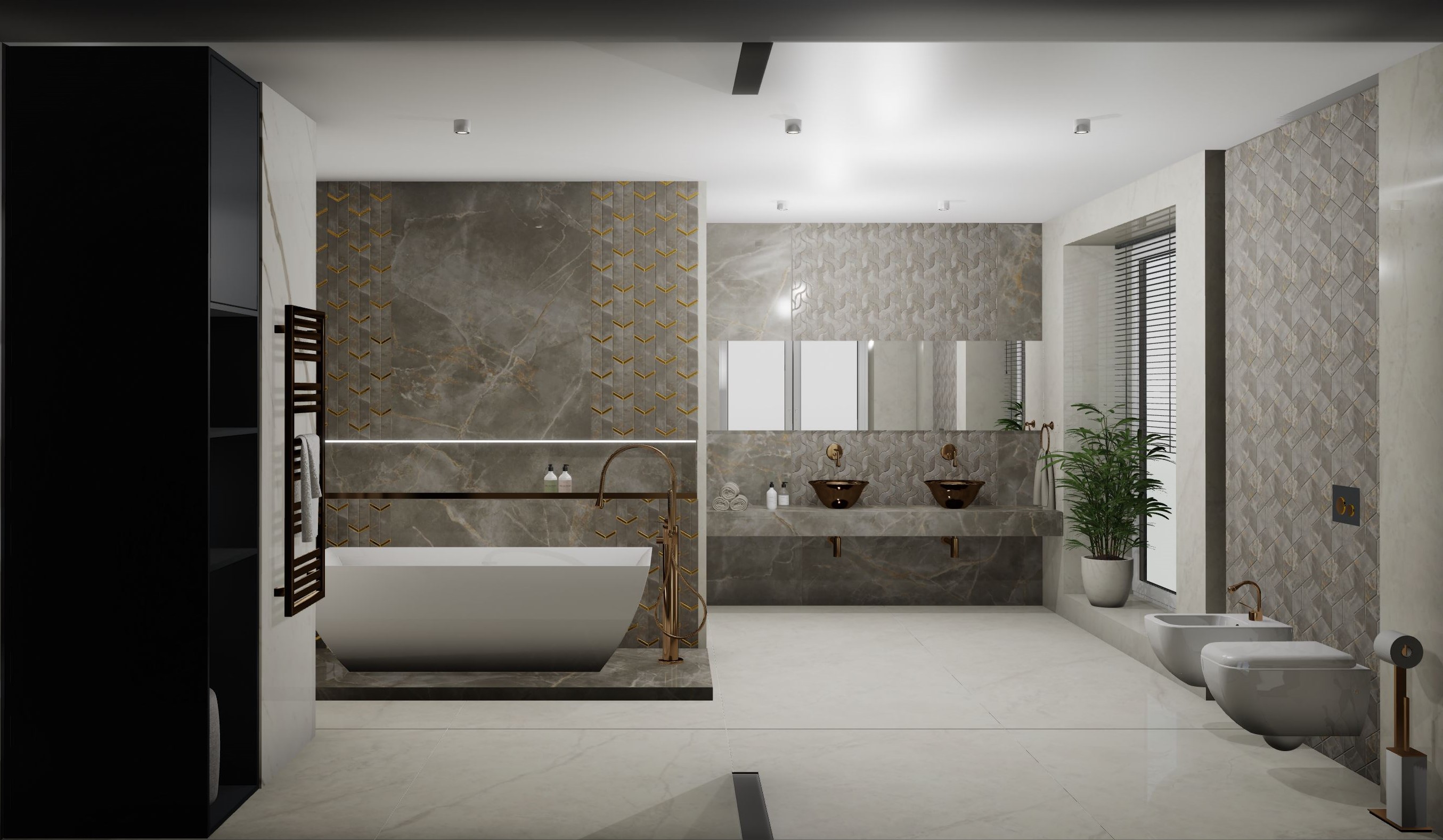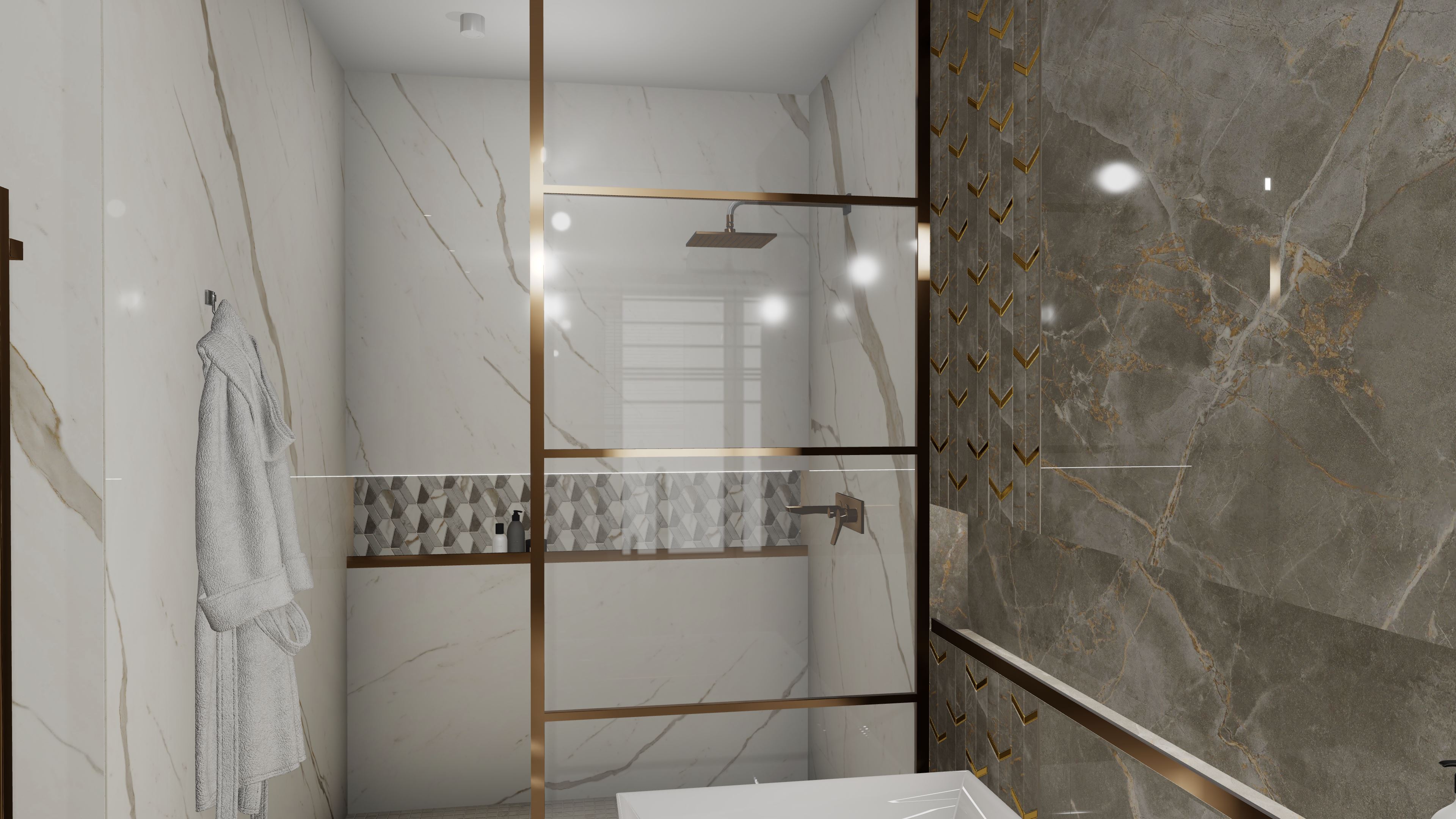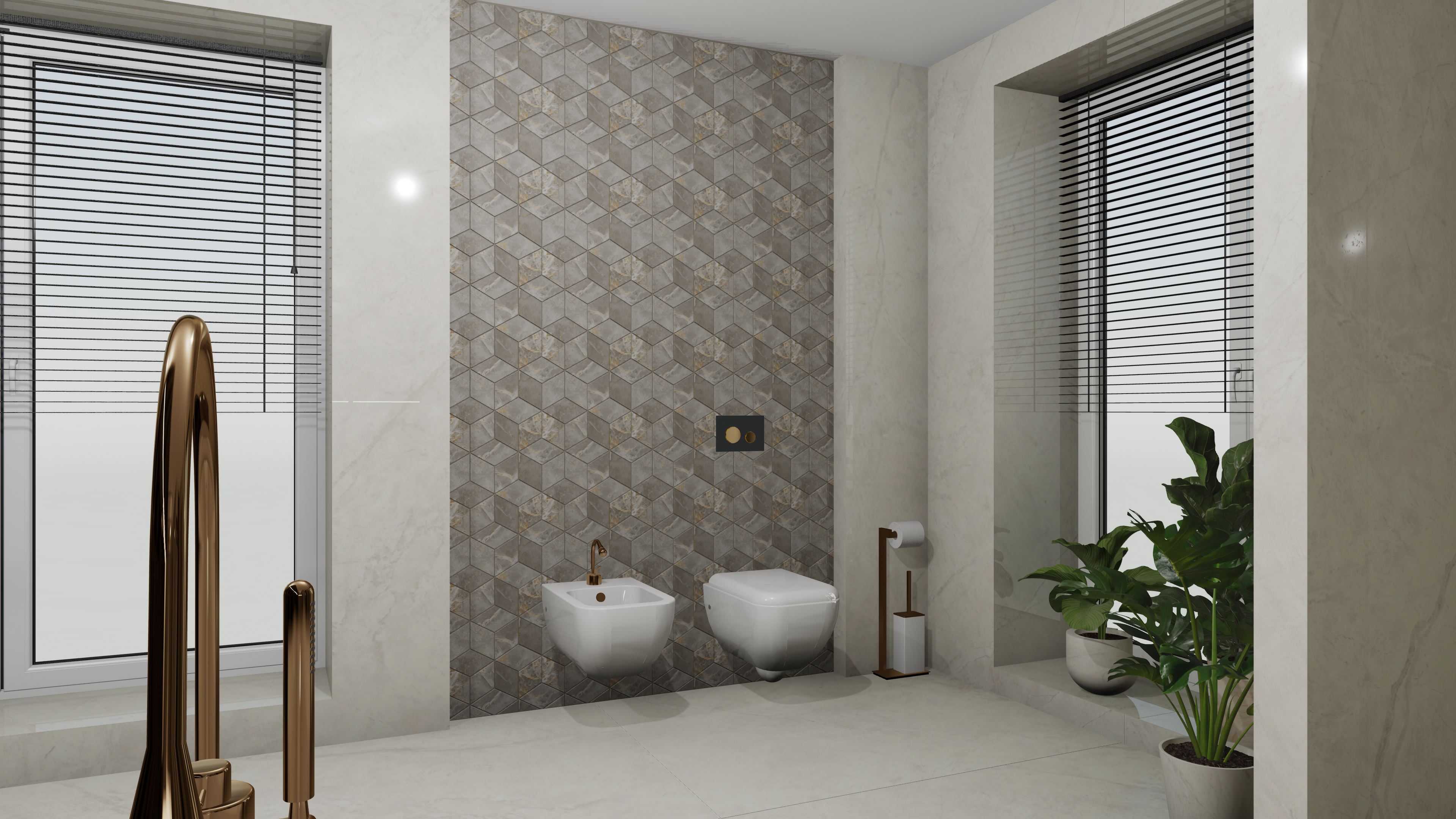 Този проект представлява пълна 3D визуализация на модерна баня, използваща реални материали от производители.Проектирах пространството с плочки с голям формат. Визуализацията следва точни размери, реални продукти и професионални стандарти за интериорен дизайн.