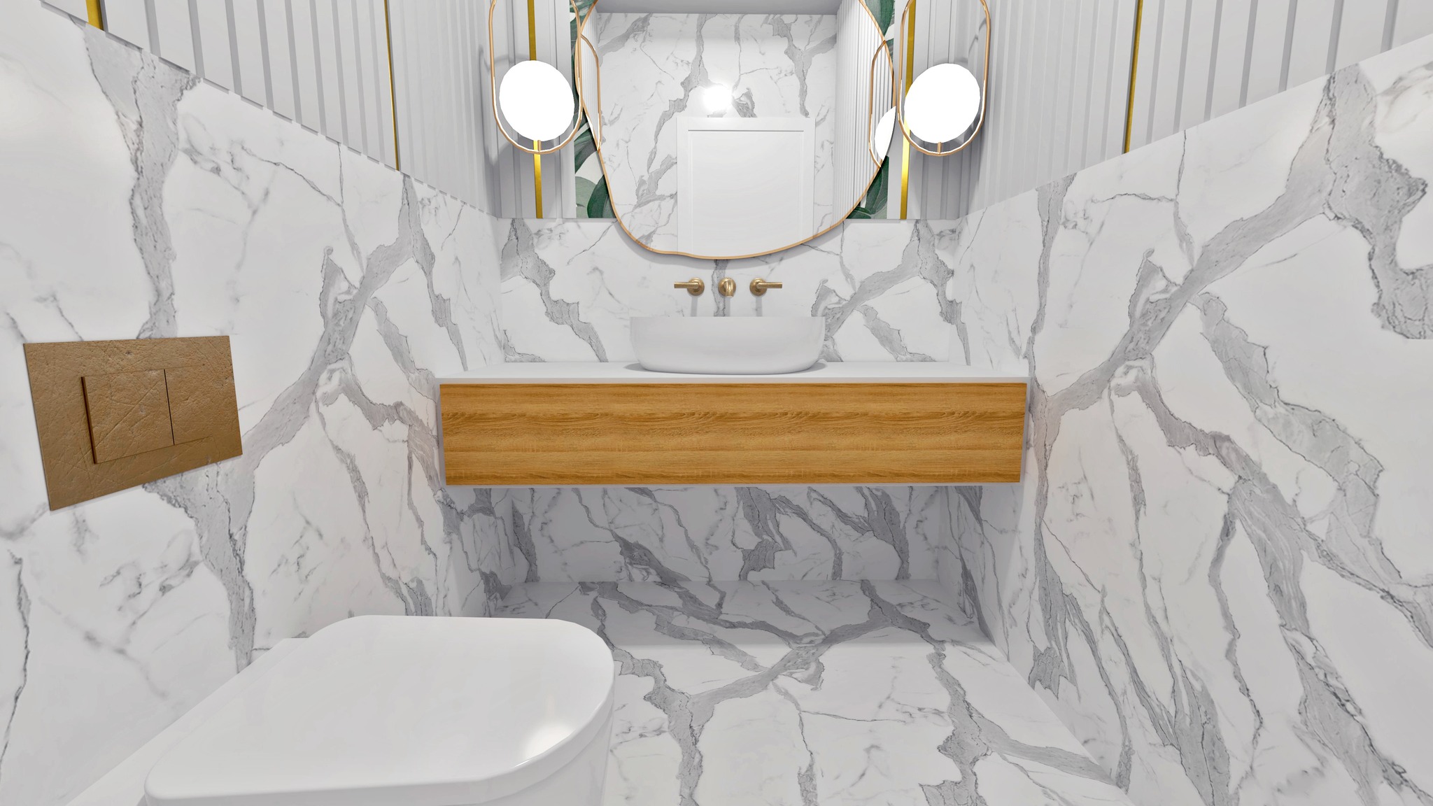 Банята за родителите е решена в технически камък, златни смесители и душ за вграждане. Разполага със свободно стояща вана и широка душ-кабина, облепена в травертинови мозаечни плочки в бяло.