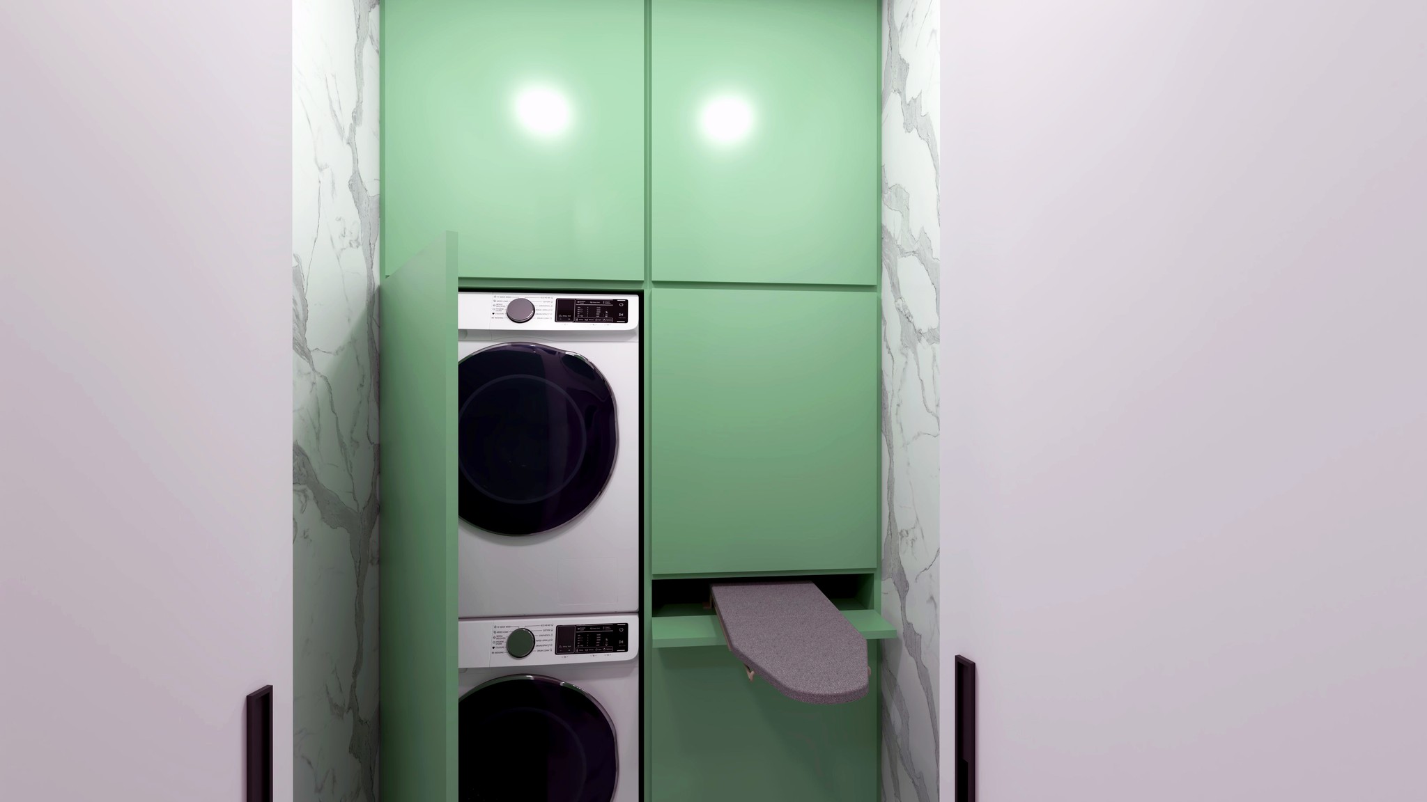 Вратите към стаите са широки 90см, а тези към мокрите помещения са по-широки от обикновено - 80 см, за да бъдат съразмерни с големината на цялото жилище. Вратите на пералното помещение са чупещи, за да бъдат по-ефектни и ергономични. В него са поместени перална и сушилня във висока корпусна мебел, събираща нужния багаж и препарати. Вградена е и прибираща се дъска за гладене.
